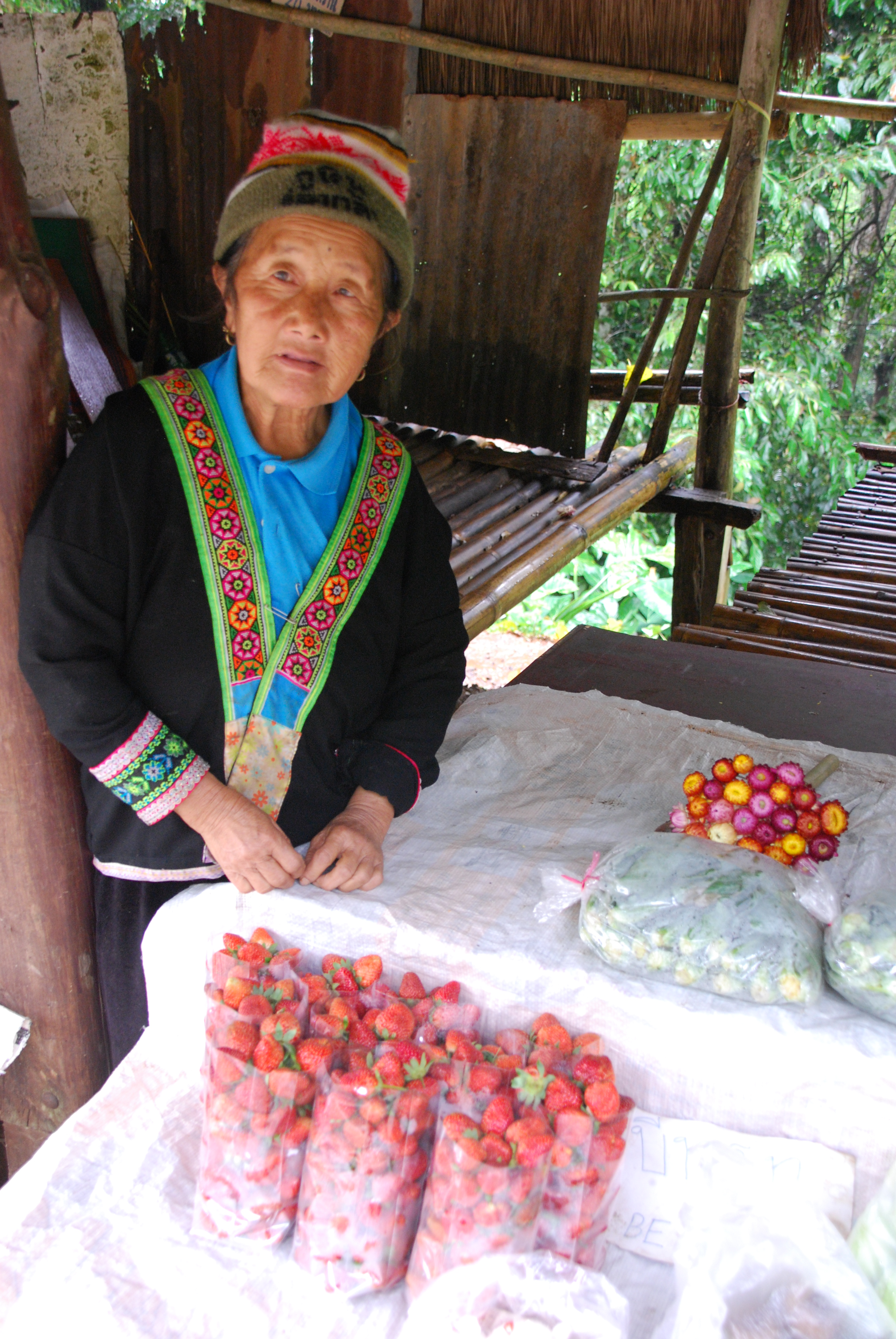 A local woman from the Hmong hill tribe selling strawberries on the side of the road
