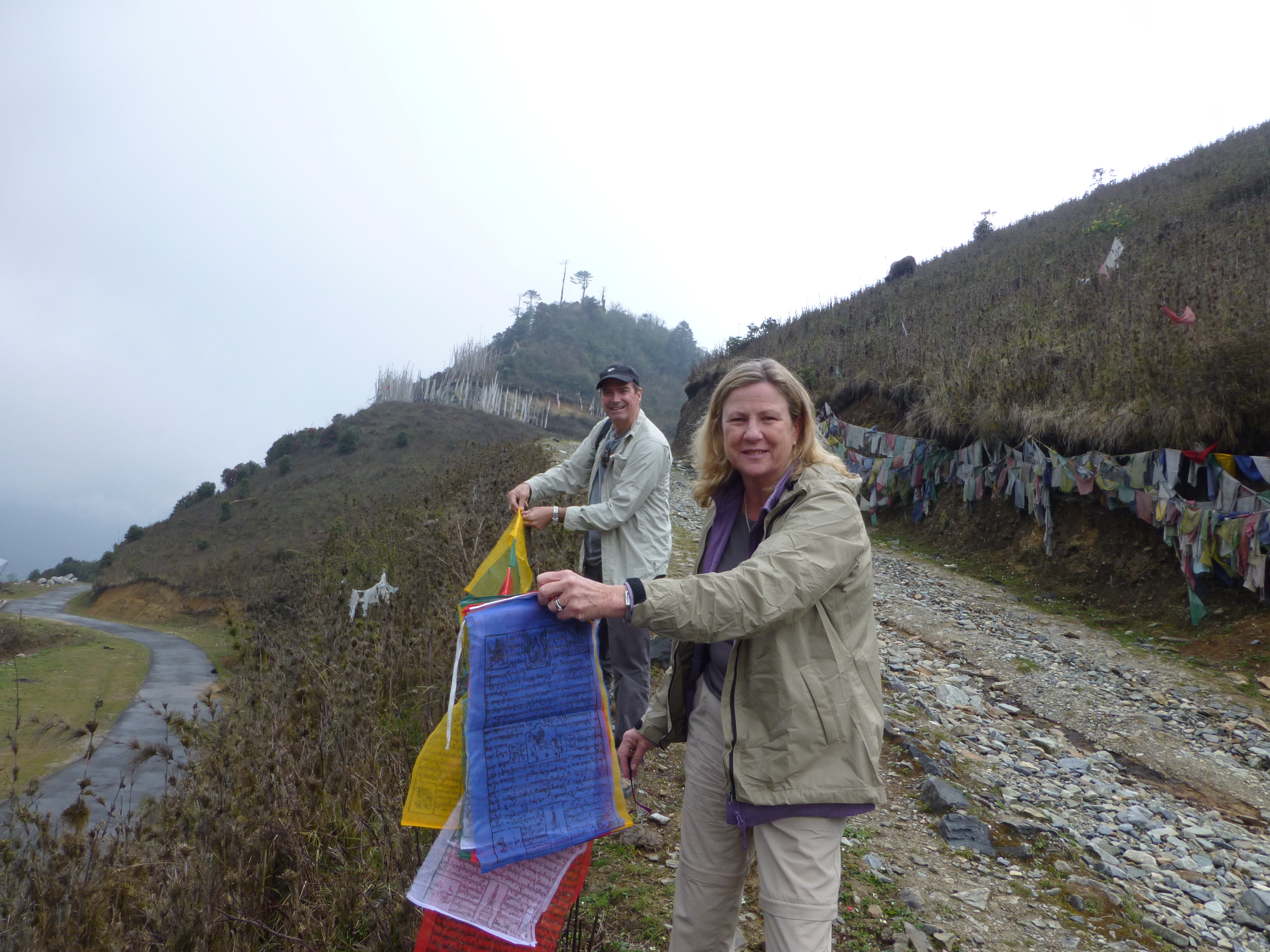 Hanging our prayer flag on Pele La Pass at 3,400 metres – praying for good health and safe travels