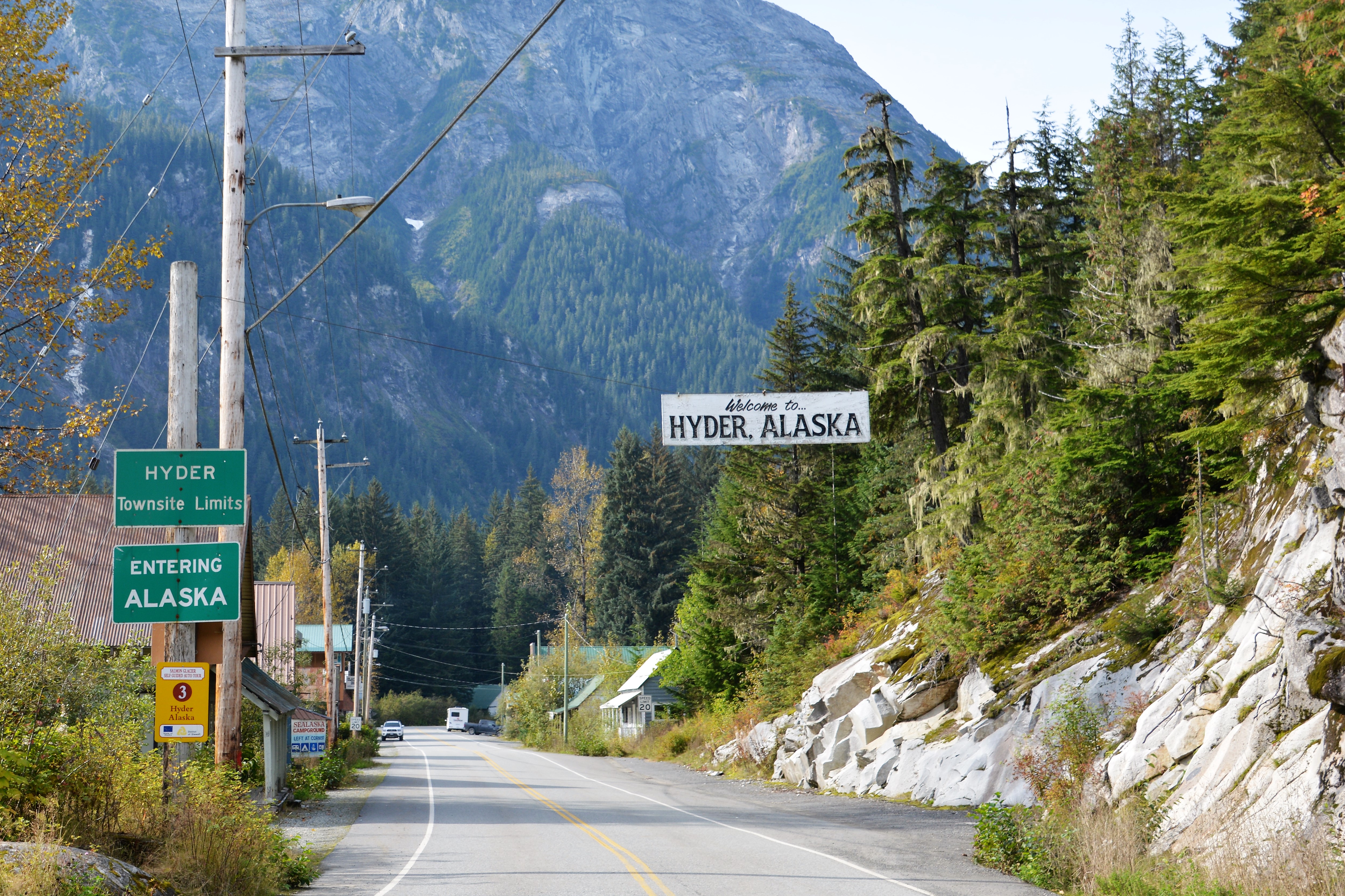 We’ve given up trying to figure out why the borders between these countries were drawn as they were, and the official explanation sounds like gobbledygook, but suffice to say that communities like Haines, Skagway and Hyder are cut off from the rest of Alaska and one must drive through long stretches of Canada to get to them.