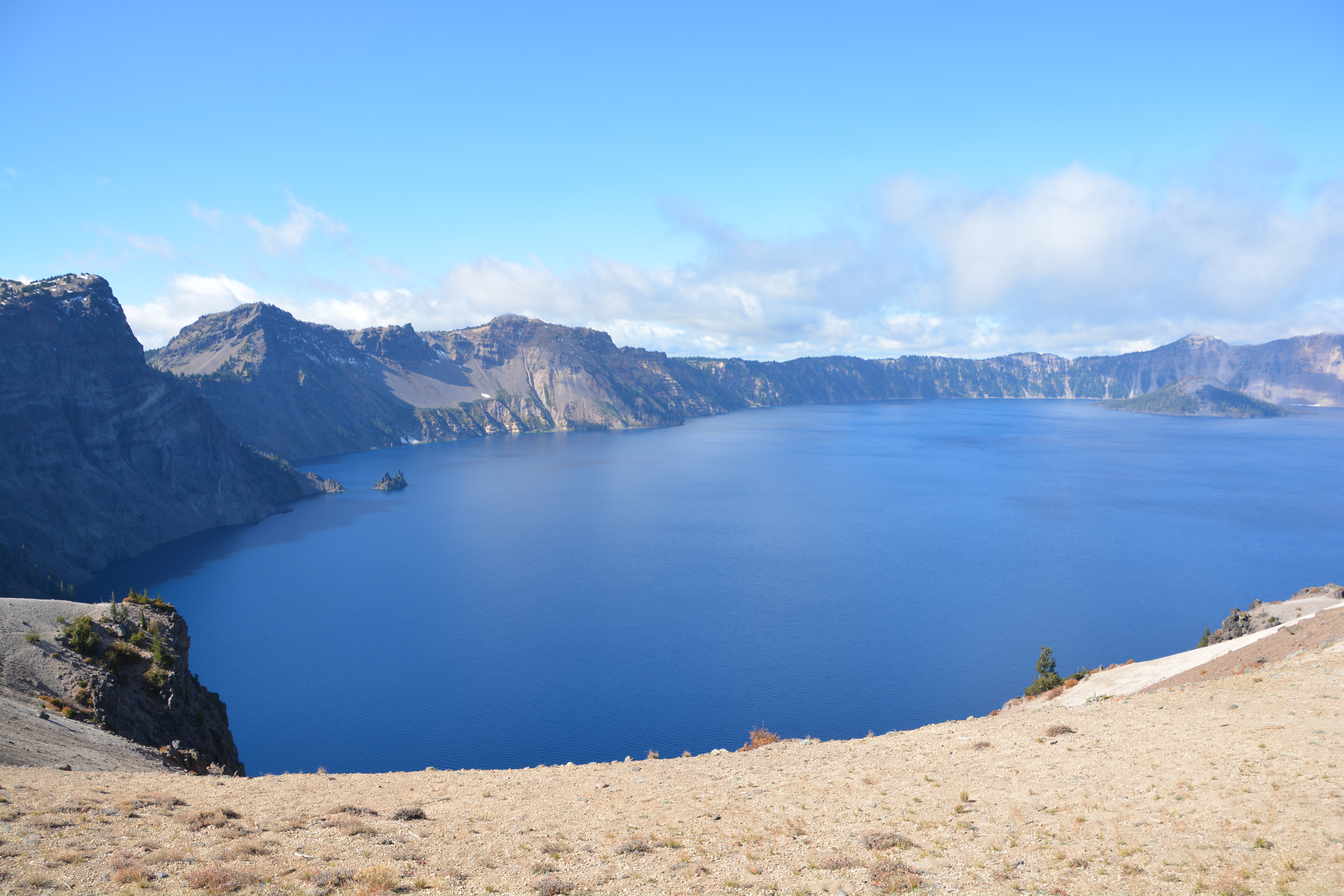 But the cool thing about this volcano is that while the mountain lost thousands of feet in elevation it also formed a huge empty inner cup, called a caldera, that over the next couple of centuries filled with rain and snow melt. This perfect blue water, which at times reaches an astounding depth of 2,000 feet, has no escape route but keeps a constant level through evaporation and seepage. It is a geologic wonder.