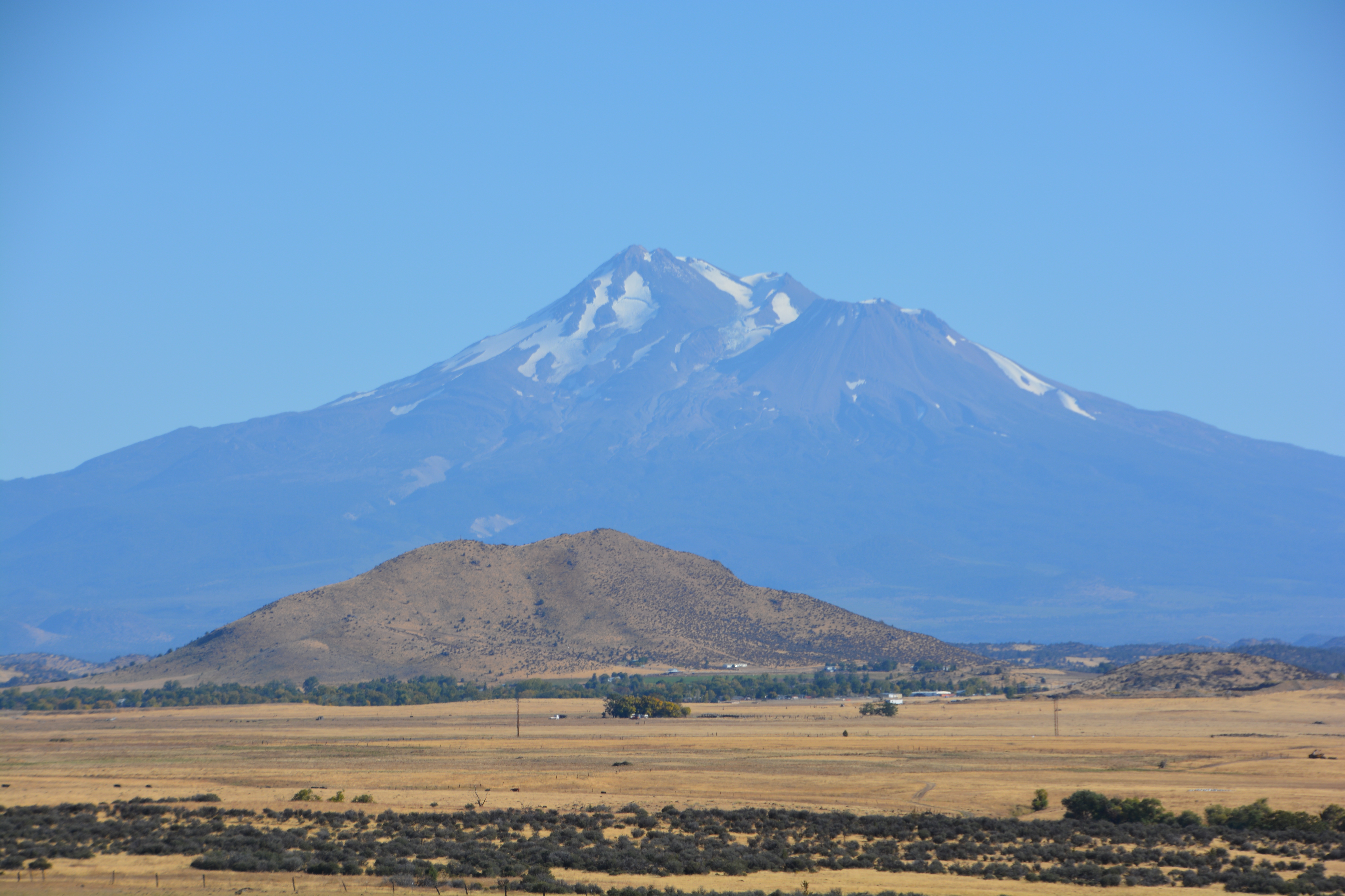 Mt. Shasta, another of the great volcanoes in the Cascade Range, looms up from the flat plains in northern California