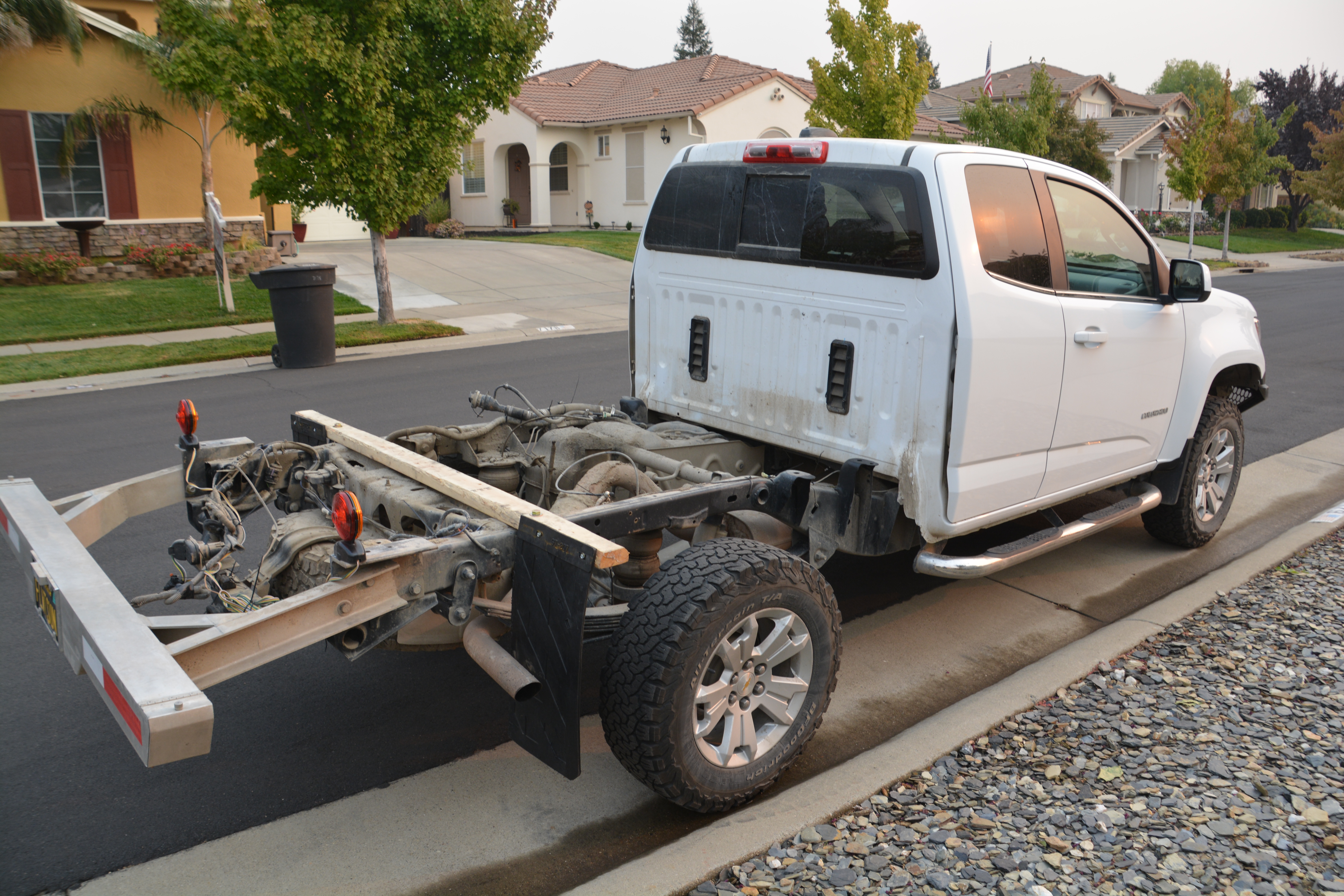 In the early morning orange glow from the fires in Northern California our mighty Colorado rests after having the camper and tray removed