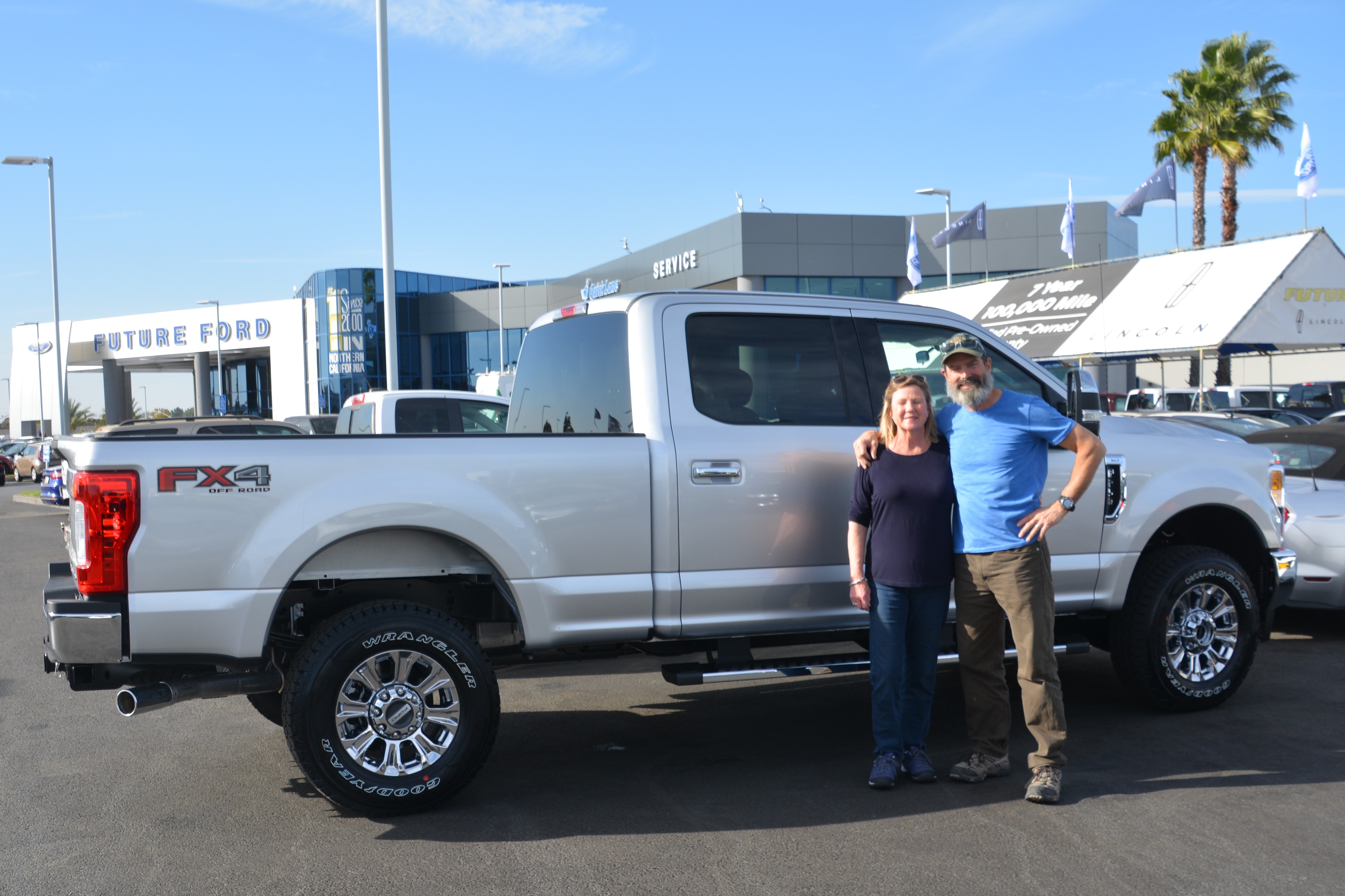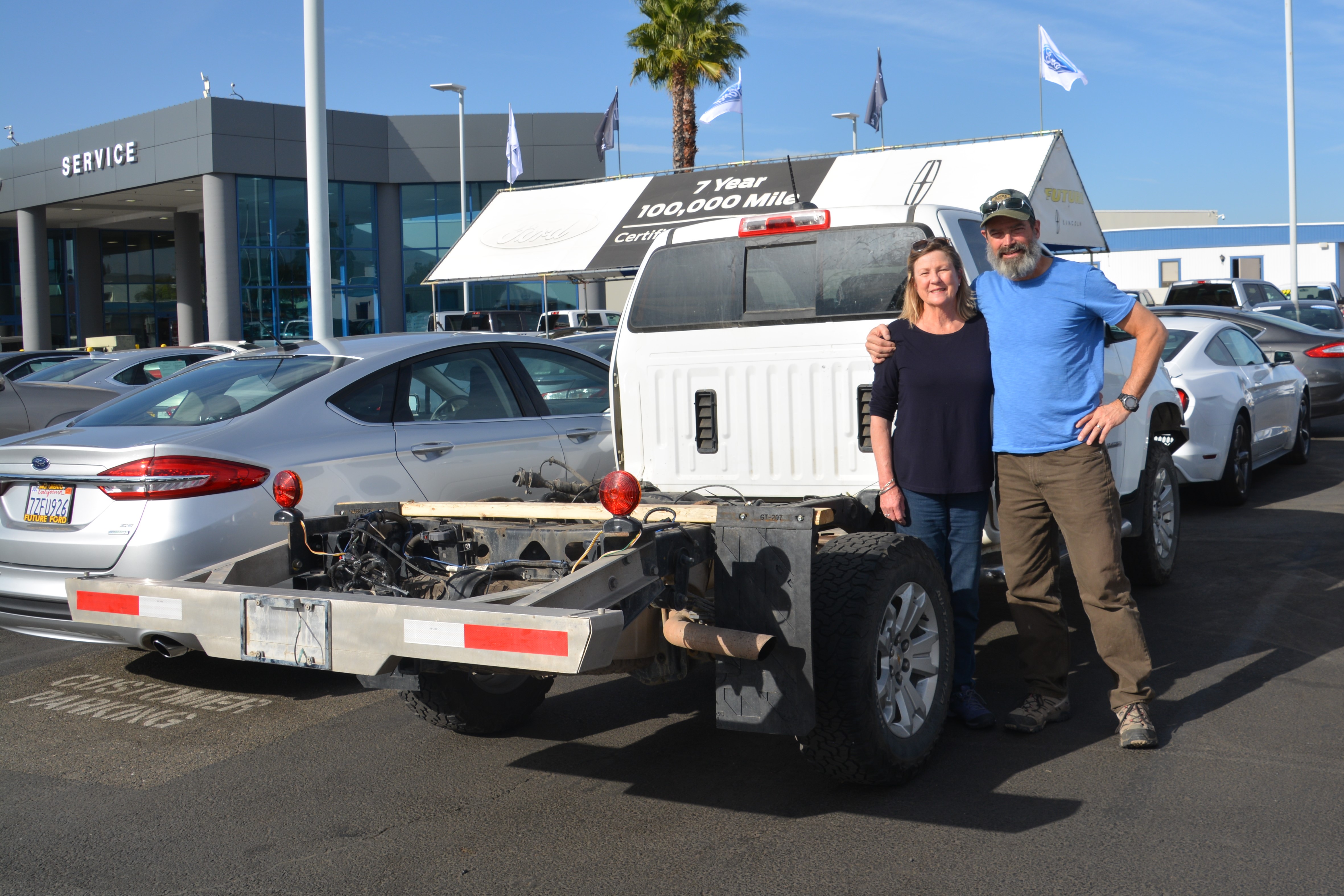 Julie and I pose in front of our new Ford F250 – a big truck, bigger than we thought we would ever buy but the right solution for the next stage of our travels