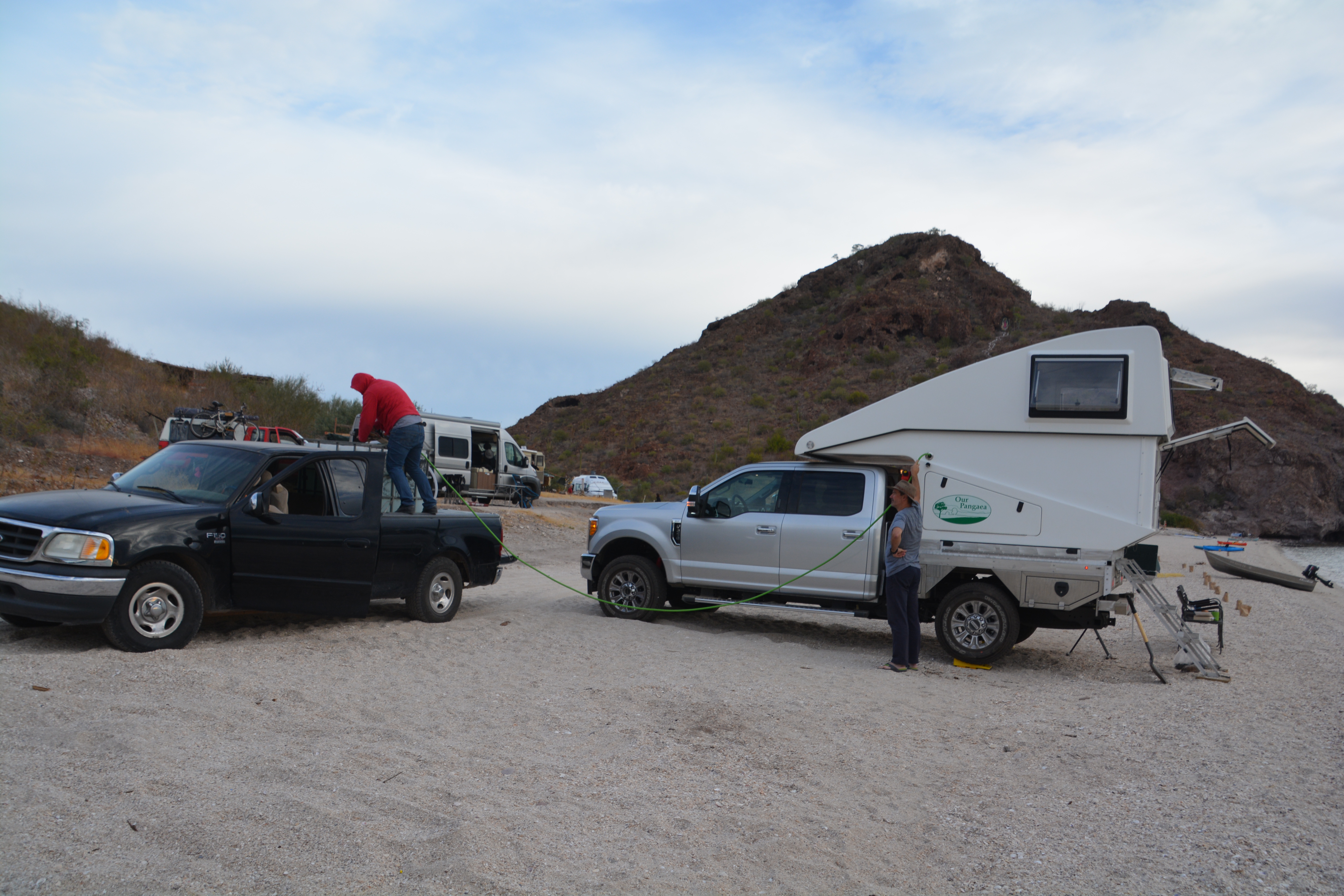 Each morning various vendors come down to sell food and supplies to campers. From this guy we bought fruit, vegies and 20 gallons of water which he pumped into Tramp