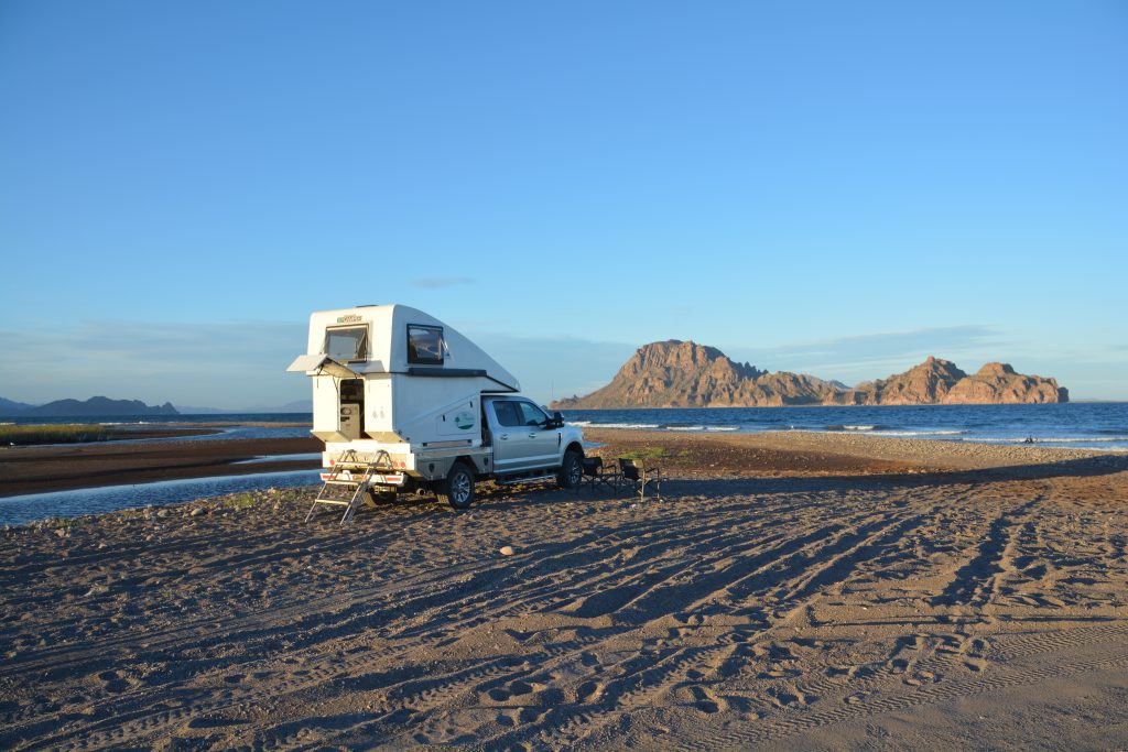 We followed a little side track near the beachside village of Ligui and ended up on a secluded beach with dramatic rocky islands just offshore. The sun was setting, the breeze was up and a nearby sign indicated we were in the Bahia de Loreto National Park. We were joined by a steady string of local vehicles, all pulling their little runabout fishing boat, backing into the surf to launch, piling in and then heading out to sea for some night time fishing. They returned, packed up and disappeared long after our raging fire had died and we had gone to bed.