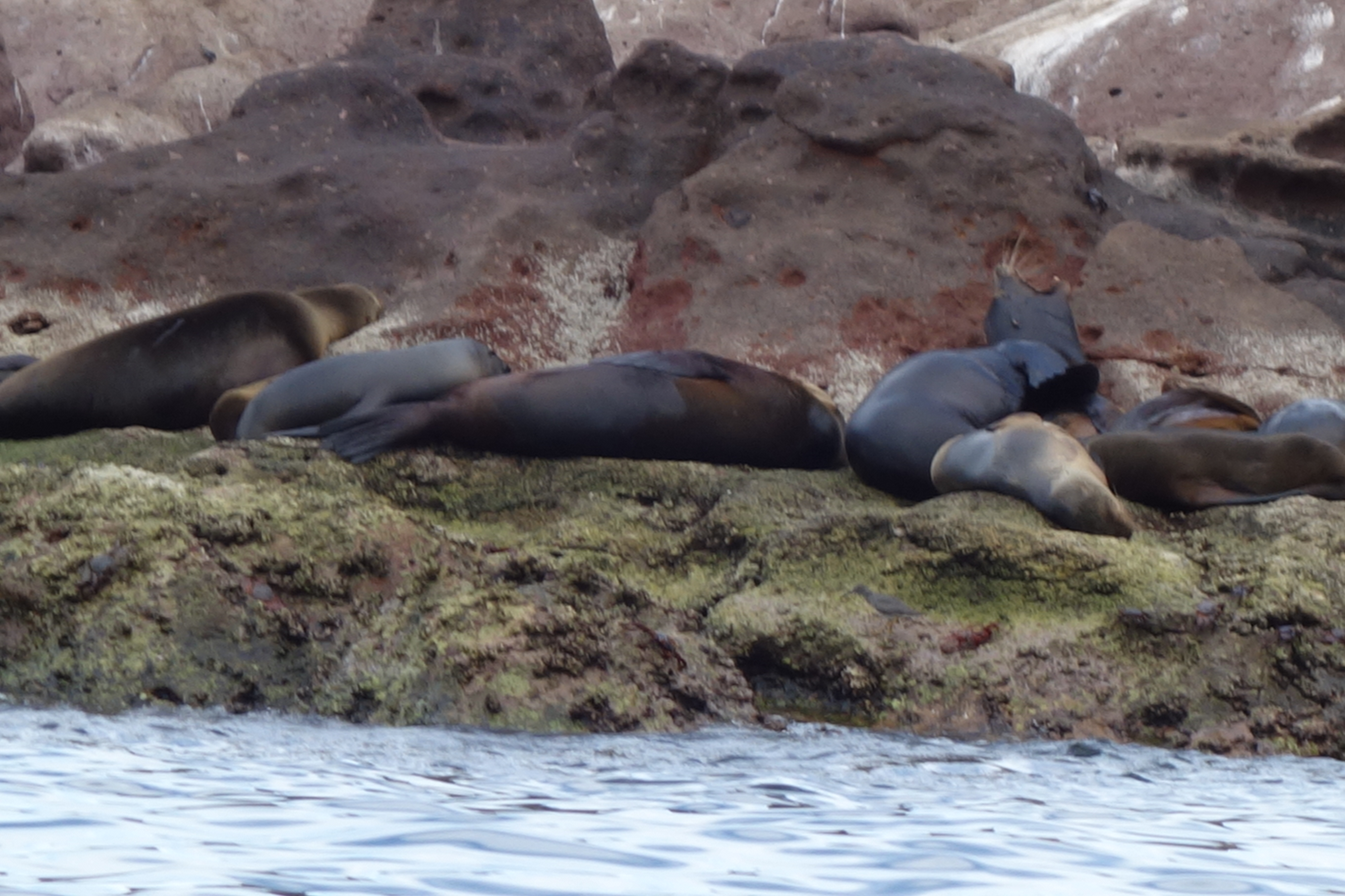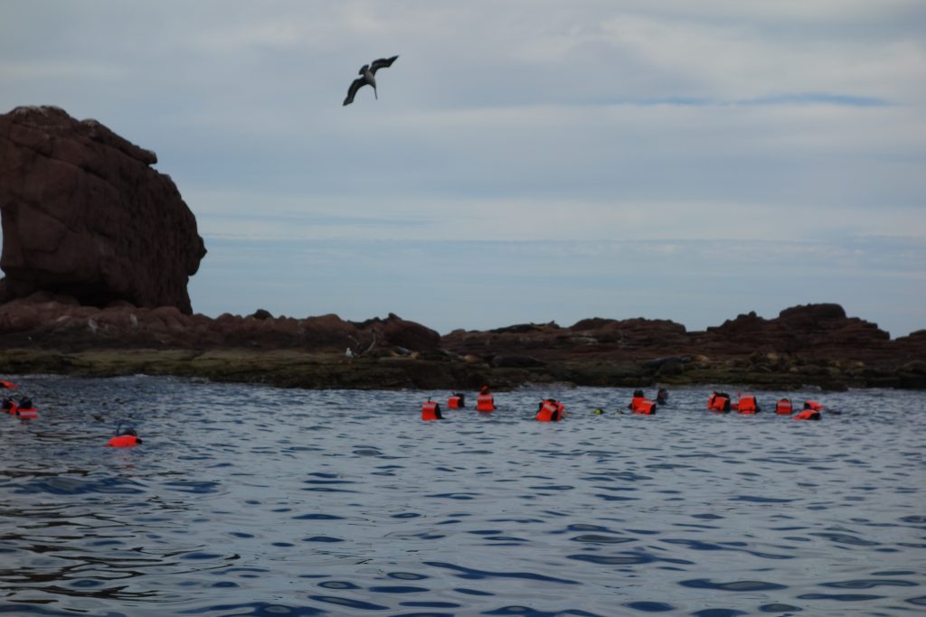 We eventually made the last set of islets in the chain which the barking sea lions called home. The rocks were white from bird poop and the water was bracingly cold but I jumped in to say hello to our hosts. I was surprised to find a good selection of colourful fish below me, including a thick school of tiny little silvery things that swam closely packed together but magically made way for me as I swam by.