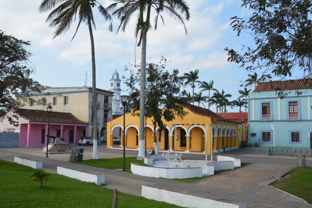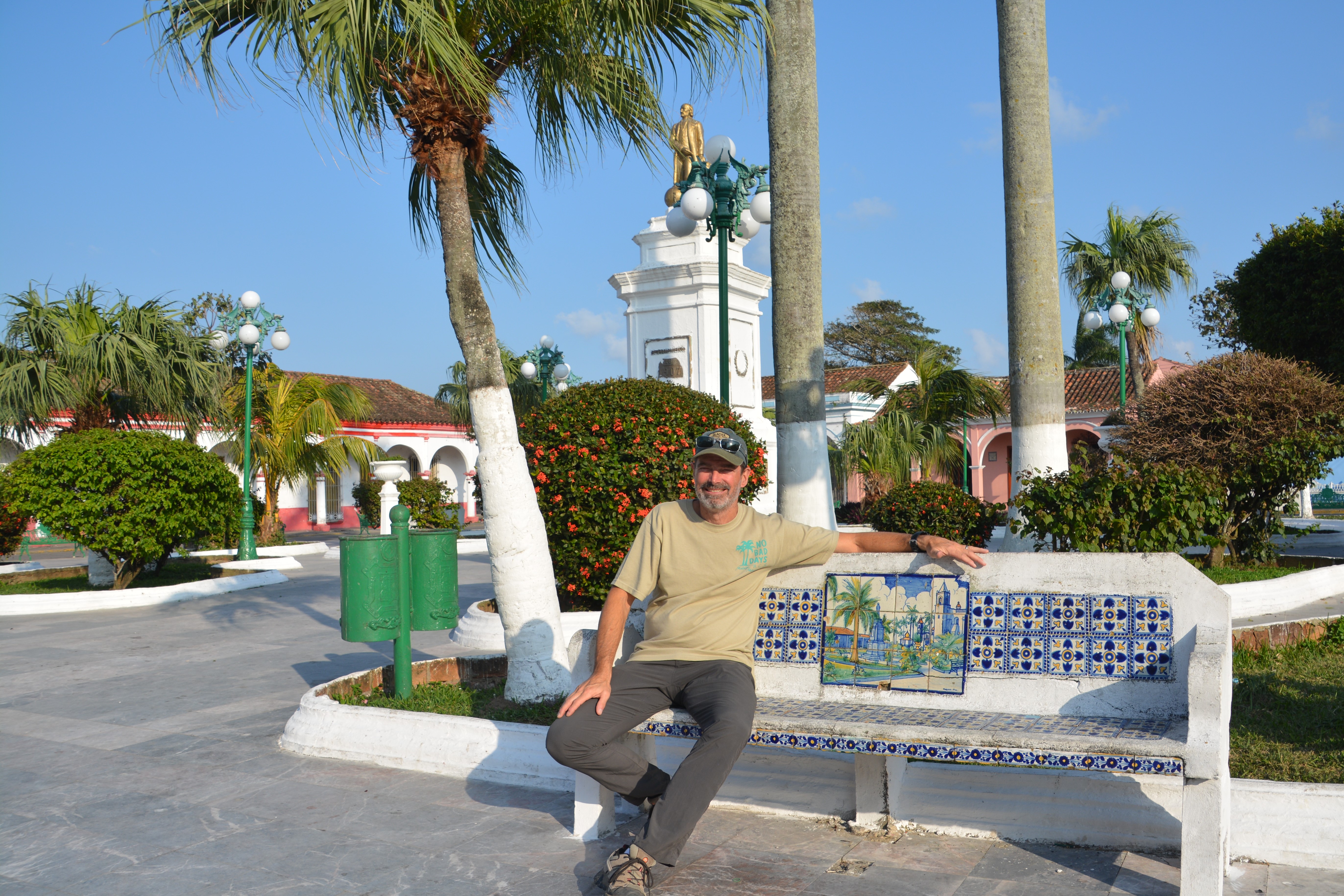 I’m taking a break from the rigours of travel in a beautiful plaza in the historic town of Tlacotalpan