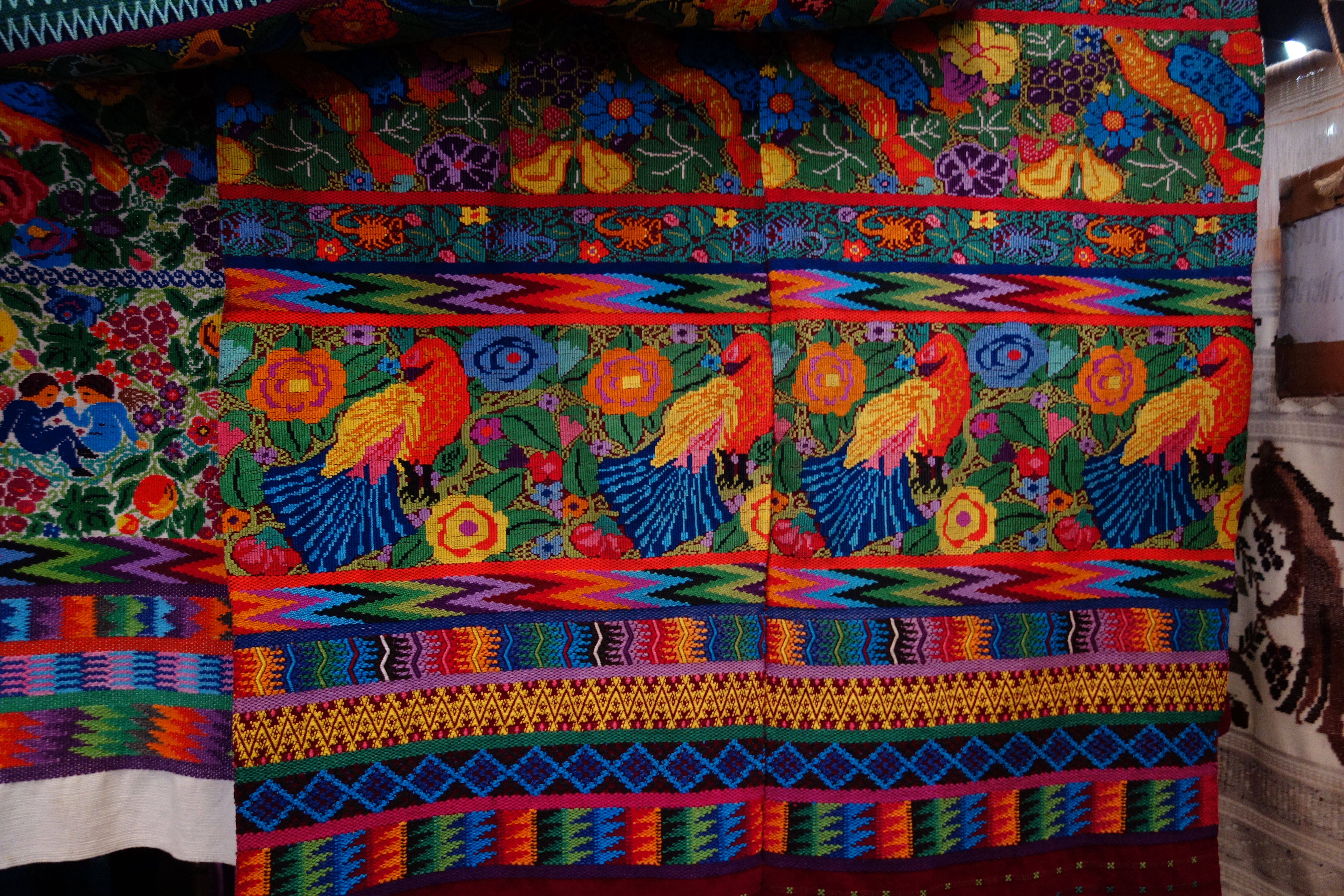 The next day we did more of the same, visiting many of the town’s old churches, some of them in partial ruins from the earthquake in the 1770’s but still defiantly standing, the old plaza with its two original palaces and all the many shops selling colourful textiles made by Guatemalans, much of the most beautiful material all hand stitched. We also walked up the hill overlooking town for aerial views of the red tile roofs, church domes and the cloud-covered volcano that stood guard over the town.