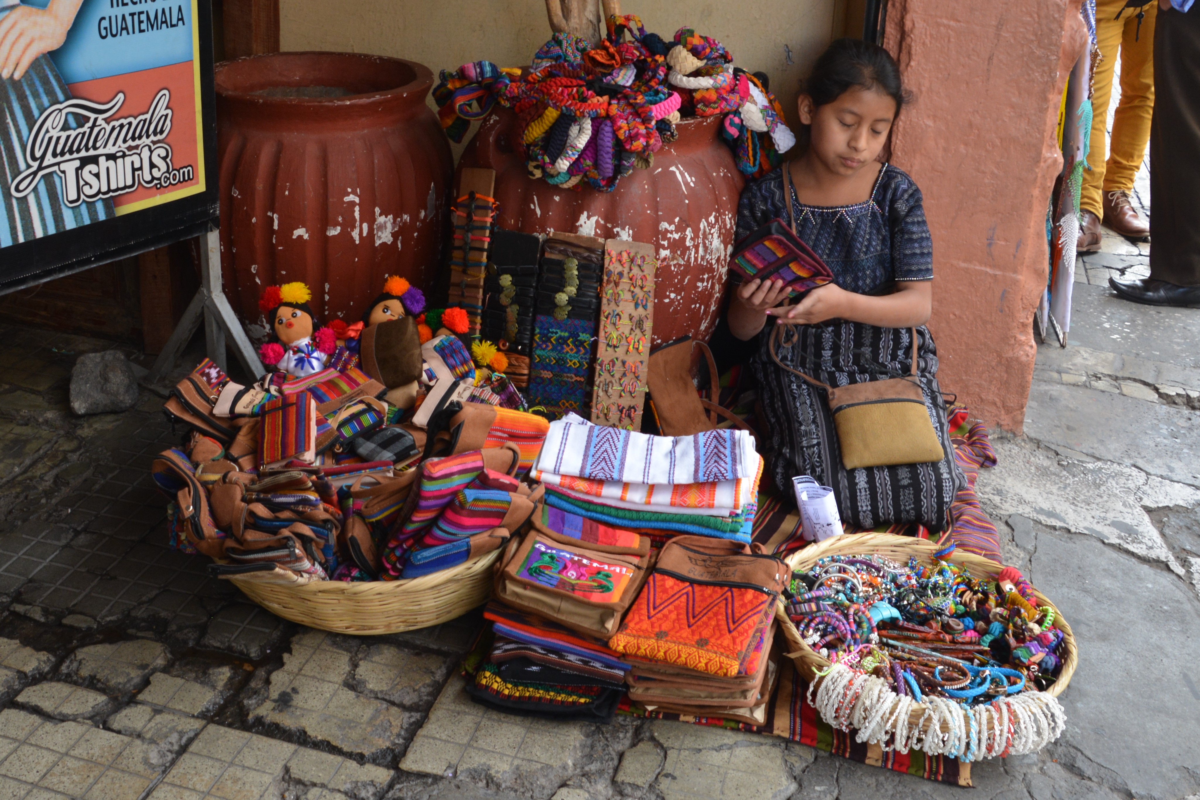 A young girl sells a variety of touristy-type things in Antigua but its usually about the bright traditional colours