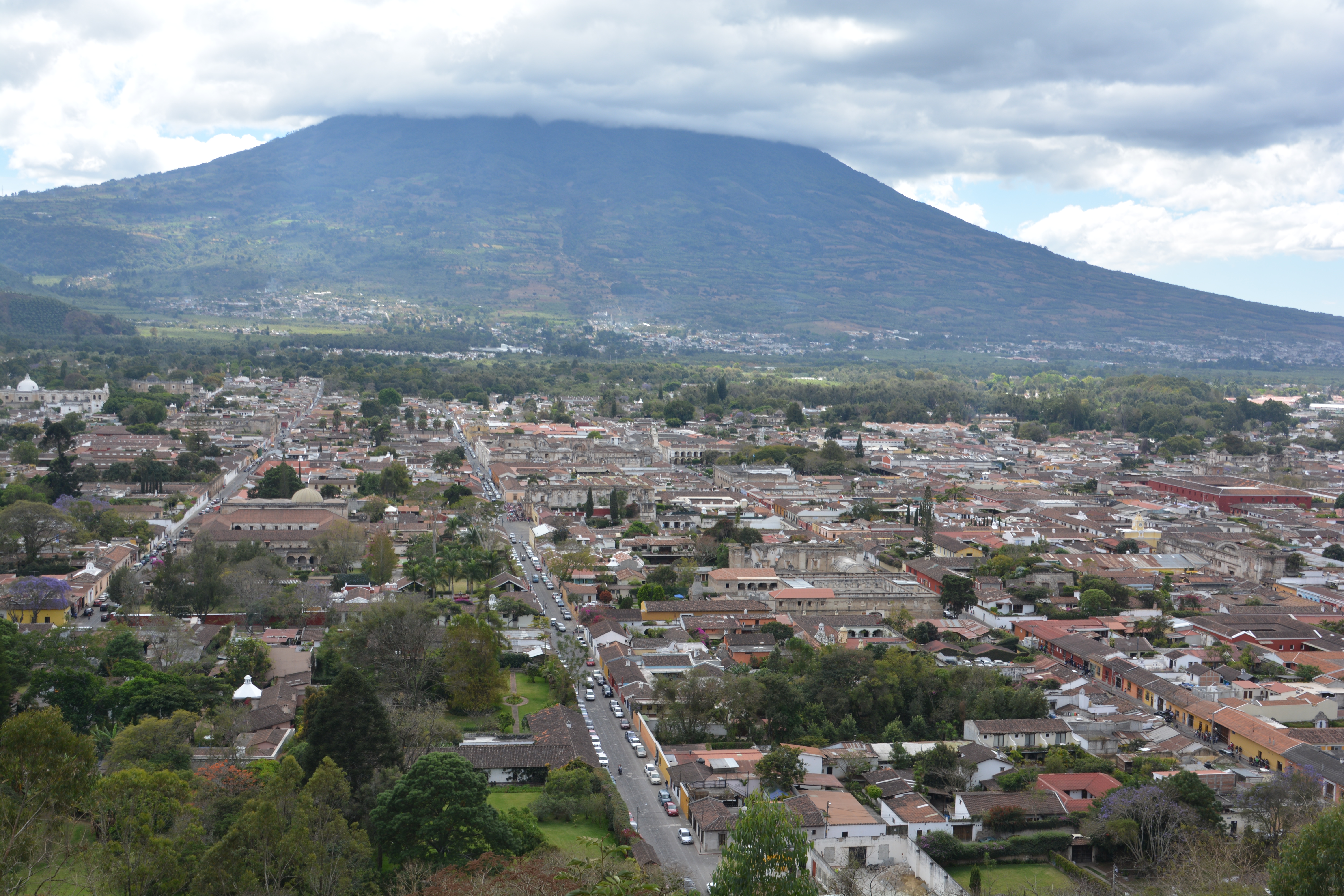 Antigua from the top of a nearby hill – its all about (cloud-covered) volcanos, red tile roofs and domed churches