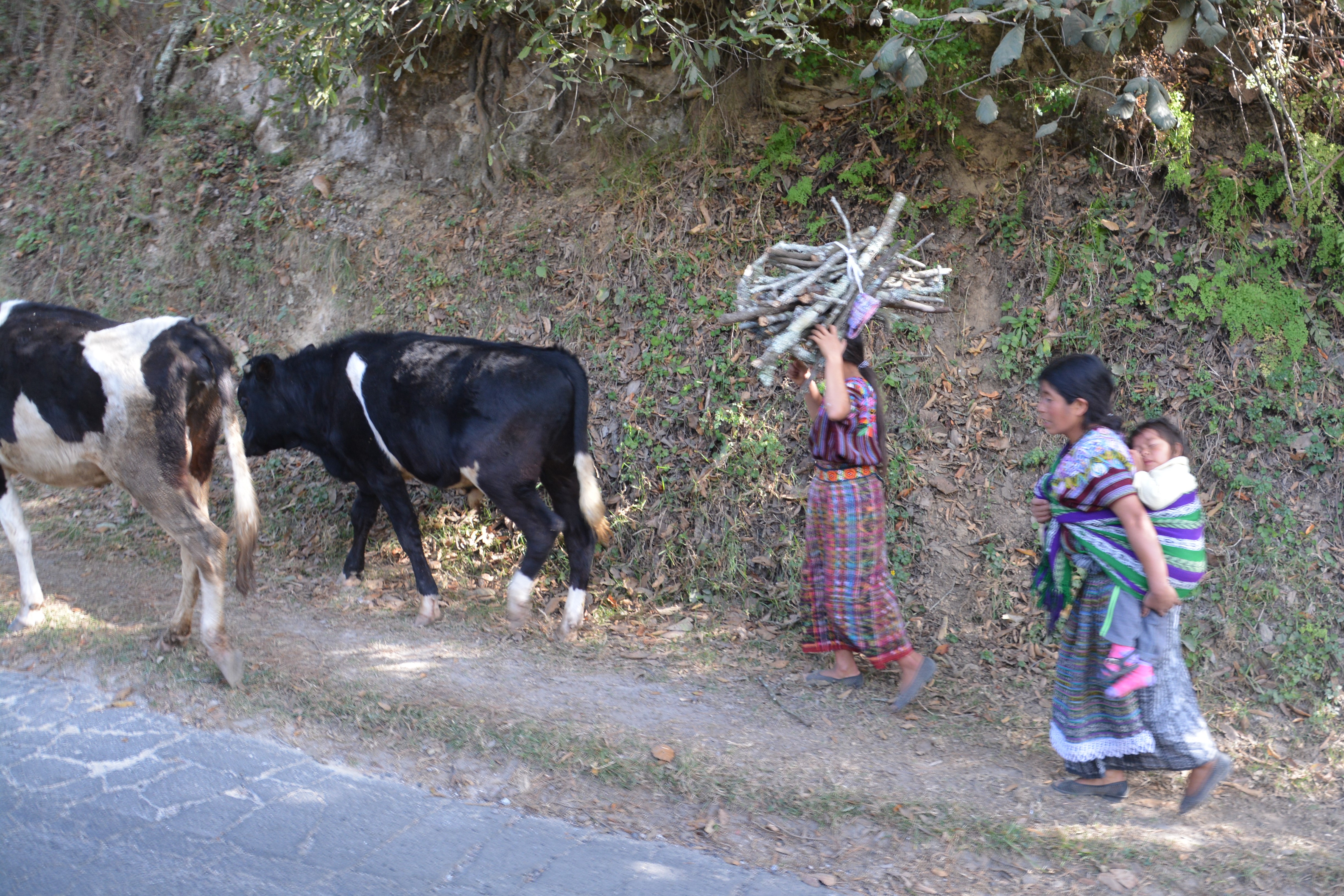 Amazing roadside scenes – a mother carries her infant on her back while another woman carries a supply of firewood while they walk their two cows home