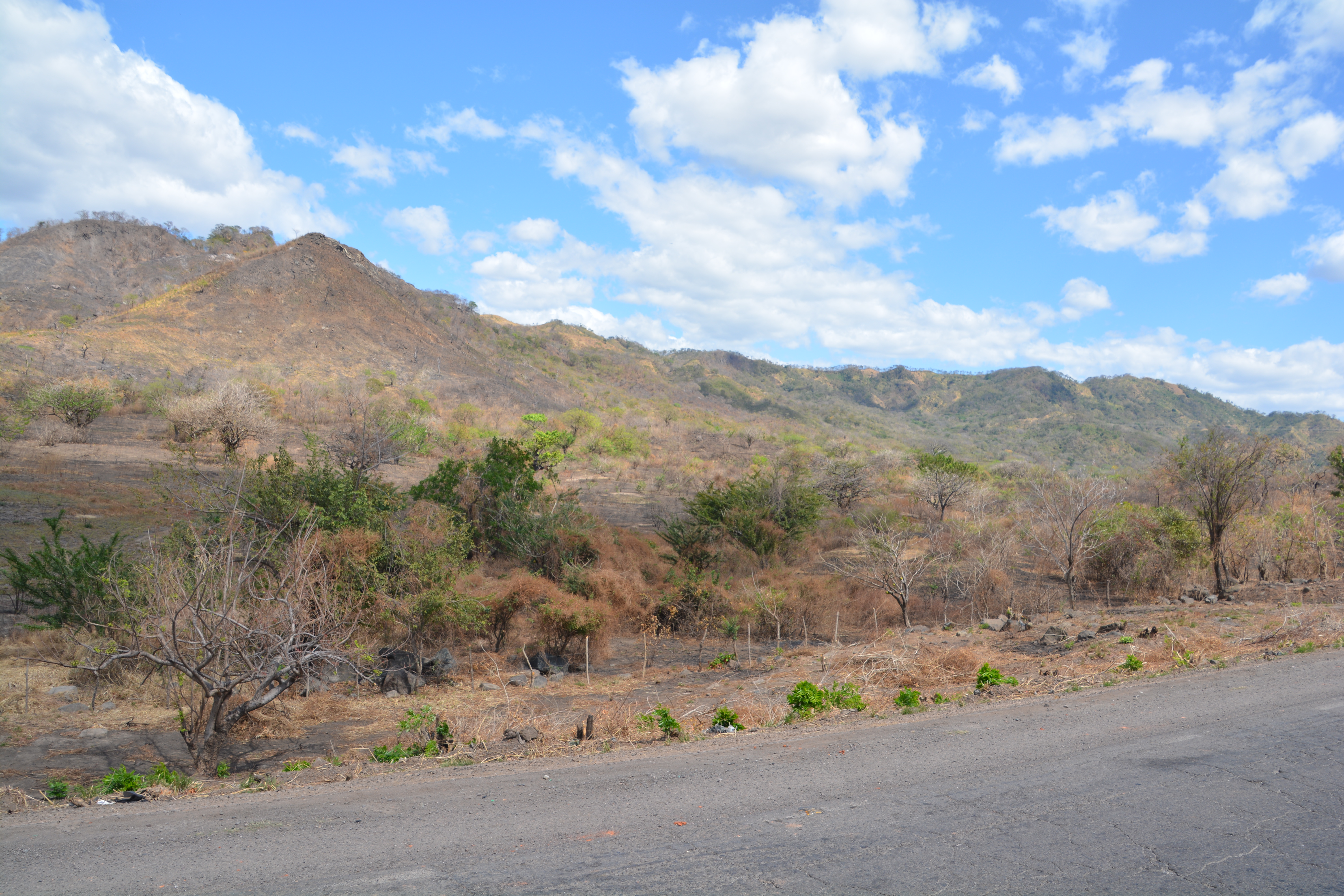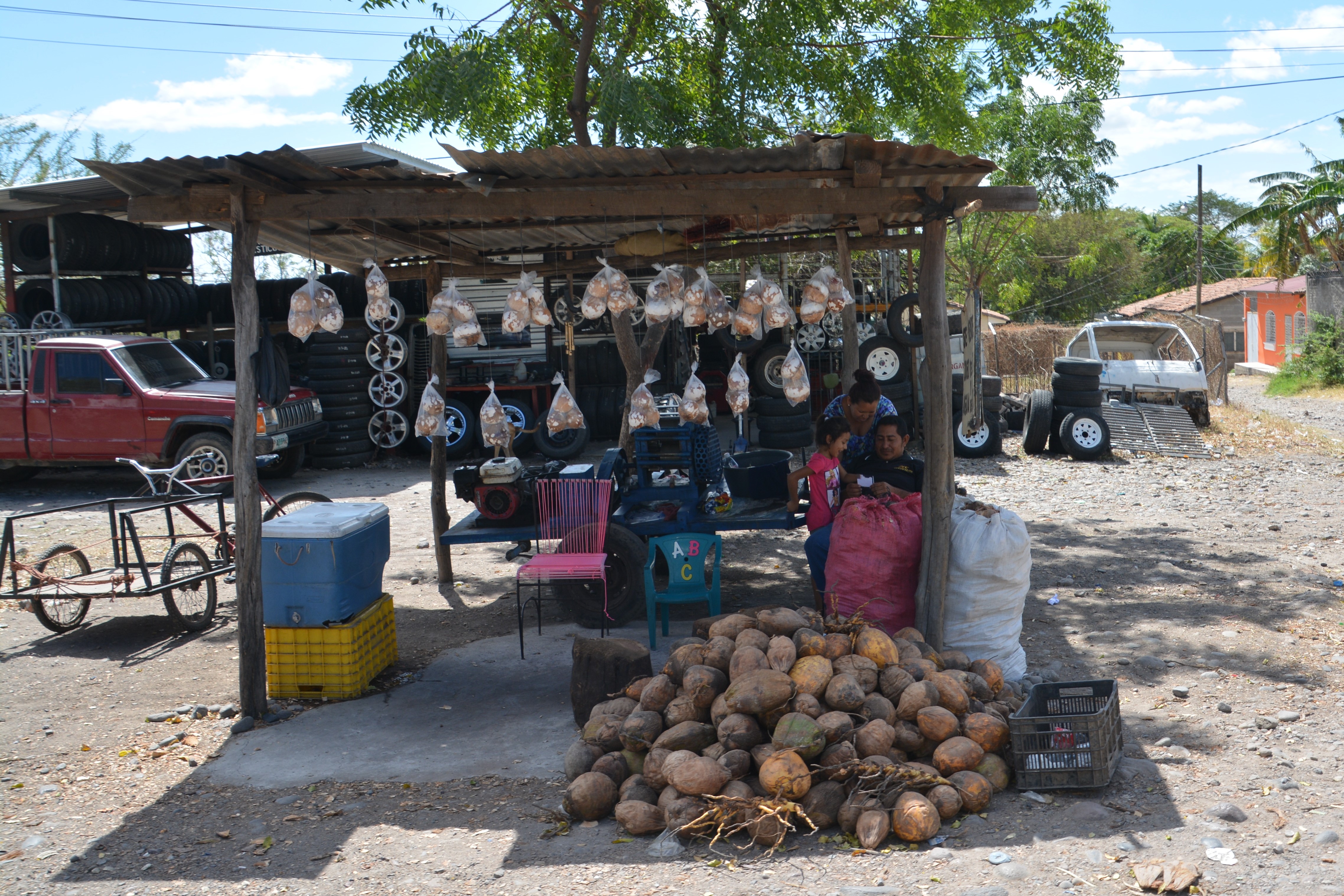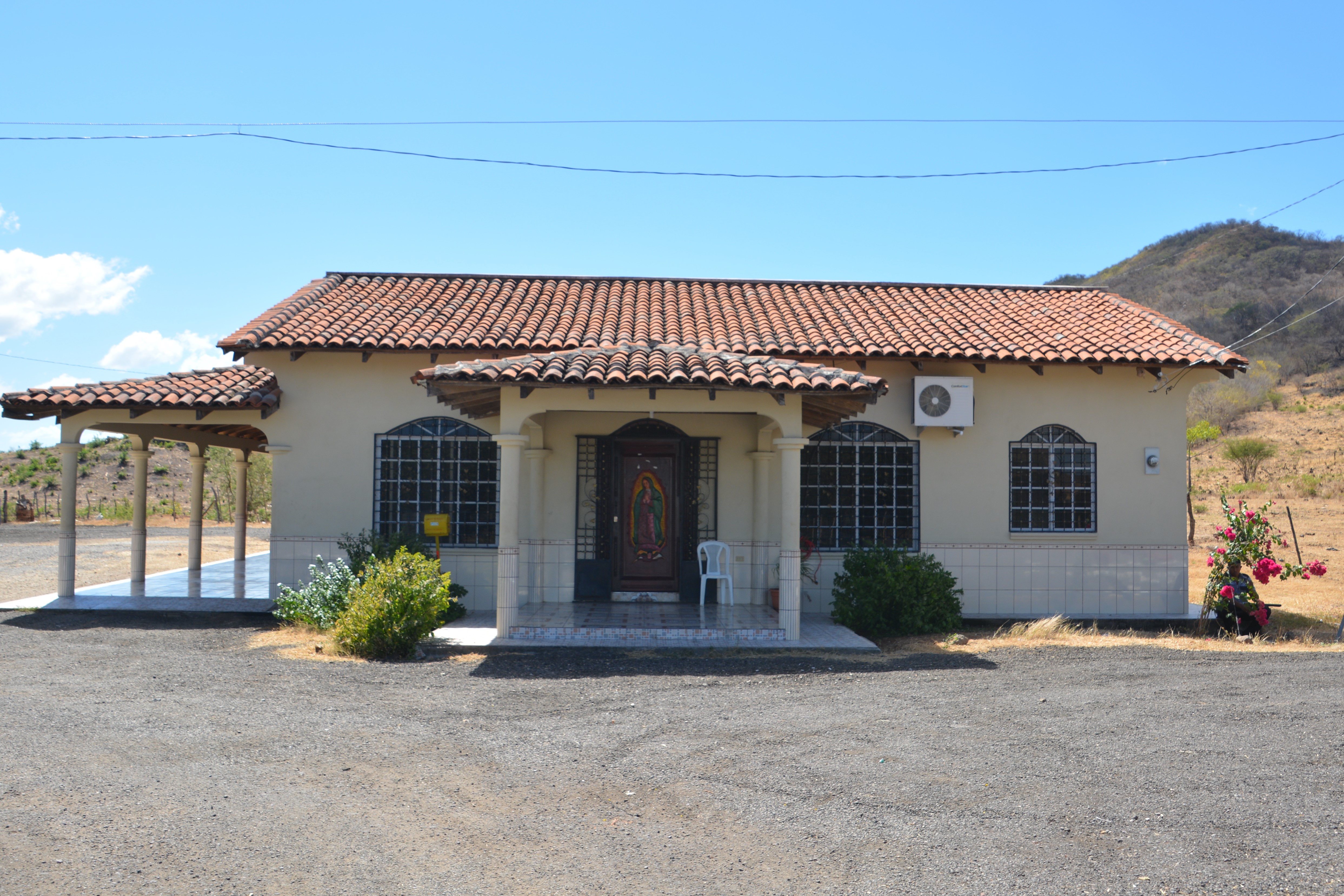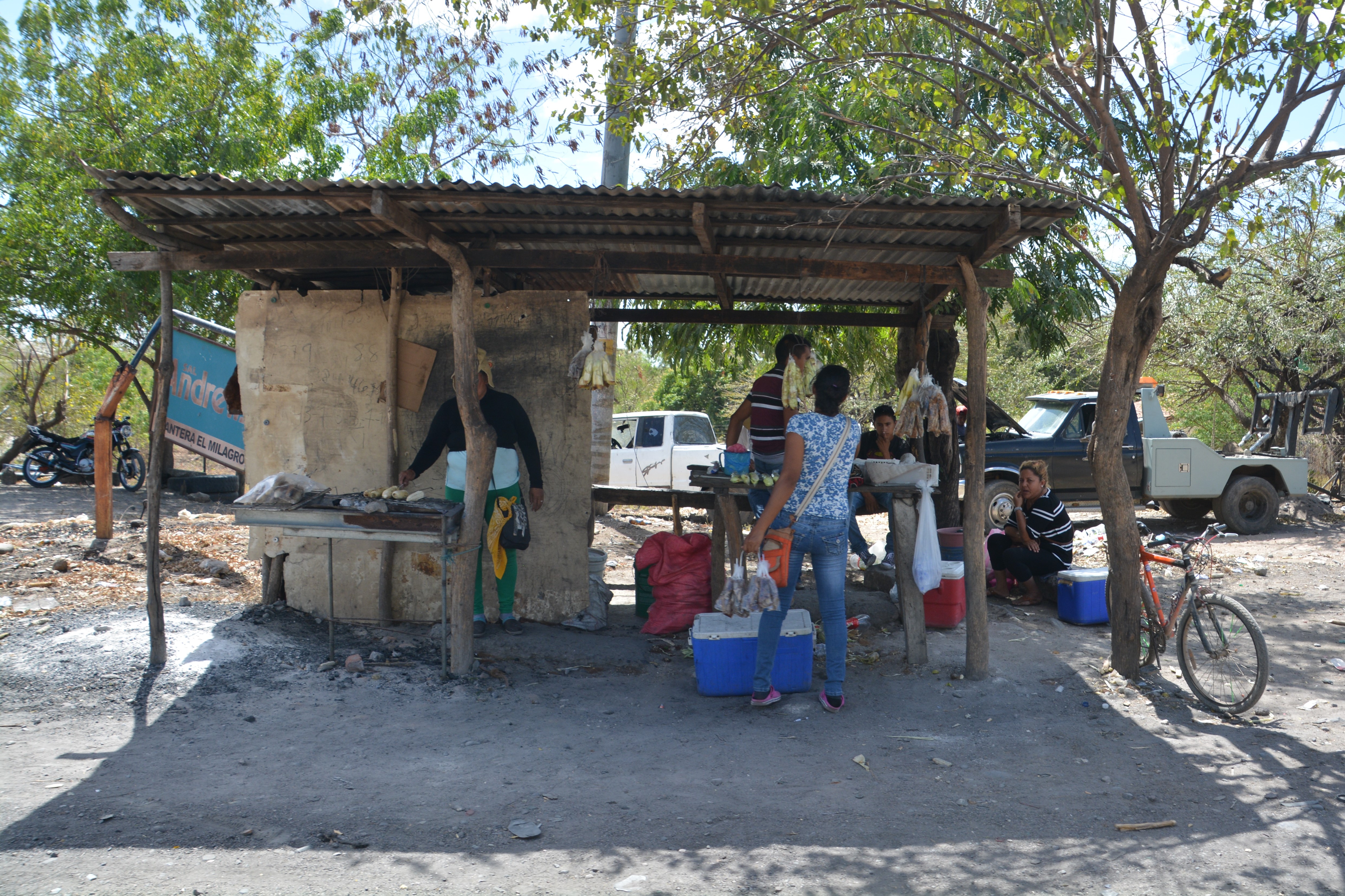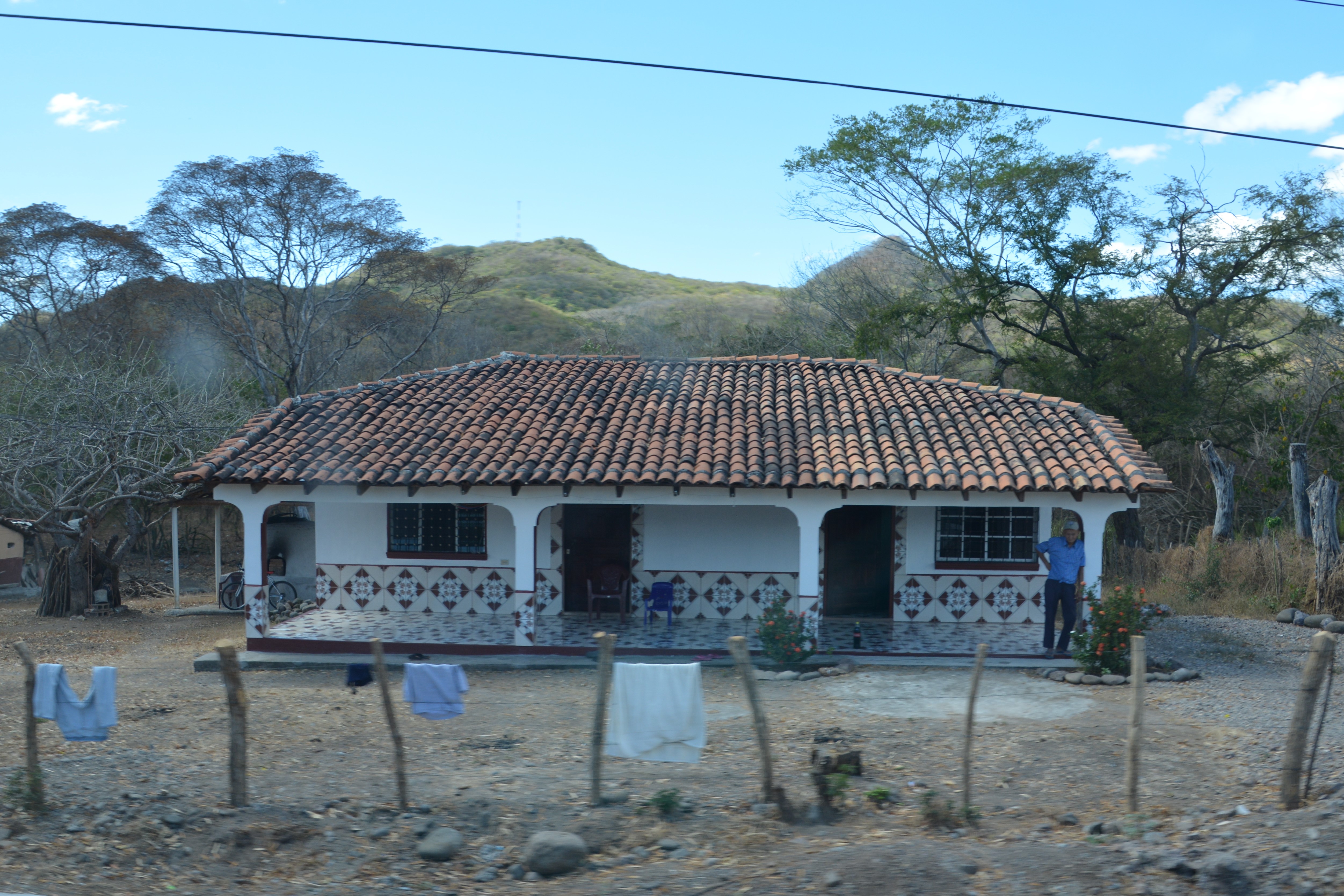 We stopped in Choluteca to have lunch and pick up supplies at a local supermarket but when we hit the road again we diverted off the Pan-American Highway and the road immediately reverted to a rough pock-marked poor mess of a highway and the houses also became much more modest. The people here were clearly doing it much tougher. And the weather wasn’t helping, despite it being mid winter Tramp’s thermometer topped out at 101 degrees F, about 39 degrees C. How do these people in their simple mud huts survive summers?
