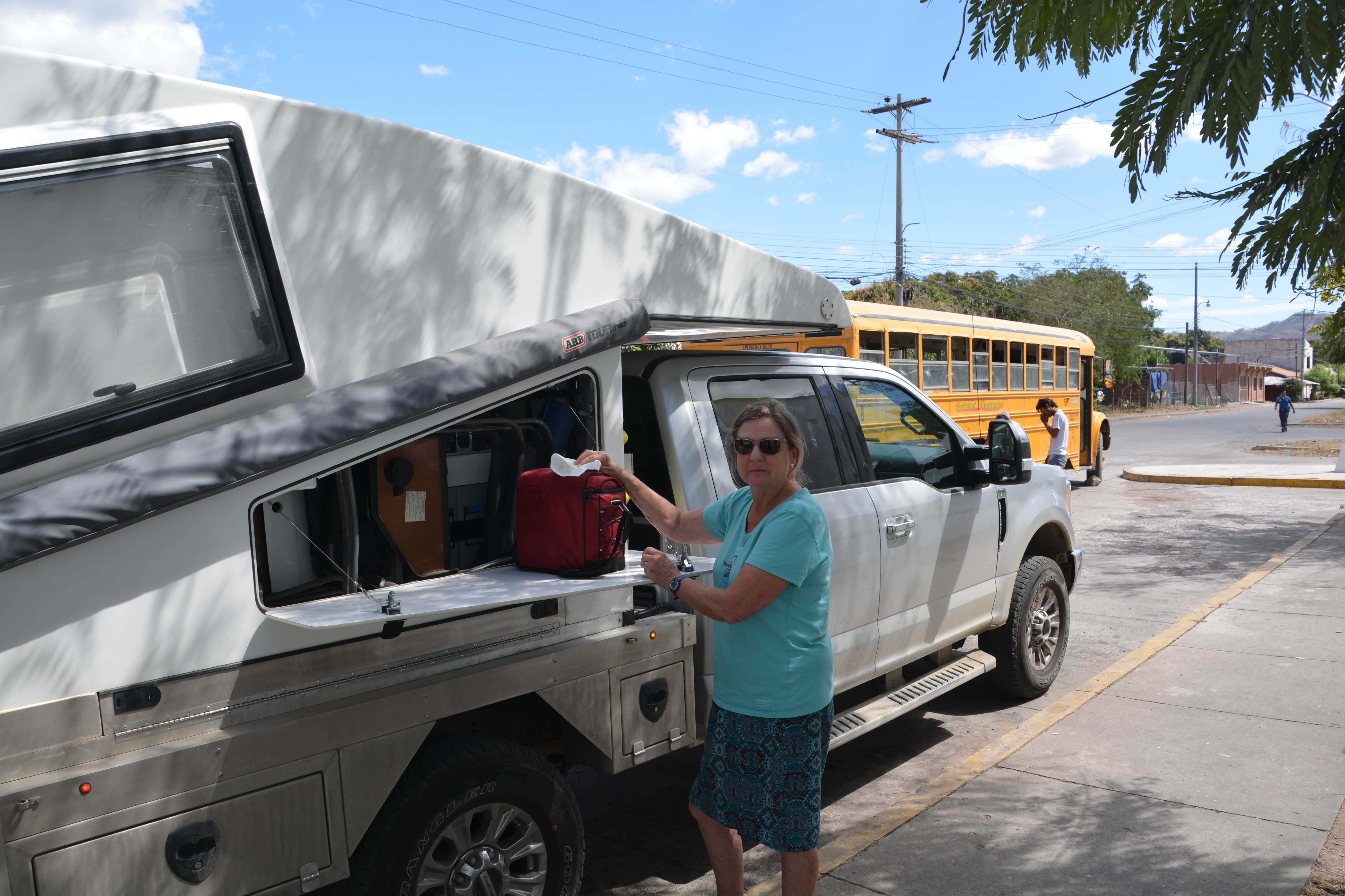 So just for fun, here is the process to cross into Nicaragua at the Guasaule border crossing. (We chose this crossing over another because we had read online that the other crossing required tourists to apply for entry online in advance but this border did not. Go figure.) First stop was to get our tires fumigated, cost $3.75 at a little booth off to the side. A guy walked around our truck and sprayed our four tires. Really.