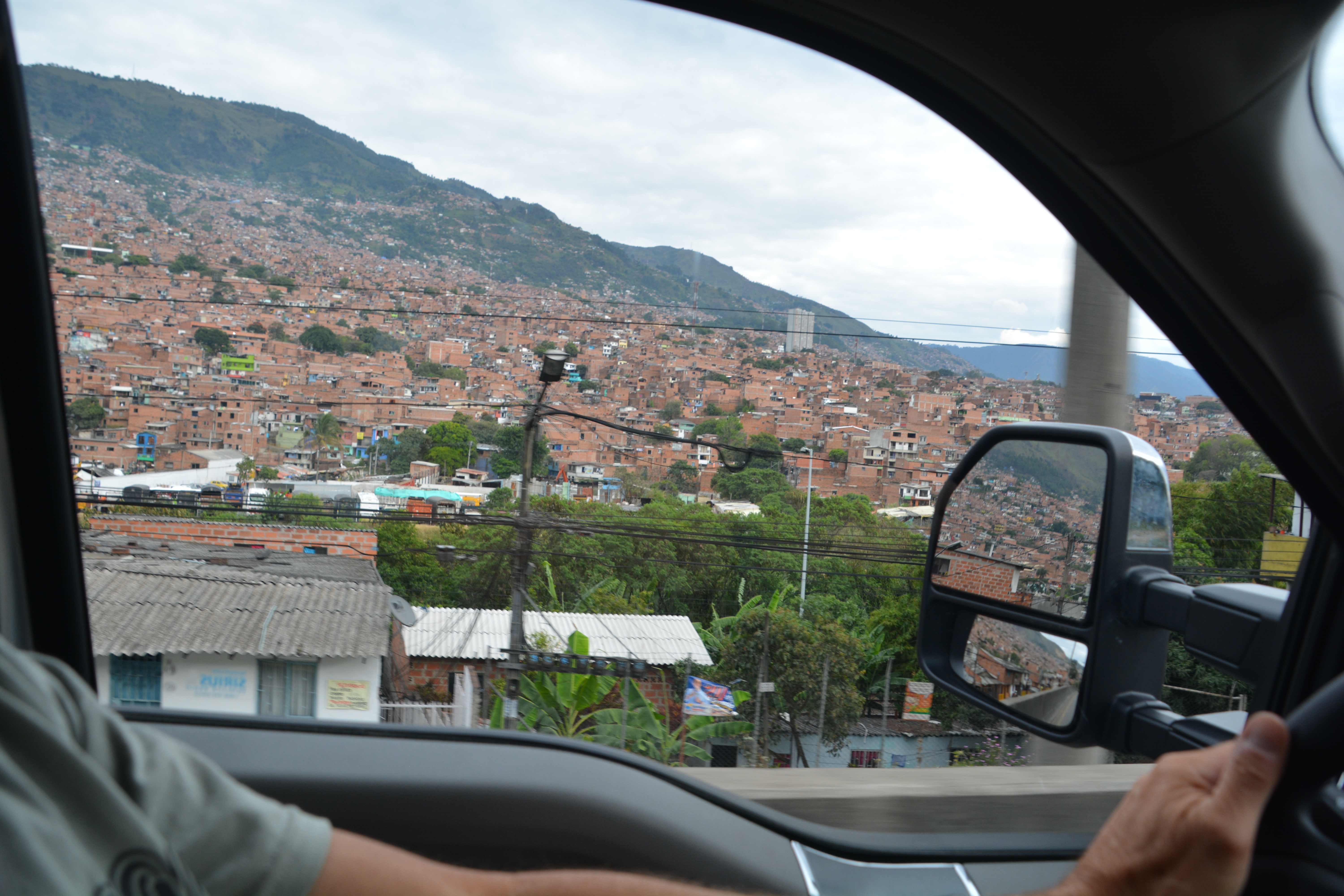 My side window view of the city of Medellin, all the same colour as it climbs up the steep slopes of the mountains