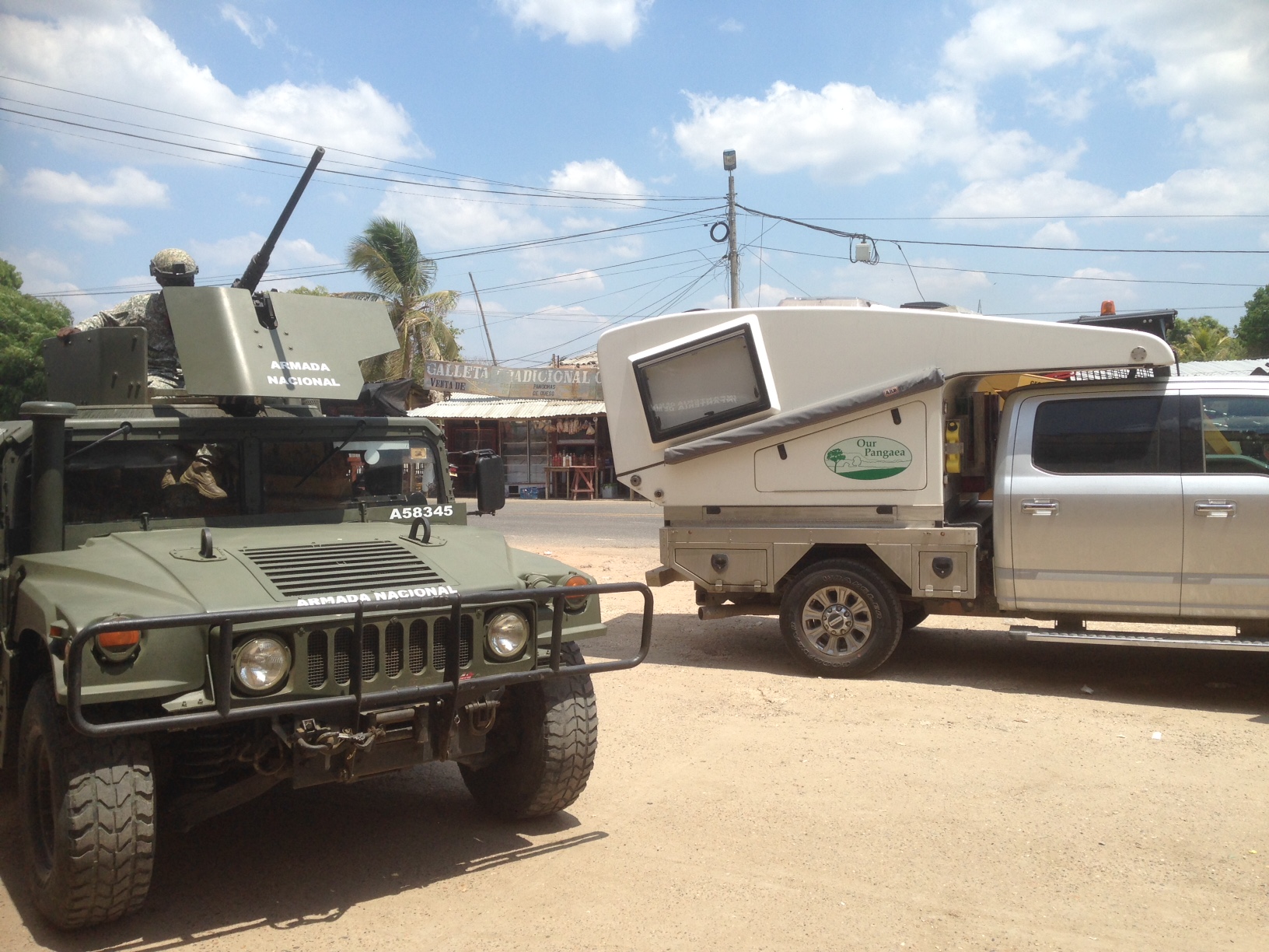 Then it was up and over another huge mountain range, more super tight narrow winding roads, a conga line of huge trucks, stunning views of the mountains and dusk setting in. At one stage we were stopped at a military check point – always more fun because of the machine guns – and were told “Obtener de la coche” – get out of the car. Not a good sign at any time but it turns out it was just a curiosity stop – they were interested in Tramp and our travels, very friendly, while the perfunctory search lasted 30 seconds. It had been a long slow day by the time we reached flat ground and pulled into the first truck stop for camp.