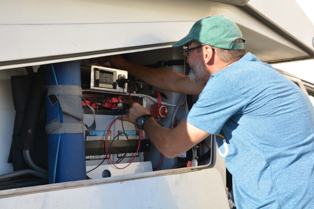 The origins of this problem go back about ten days when we had to start using the manual override system to raise and lower Tramp’s lid because the hydraulic system was not operating properly. But now the lid had stopped moving all together and the camper was completely unusable. It was a sickening feeling to think that our grand trip was now somehow in deep peril because of what could be a problem on the motor of the hydraulic system.