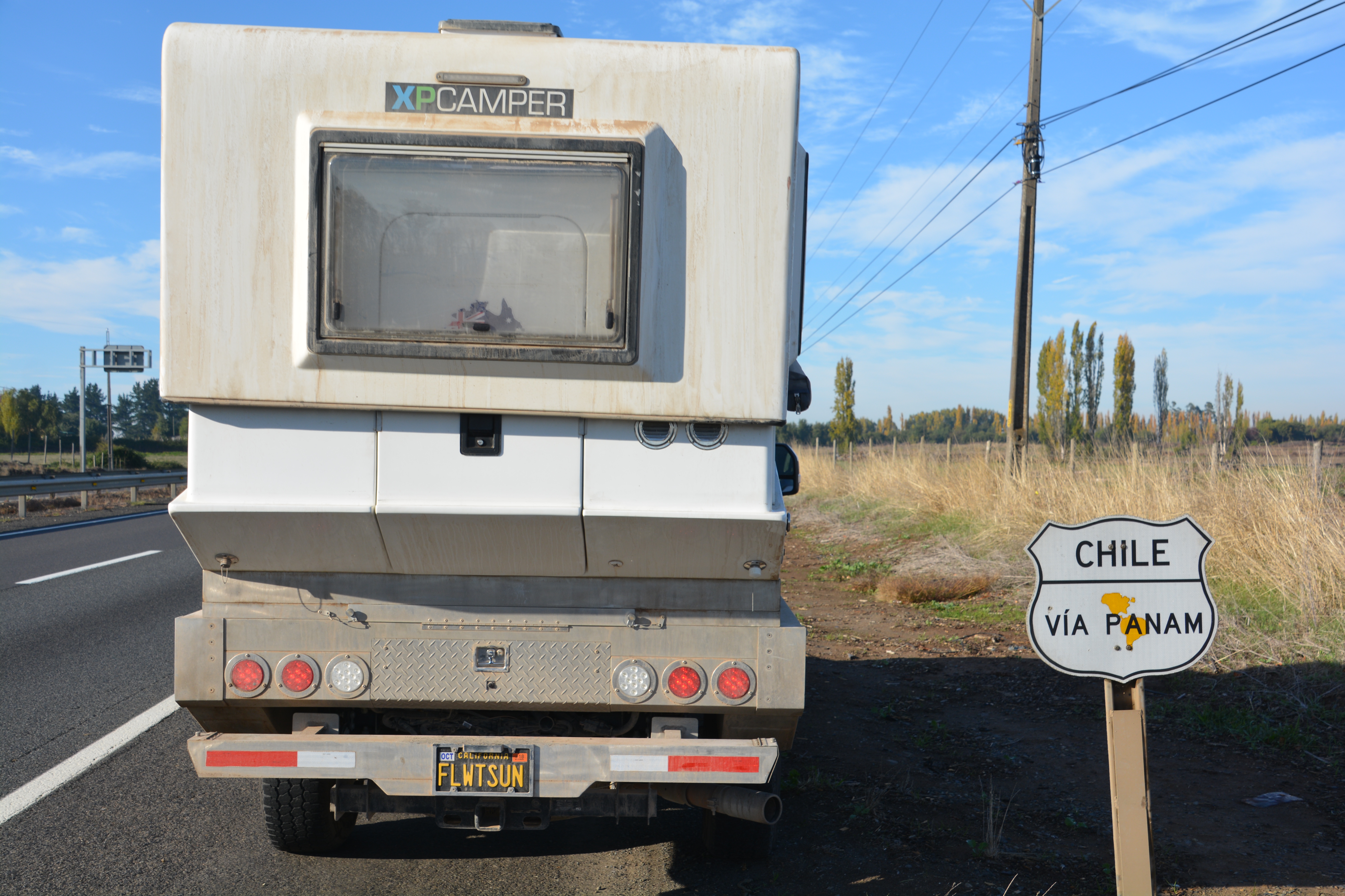 Tramp poses next to a rare sign that highlights the Chilean section of the Pan American highway – note the top of the camper is stuck in a halfway position and slightly crooked
