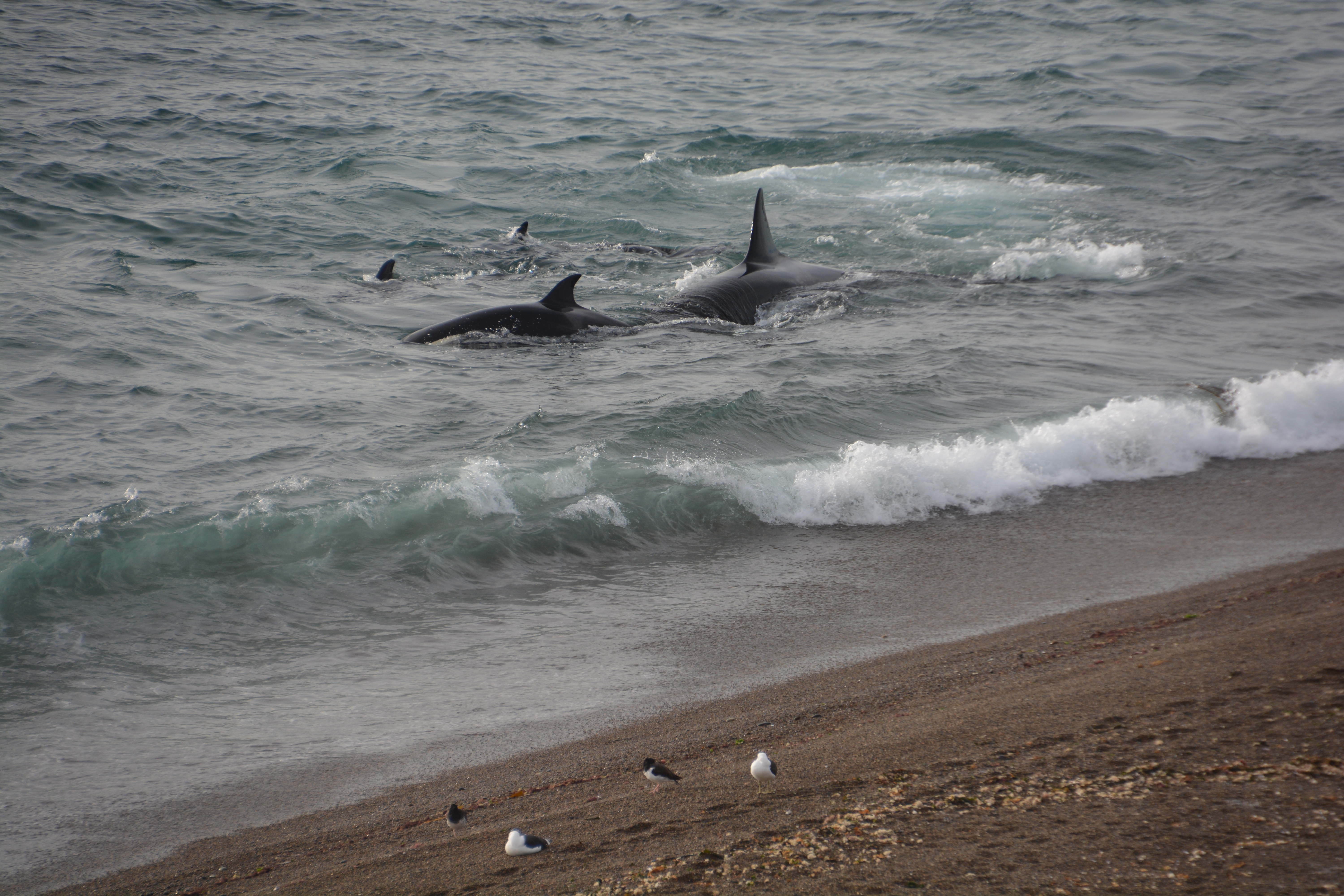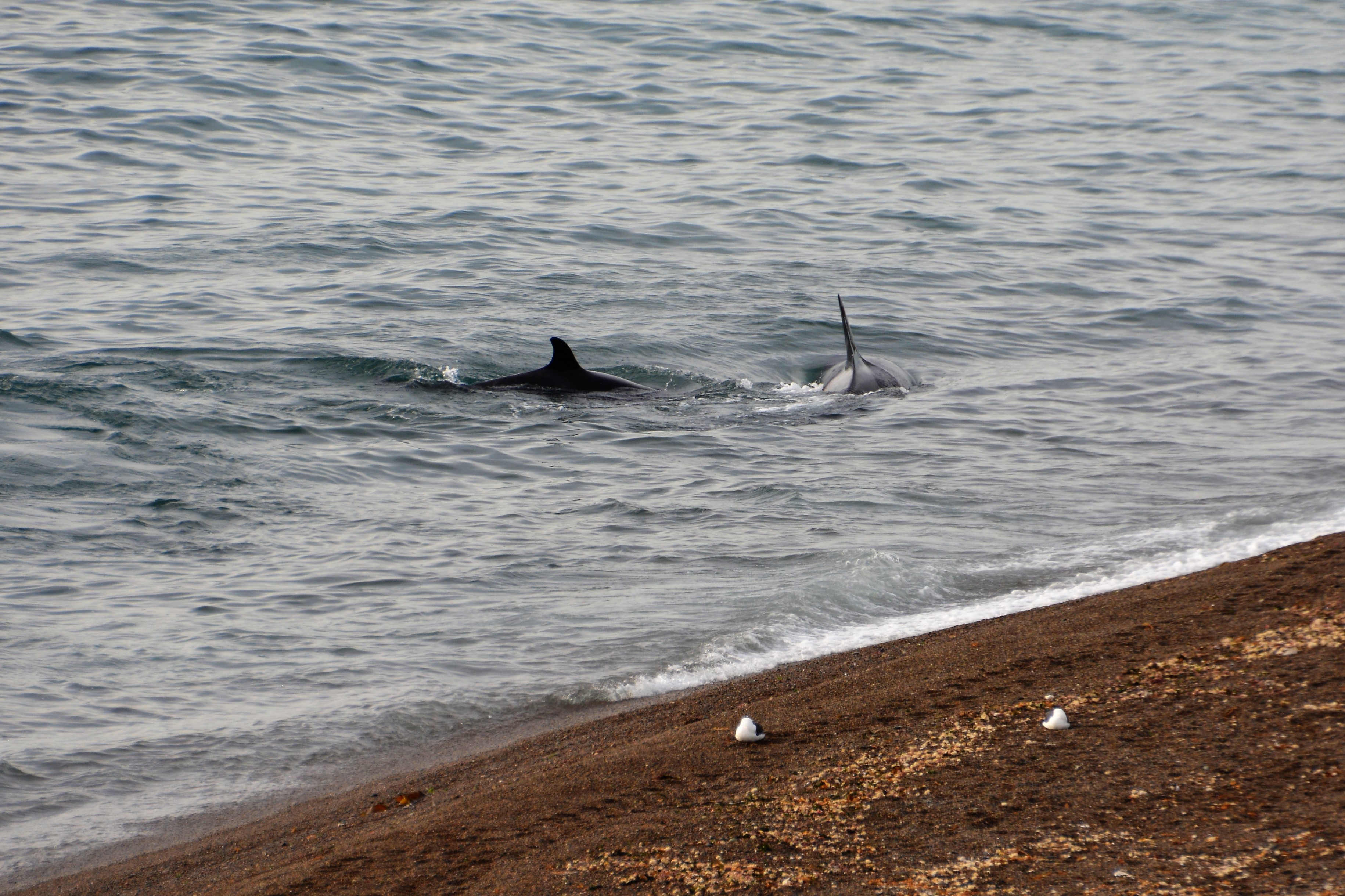 A couple of hungry orcas prowling very close to the beach, hoping for an unsuspecting penguin or sea lion