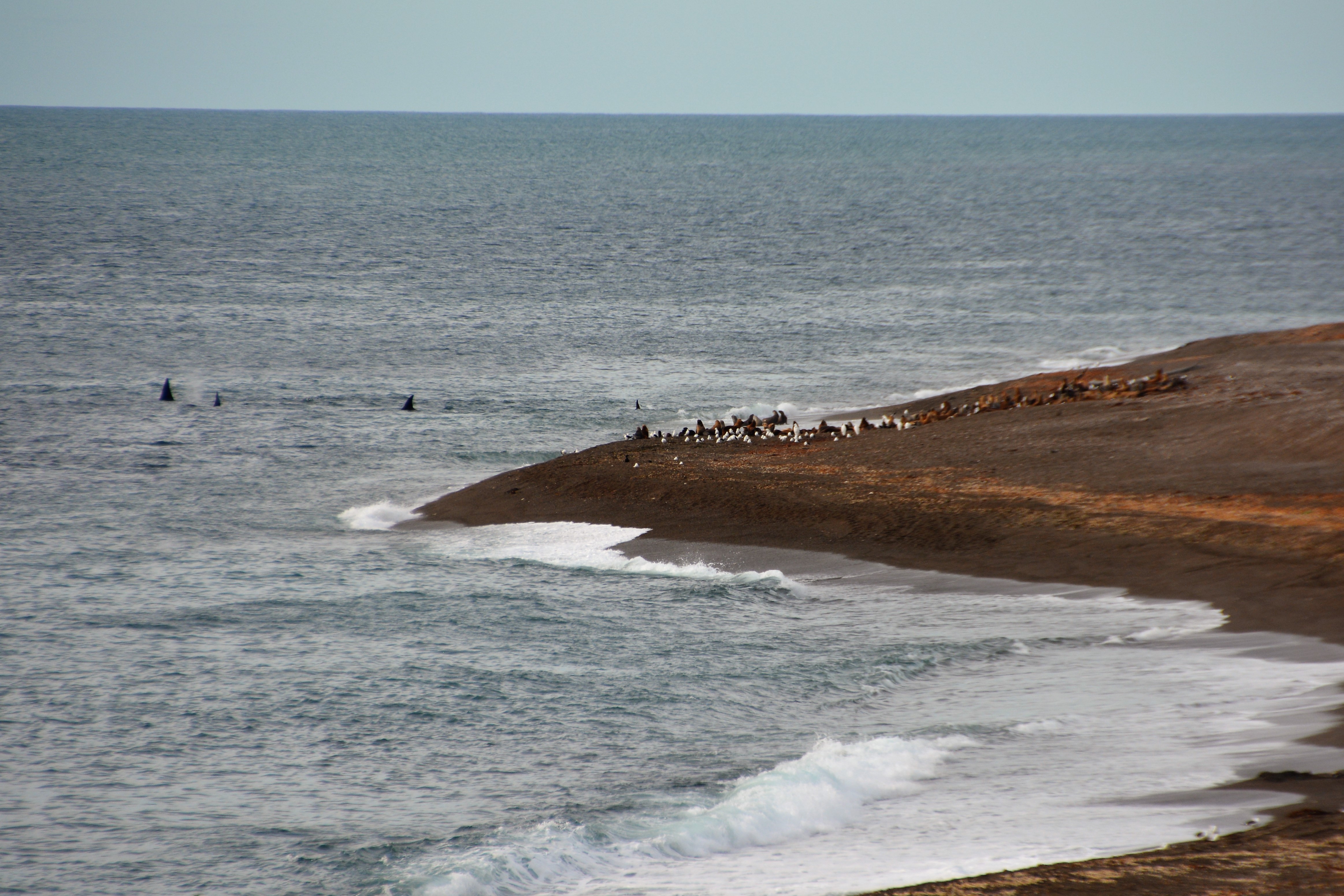 The animal world in action – orcas patrolling off the steep grainy beach while sea lions stay above and out of their reach