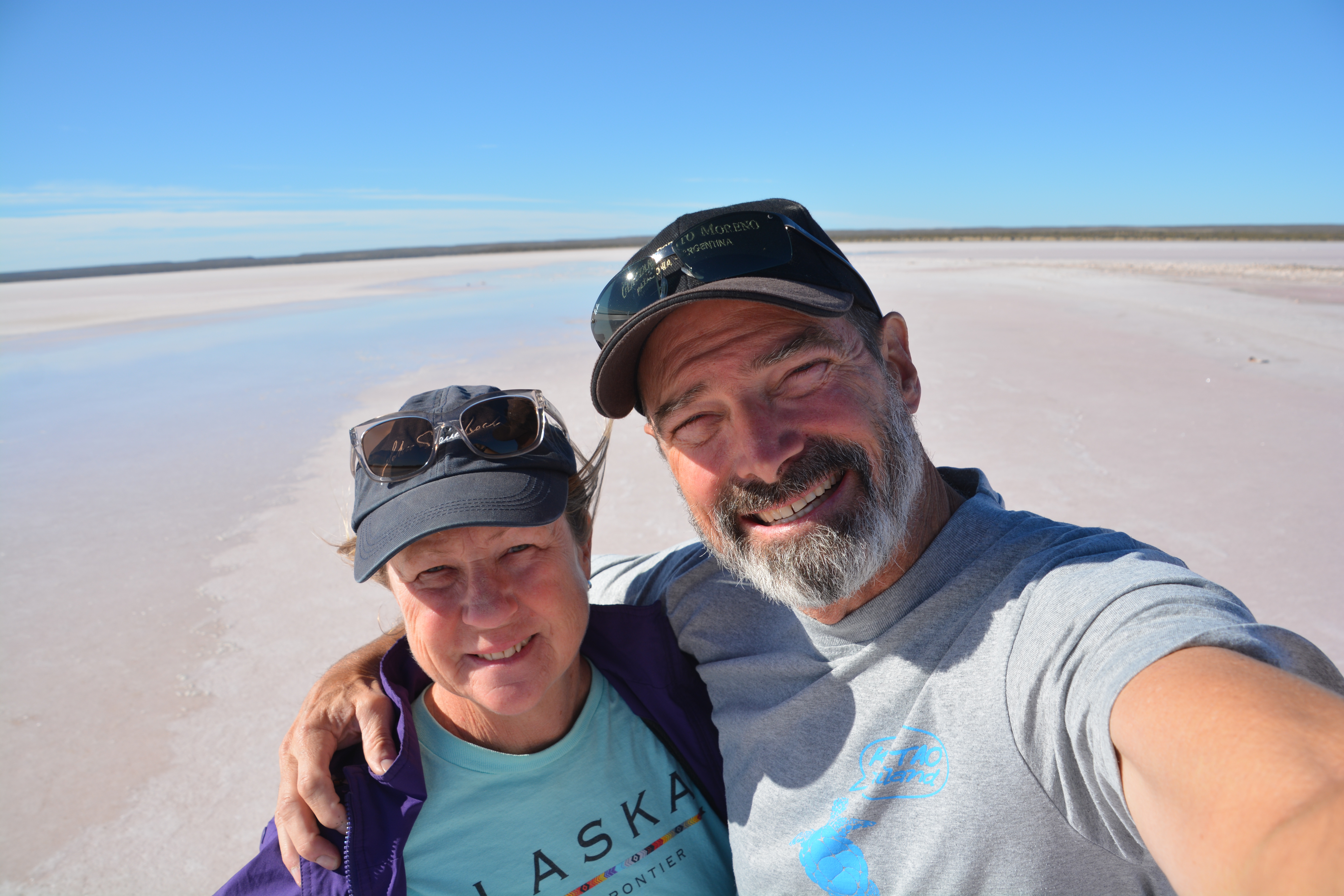 Julie and I standing at the sunken salt flats on Peninsula Valdes which is an amazing 35 metres below sea level