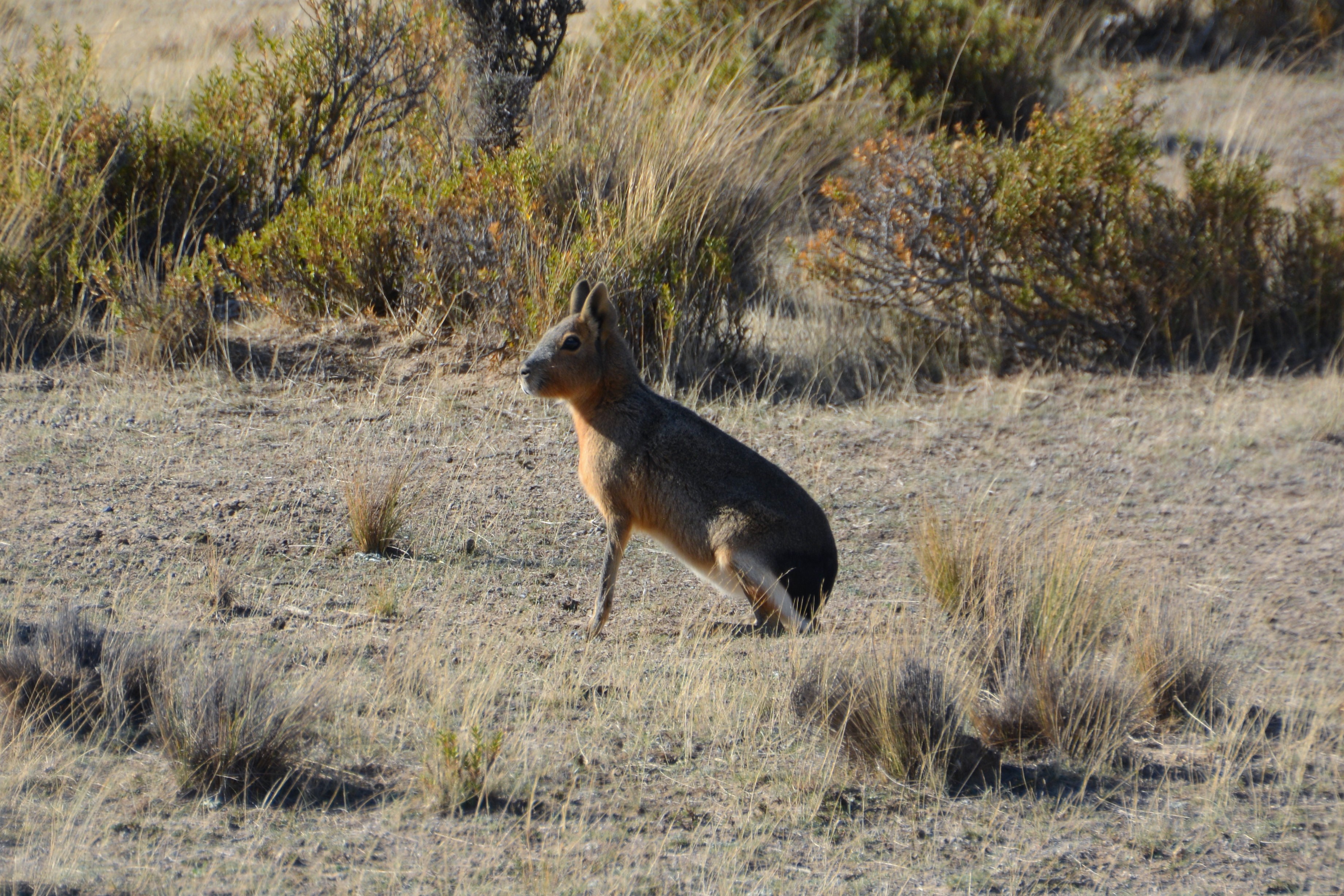 A Patagonian cavy, a strange creature with features from different animals, was happy to pose for us after crossing the road