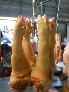 Then we moved into the building with fish and meat. Well, there was a lot of it, and as in most Thai meat markets, all parts of every animal were available for sale in any quantity, even if some parts defied belief. In rural villages we have seen small fish sliced in half and then left out in the sun to dry. In this market they would set up huge fans that would strongly blow air across tables covered in these fish. And some vendors were surrounded by huge 44 gallon drums of very suspicious looking concoctions, all of indeterminate nature, usually brown in colour and bubbling in motion, all available for sale for those who presumably couldn’t find anything else to buy.