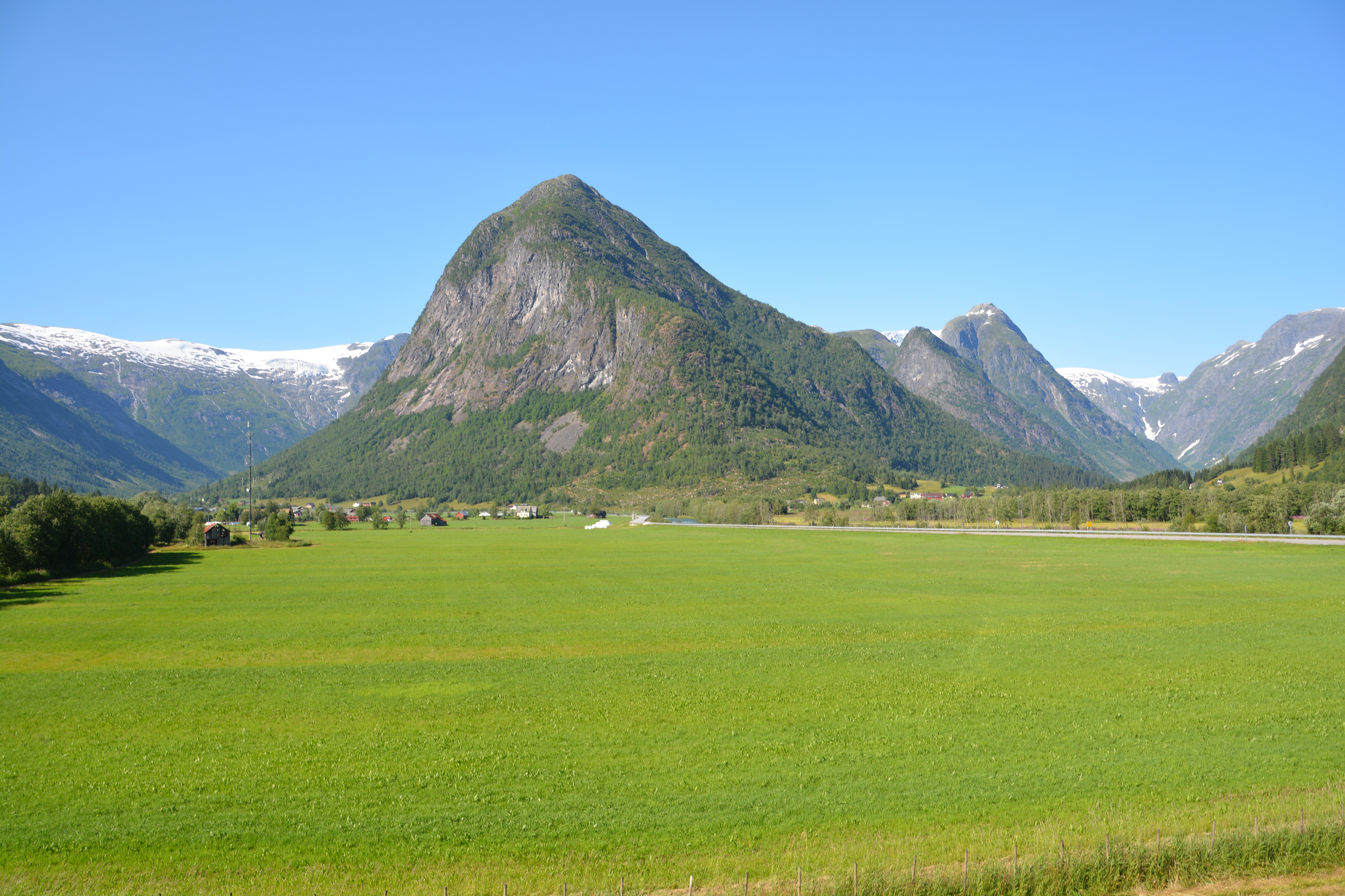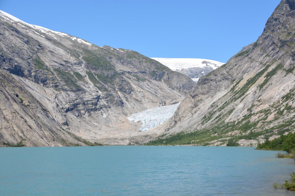 But first we detoured up a side road between two unpronounceable national parks through a narrow valley with a milky glacier-melt river flowing down the middle to the stunning Nigardsbreen glacier. You could almost imagine this glacier, still weaving its way from water’s edge to high up on the ice shelf, cutting and grinding granite as it moves ever so slowly down the valley. Our lunch scene was almost Yosemite-standards, such was its magnificence.