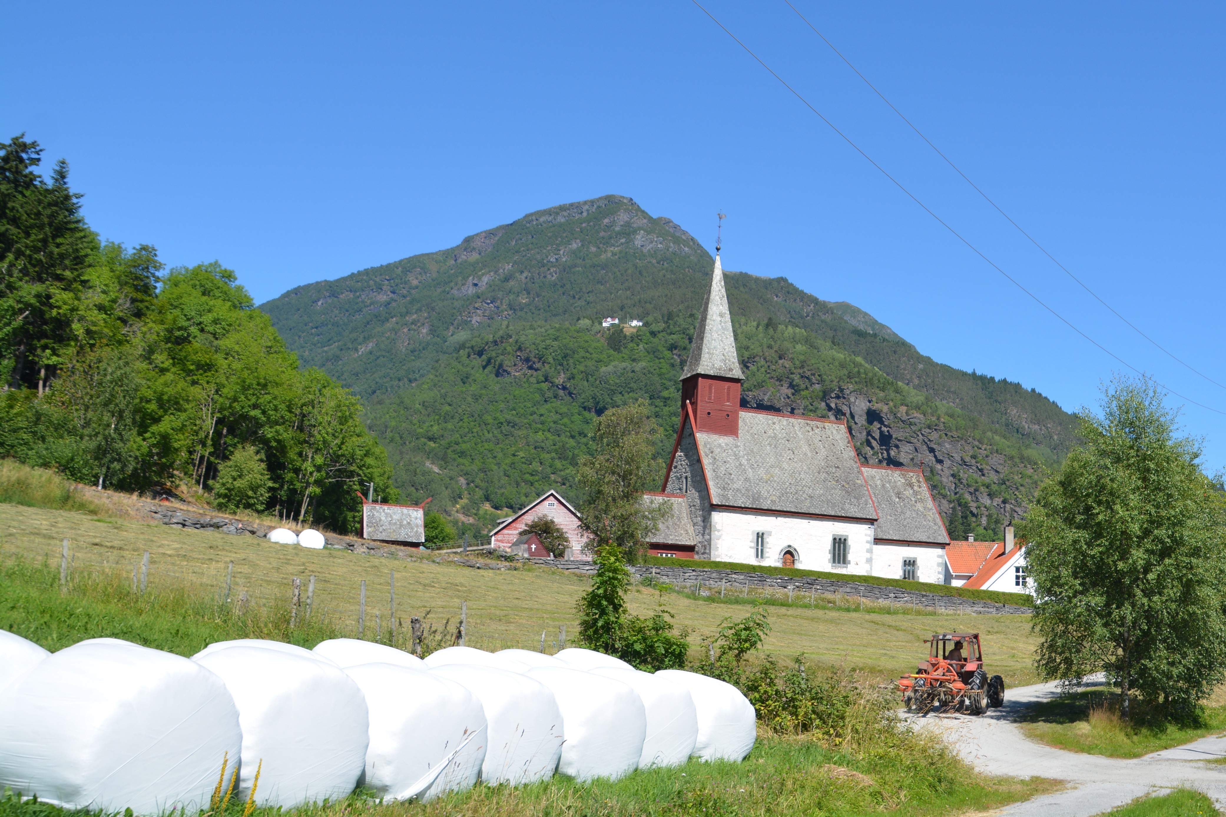The quintessential Norwegian rural scene – church with high spire, plastic-covered rolls of hay and a tractor