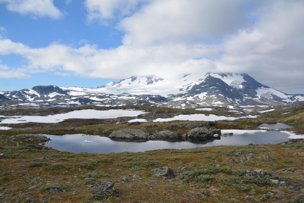 The scenic road, called the Sognefjellet, started by bordering a few deep blue mountain lakes and then tracked alongside the Lustrafjorden fjord using a narrow one lane road that involved squeezing by the local traffic as well as the ubiquitous European-sized RV’s. We were entertained by the endless display of waterfalls on the opposite side of the fjord and the little villages we passed through.