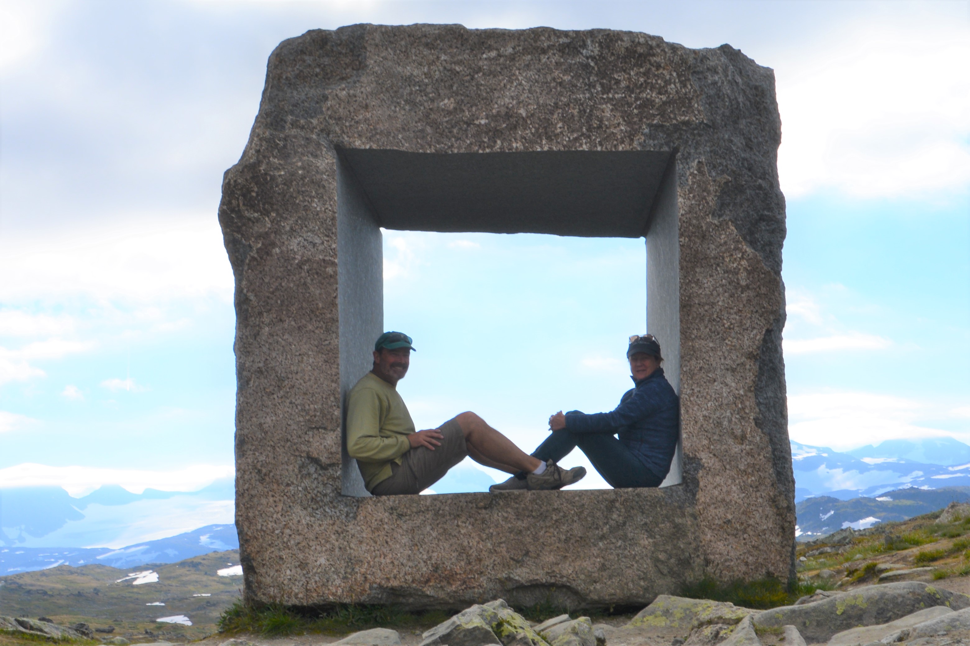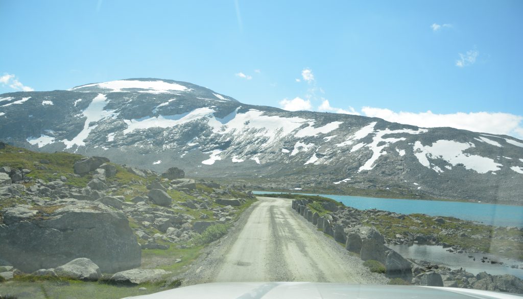 Having seen the fjords from the water level we were still pining for more so we drove up the narrow – sometimes very narrow – one lane road through a series of switchbacks to the vertigo-challenging lookout point called Stegastein and then followed one of Norway’s nominated National Scenic Routes, called the Aurlandsfjellet.