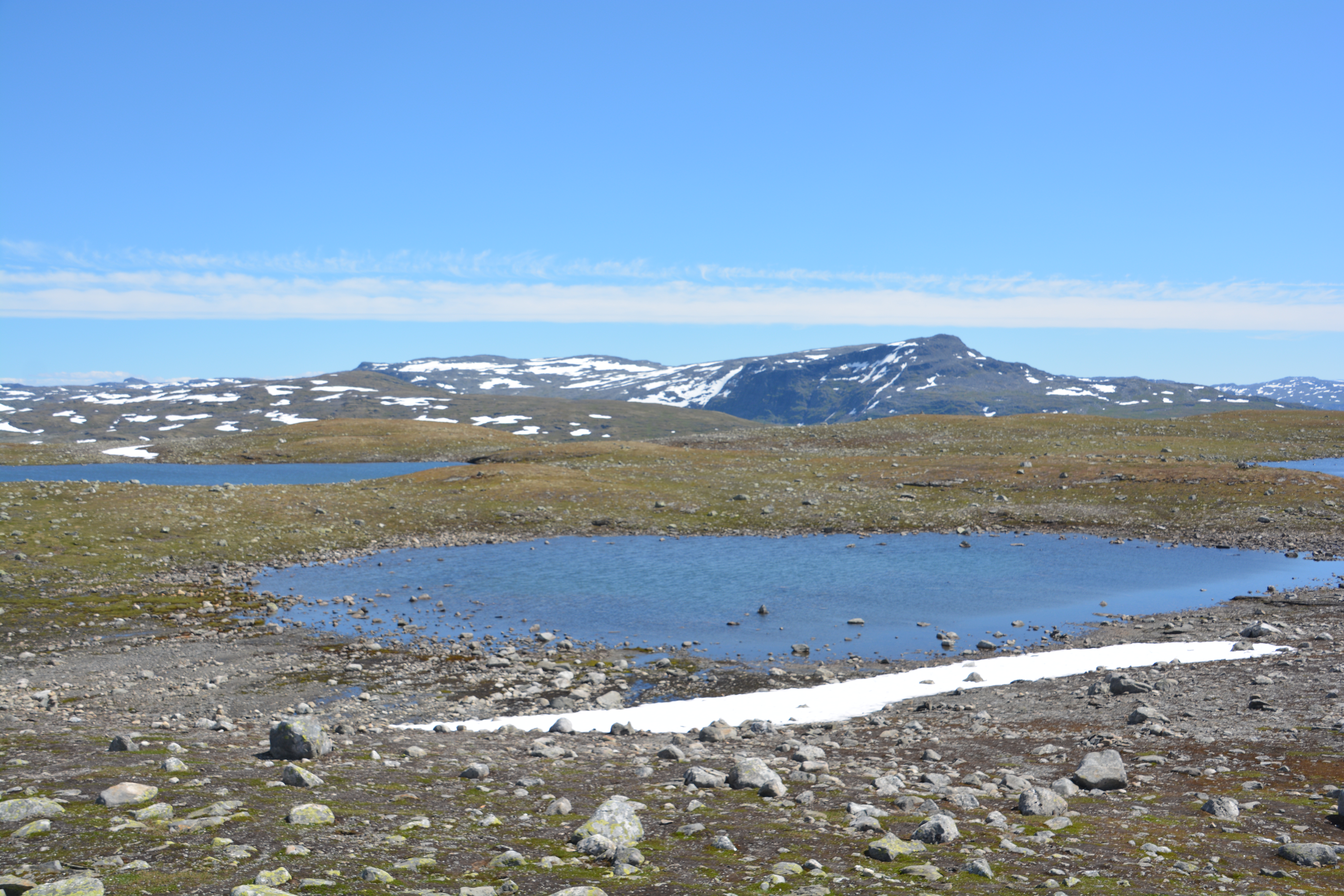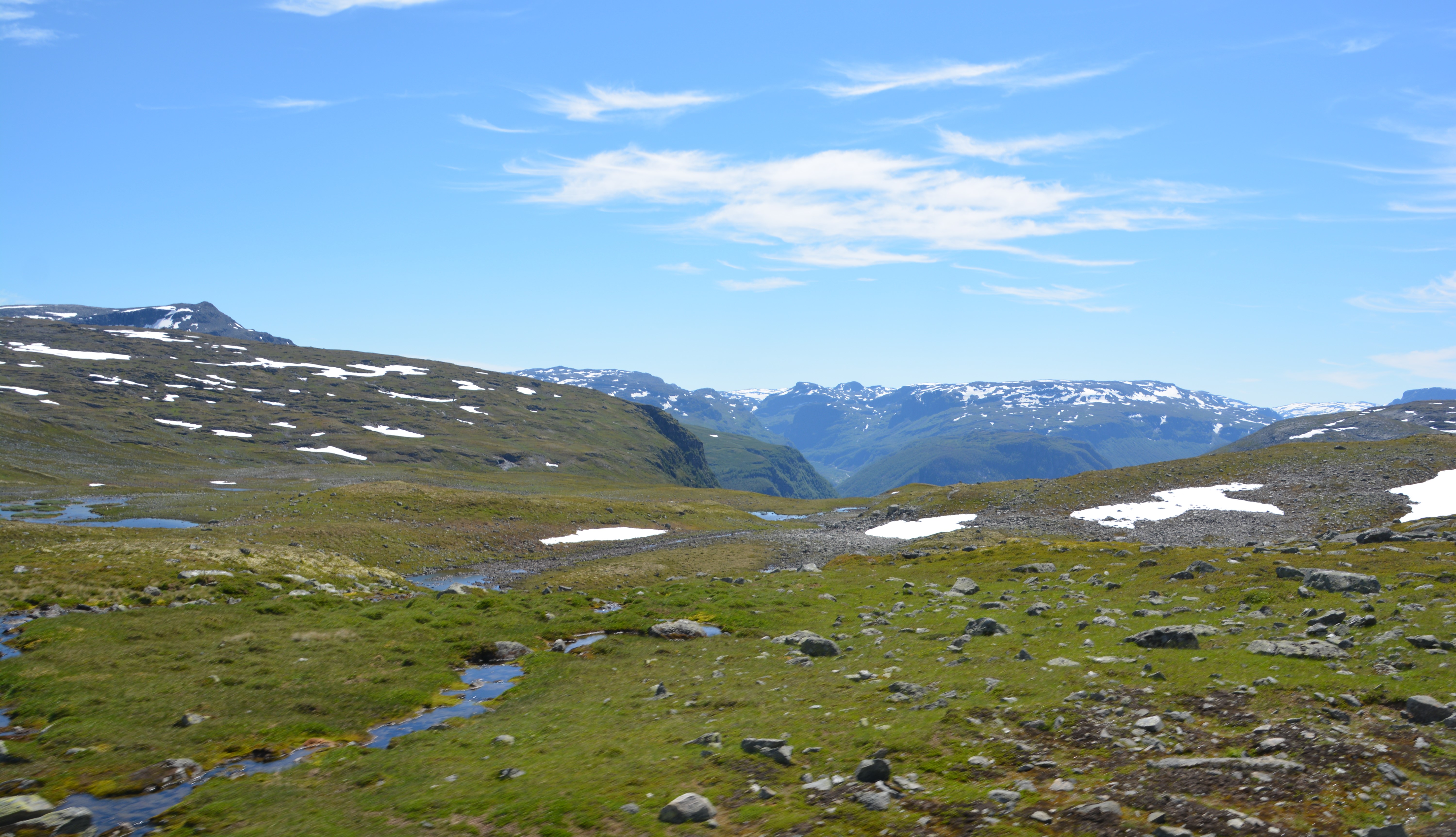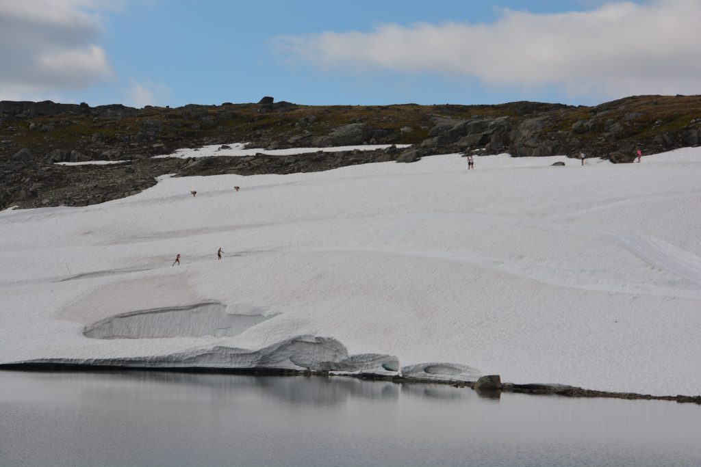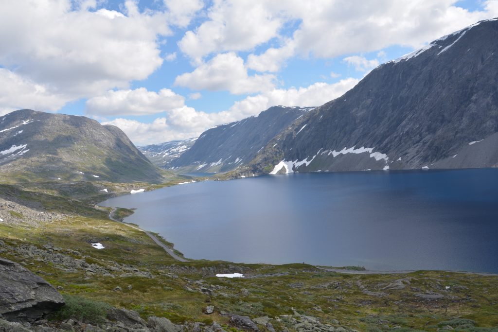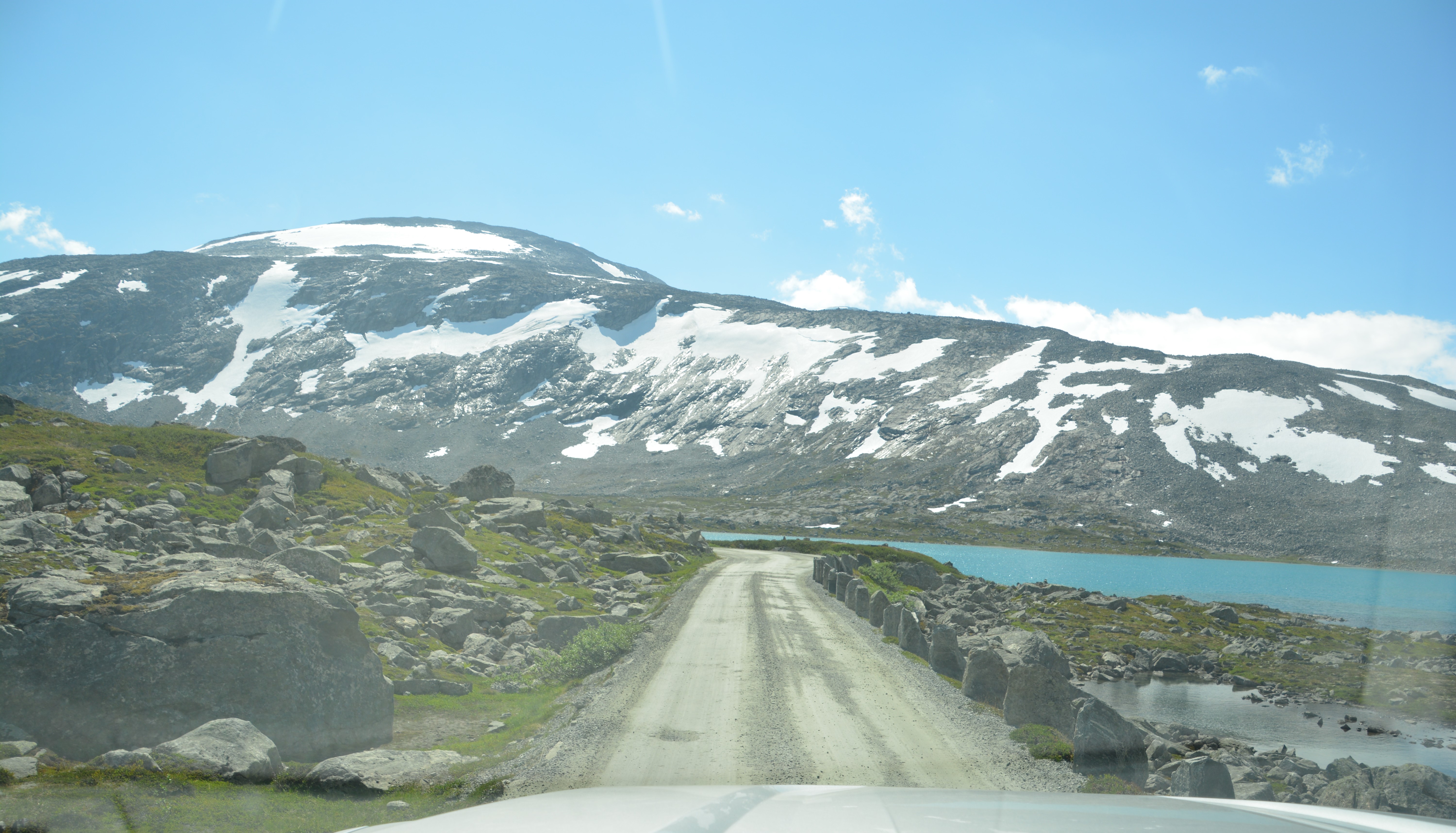 This drive, open only in summer, climbed to the top of the fjords and followed a series of ridges, dips and saddles for 47 kilometres until it dropped down into another valley and another fjord. This was fjord-viewing with a difference – high above the water, weaving through endless mountain lakes and patches of snow, stopping regularly to gasp at what laid out before us. Julie and I have had the fortune of many beautiful drives on our trip and this one is definitely a top-weight contender.