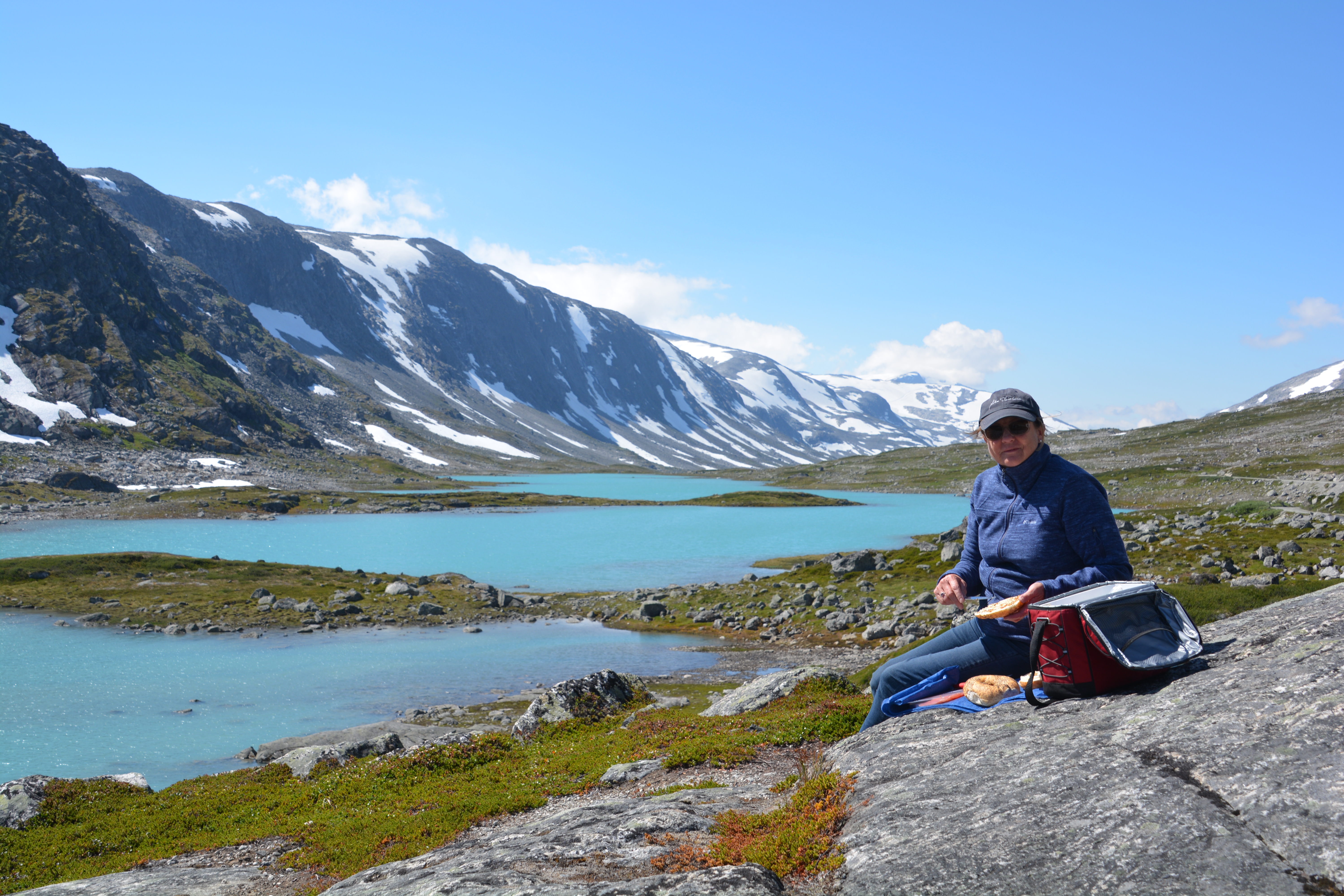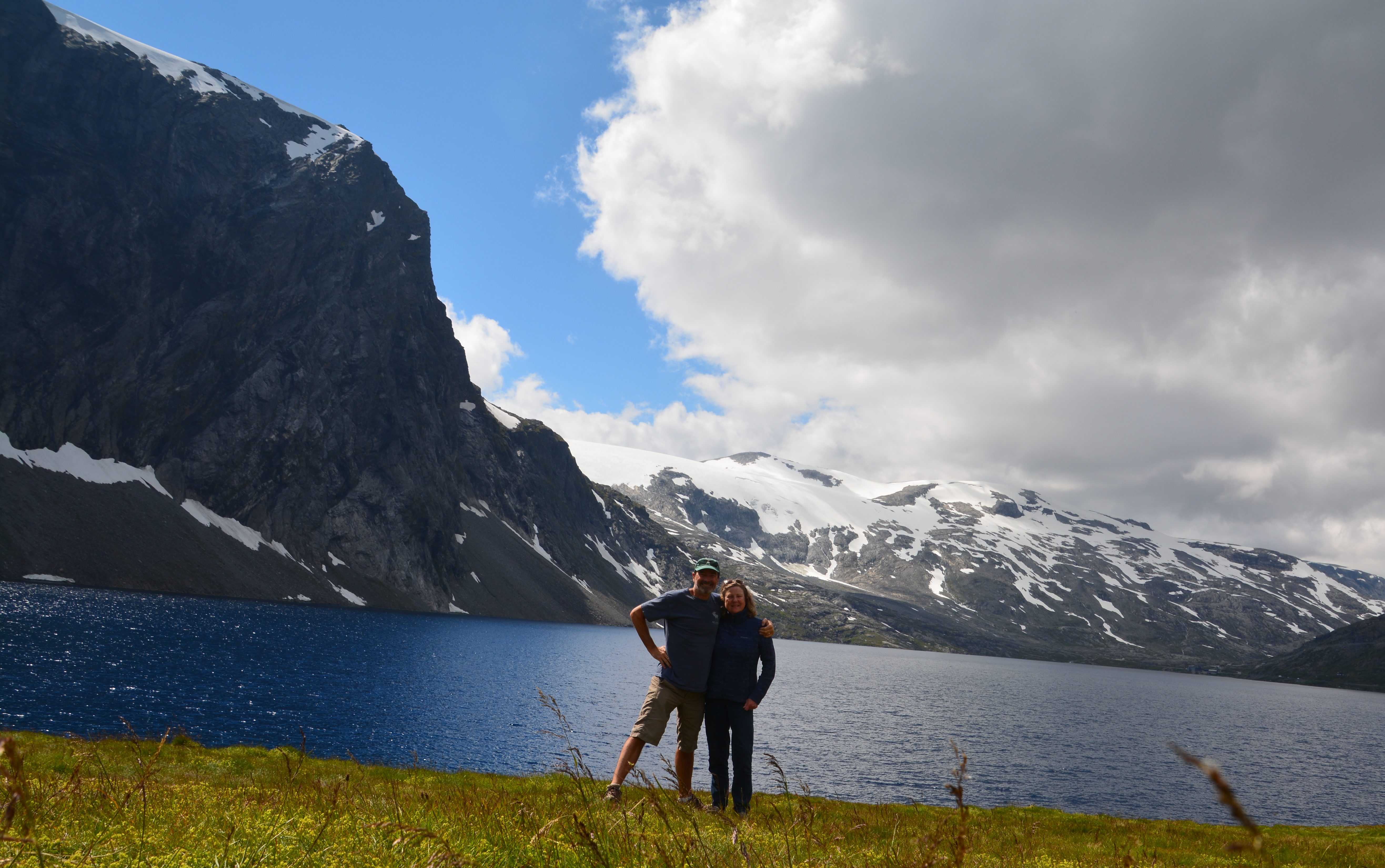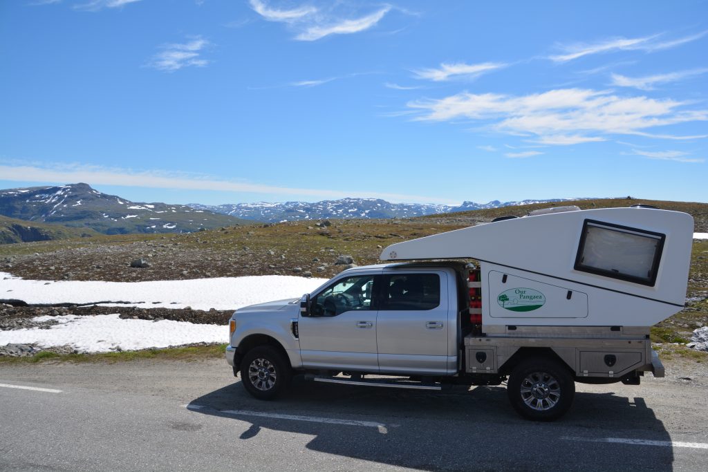 When the fjord ended the mountains began and we switchbacked up and over the mountains, first surrounded by sharp snow-capped peaks, then driving through them, every lookout providing million dollar views. It was such a fabulous setting we decided not to descend the other side yet and camped at 1,370 metres (4,500 feet), our first free camp in Europe, glaciers just above us, glacier-melt lakes in front and behind us, snow patches dotting this extraordinary scene.