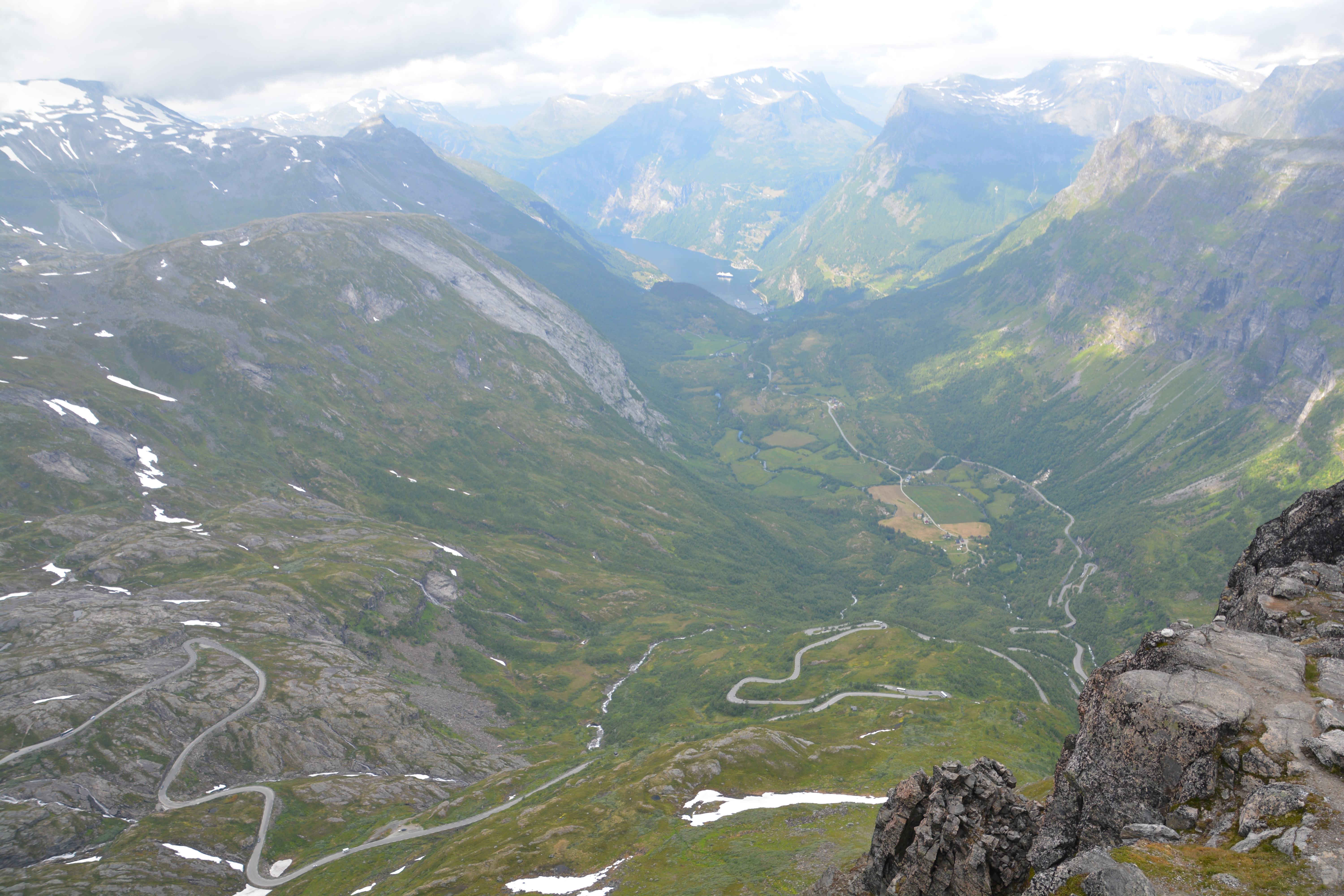 The clouds lifted just enough for us to get the full view from the Skysslag – our winding road down to the famous Geiranger Fjord with three cruise ships barely visible in the distant background