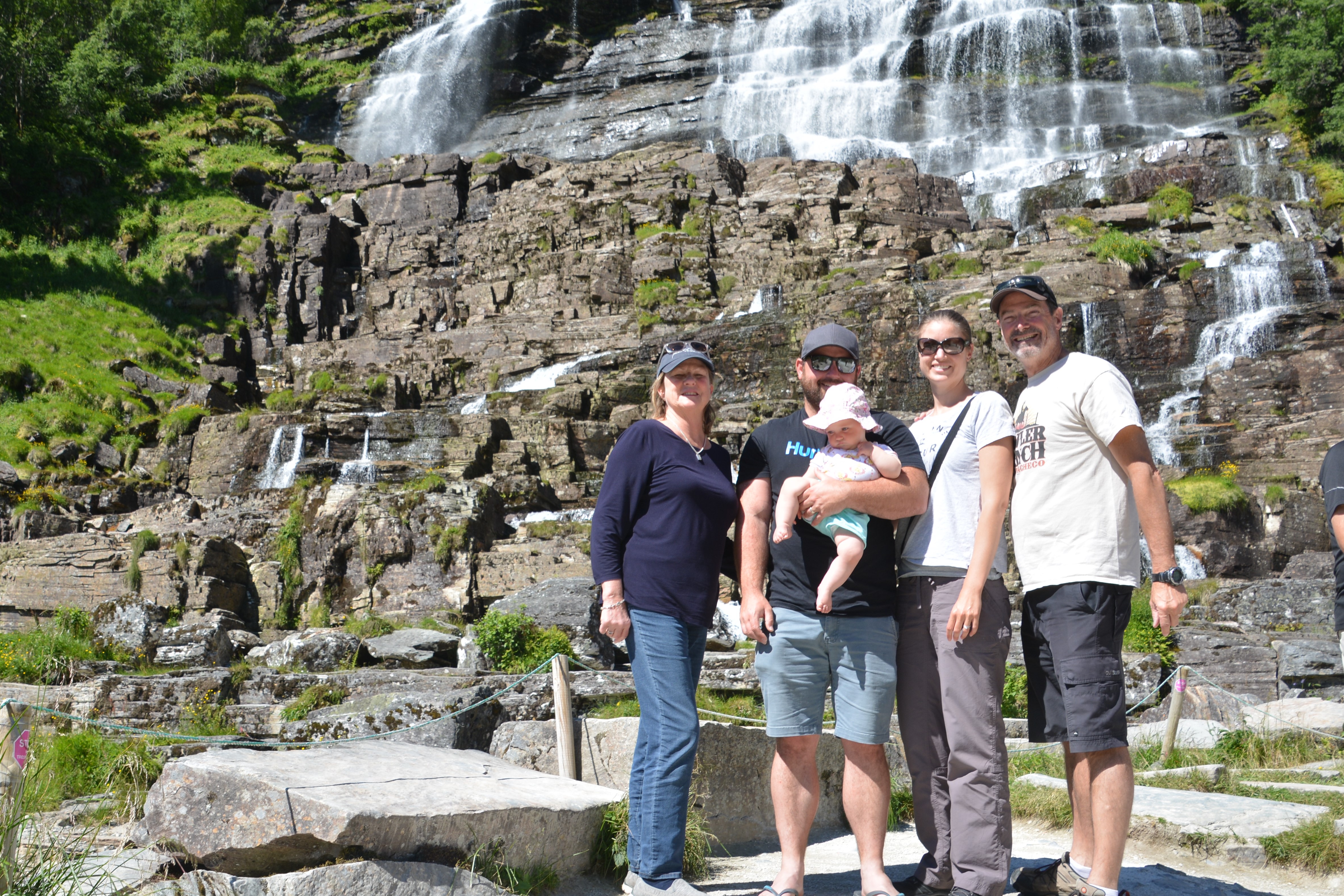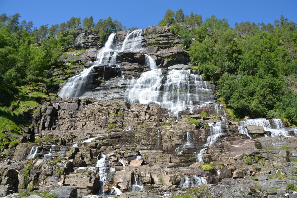 Our target for the next couple of days was the huge Sognefjord Fjord and to get there from Bergen we followed a string of minor fjords, glacier-carved lakes, racing mountain streams and deep green valleys through the summer playground centre of Voss and stopped at the magnificent Tvinnefoss Waterfall. Disneyland couldn’t have created a more picturesque scene of water finding different paths to bounce down the steep rocky slope. A great place for lunch.