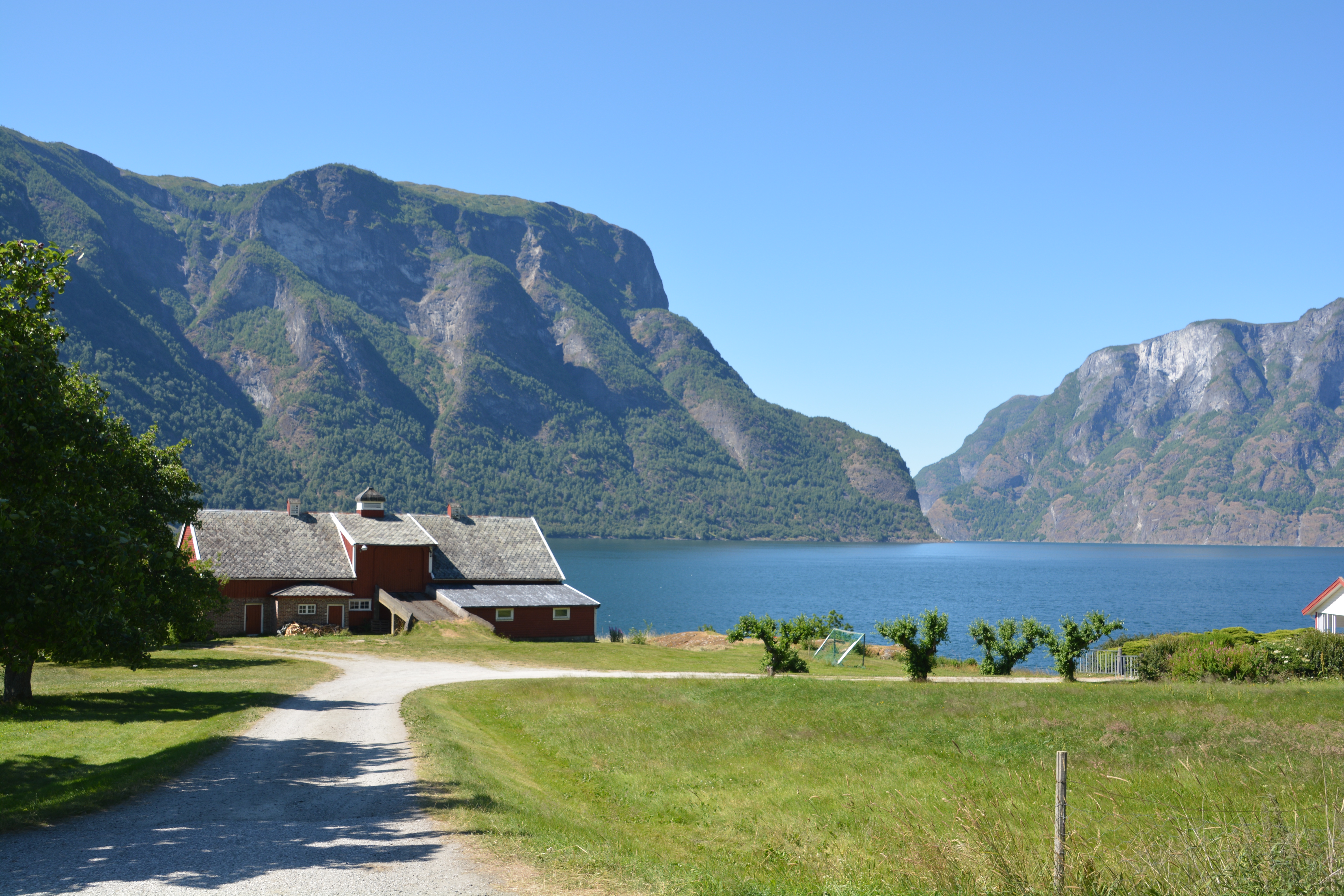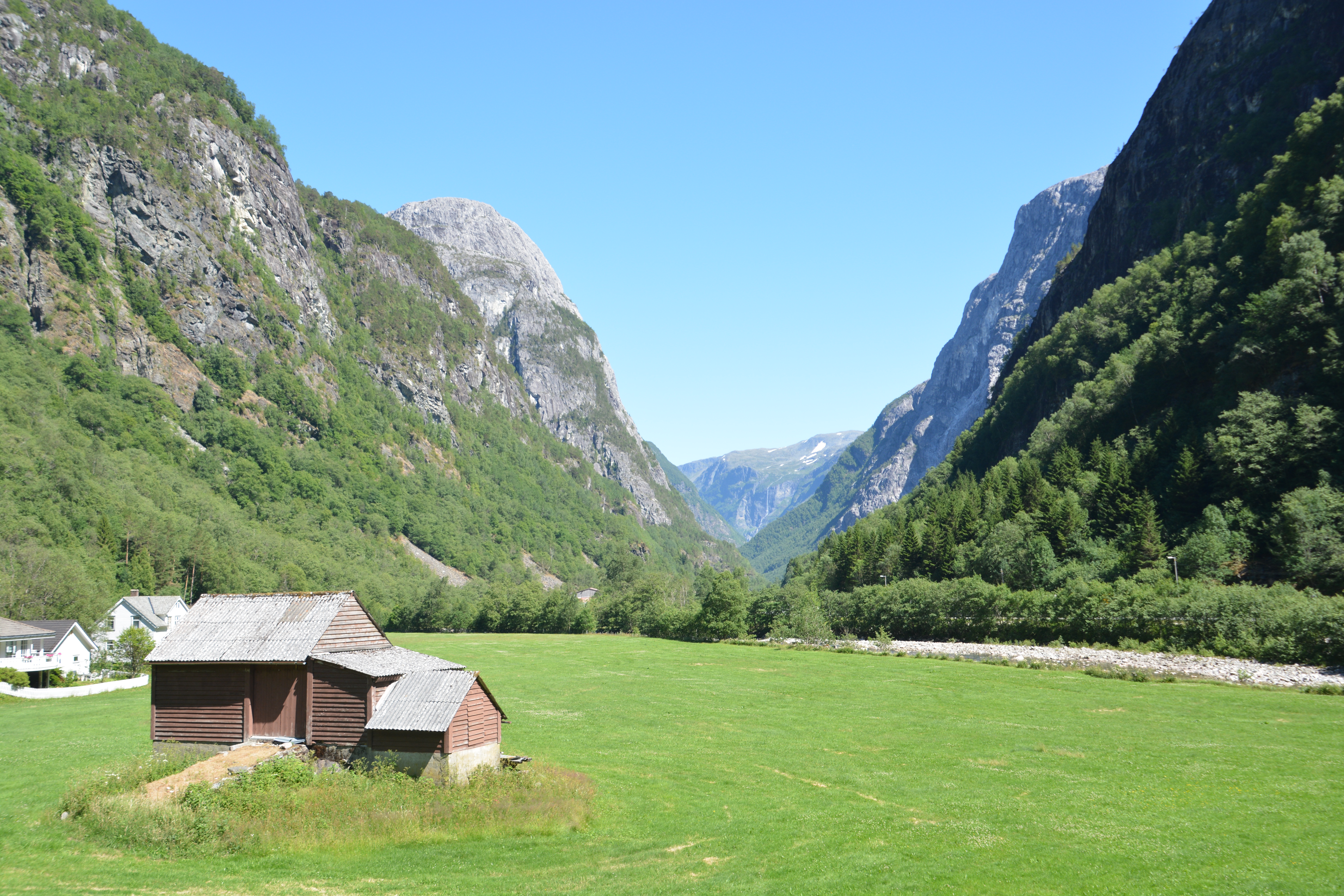 After a 12 kilometre (7.5 miles) tunnel, breath of fresh air and another 7 kilometre (4.4 miles) tunnel we popped out at the small town of Flam which is beautifully positioned at one of the ends of the Aurlandsfjorden. We camped that night in the nearby town of Aurland, nothing more than a village clinging to the steep mountain face, with a beautiful mountain-fresh stream passing just next to our camp. The temperatures were unseasonably high, the skies perfect blue and the land paradise green.