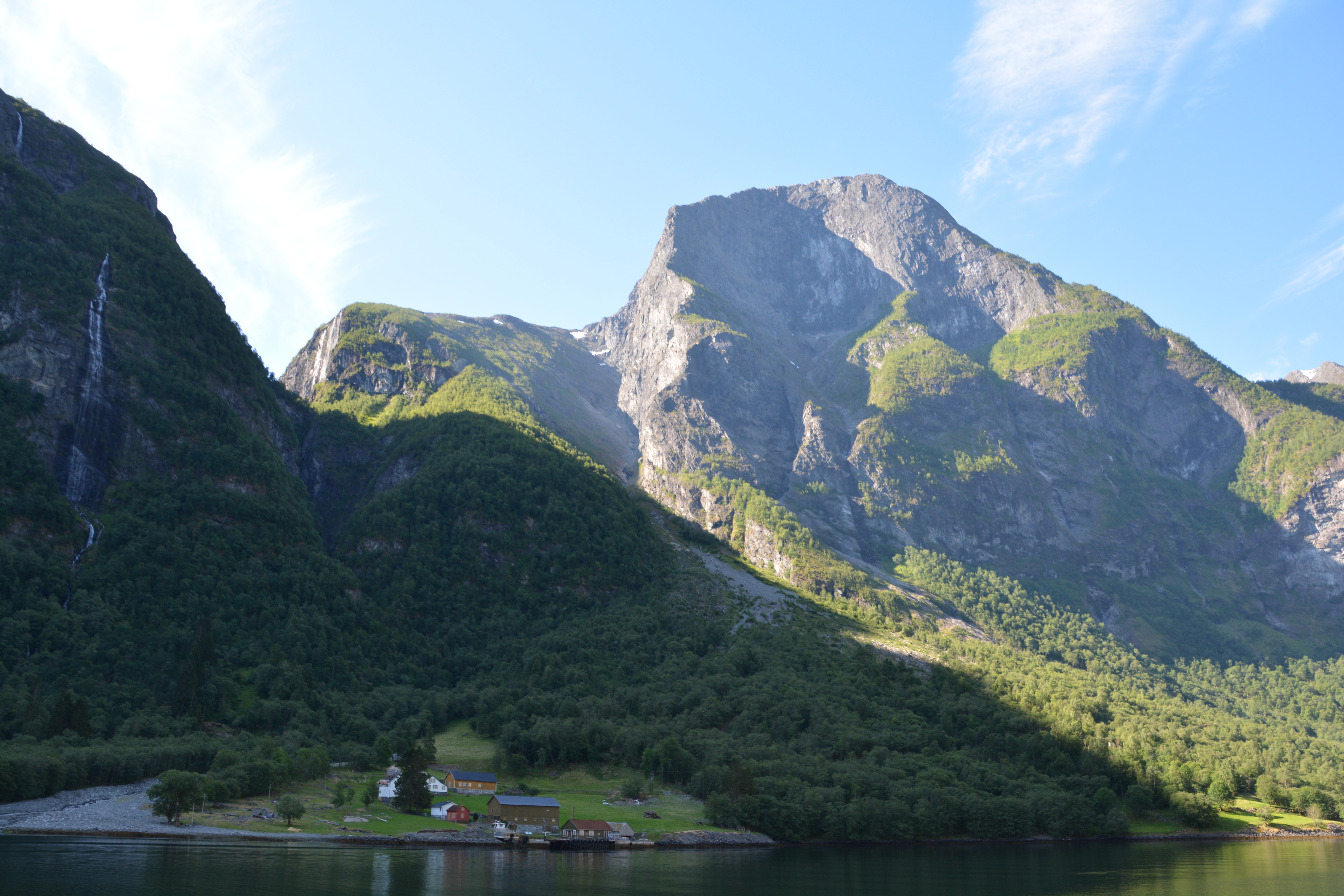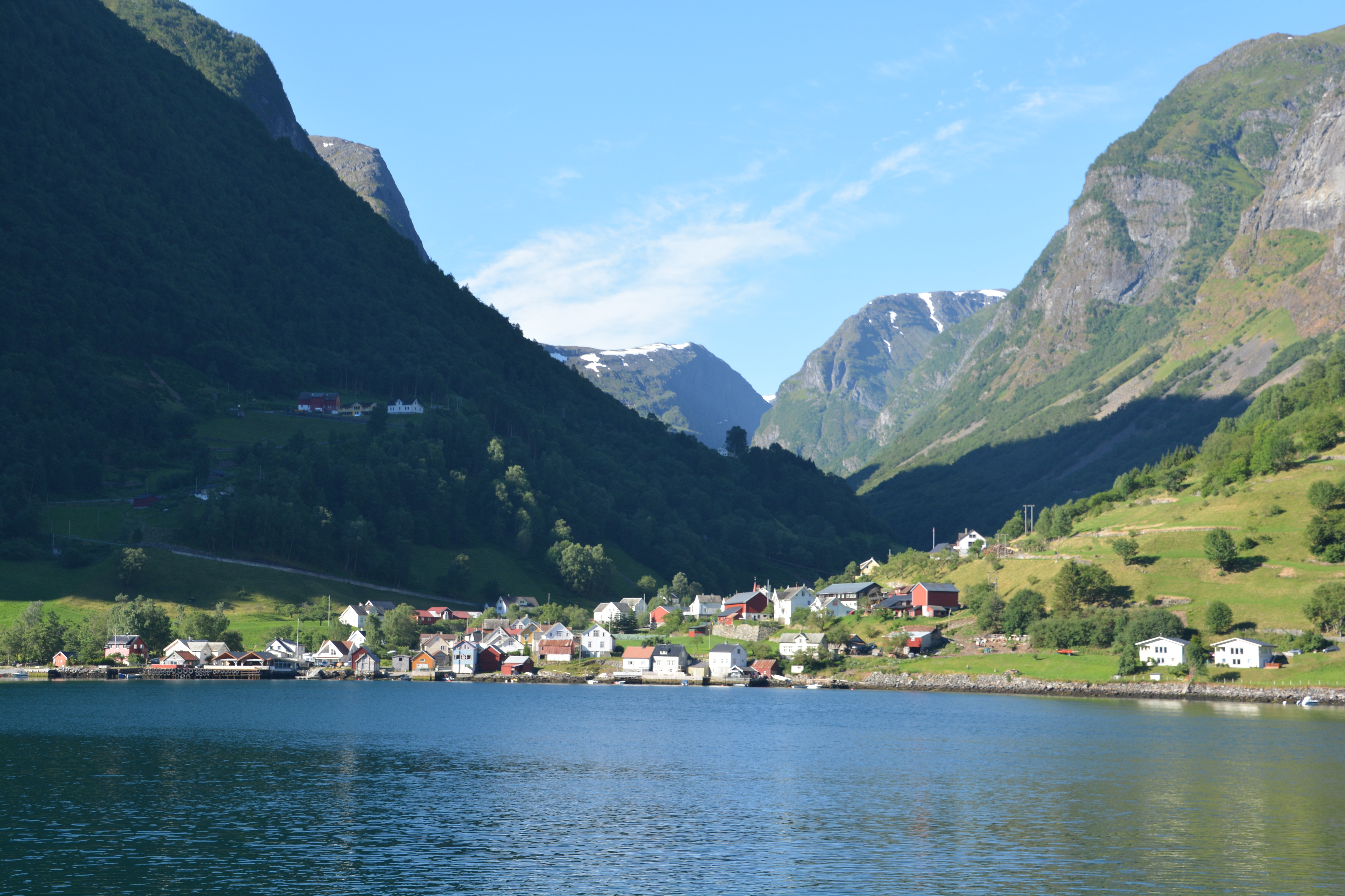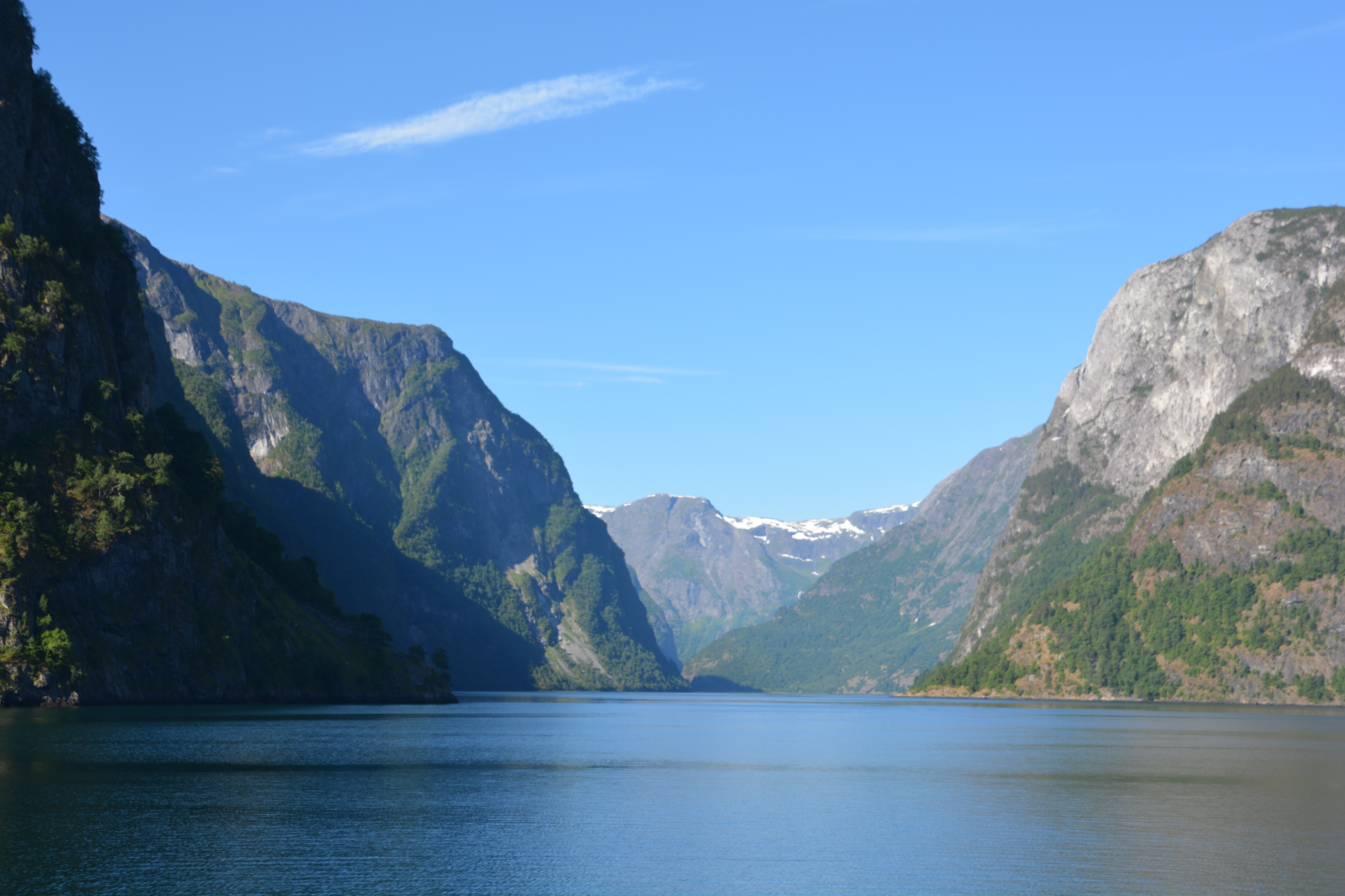 The next morning we caught the ferry which took us up the Aurlandsfjorden and then turned down the narrow Naerofjorden to the ancient Viking town of Gudvagen. This UNESCO World Heritage fjord must be one of the true gems of that illustrious list – still dark blue waters, high near-vertical walls, waterfalls pouring off everywhere, snow patches topping the mountains. At the narrowest point the fjord was only 250 metres wide and the walls soared almost 1,000 metres above us.