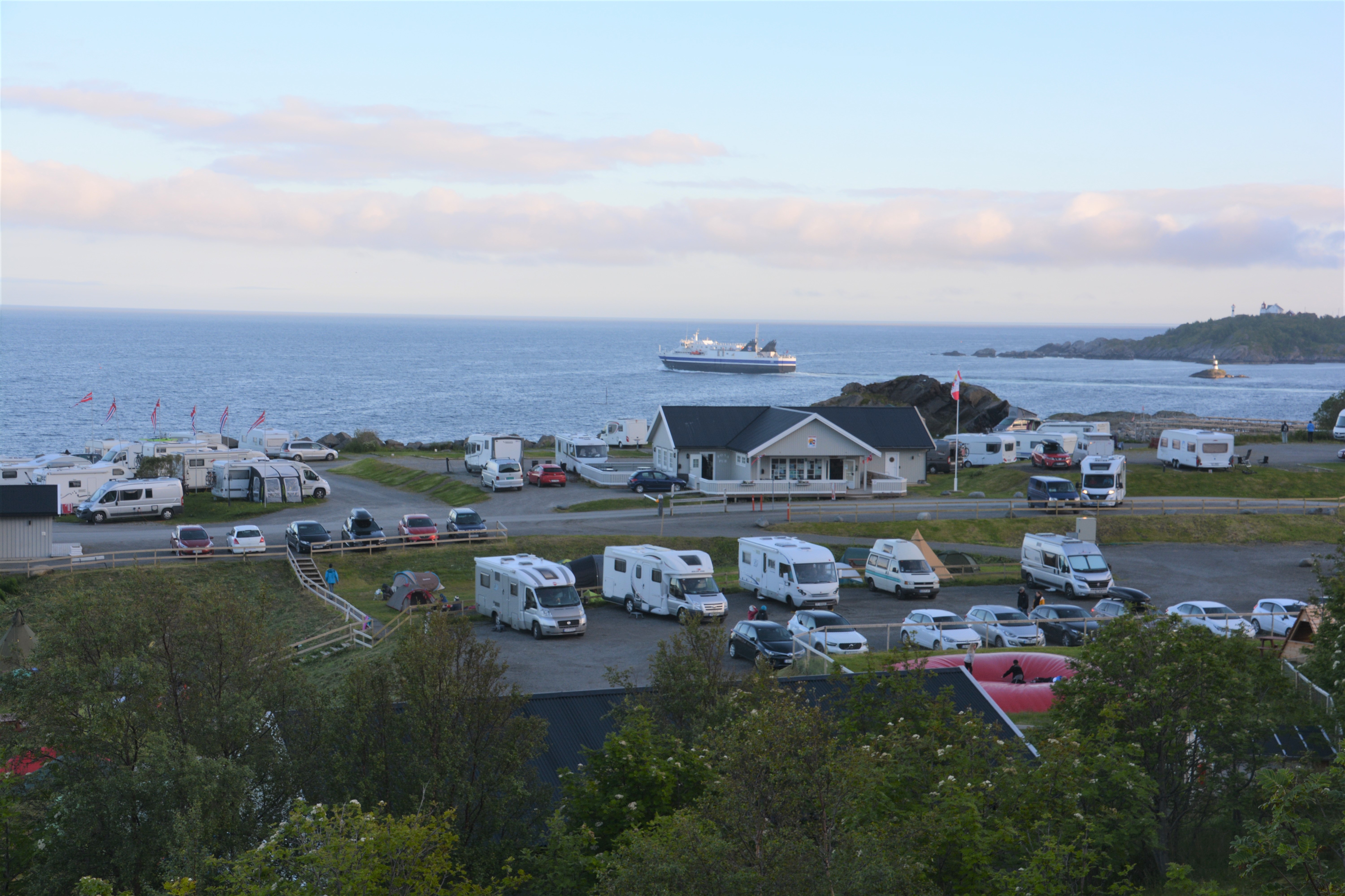 The view from our campsite the first night in the Lofoten Islands – see our ferry heading back to the mainland and all the European-sized RV’s in camp
