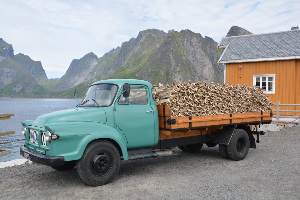 The history of the Lofoten Islands, and to some extent Norway, is about fishing and in particular the fishing of cod. Without the swarms of cod coming down from the Arctic waters every January to April this fabulous coastline wouldn’t have had any settlers, including the mighty Vikings who relied on cod for their food and for trade with other lands. Dried and salted cod was the daily diet for people to survive through the harsh winters and it was one of the country’s main exports until the discovery of oil. The fishing industry is still a major part of the culture and economy of Norway.