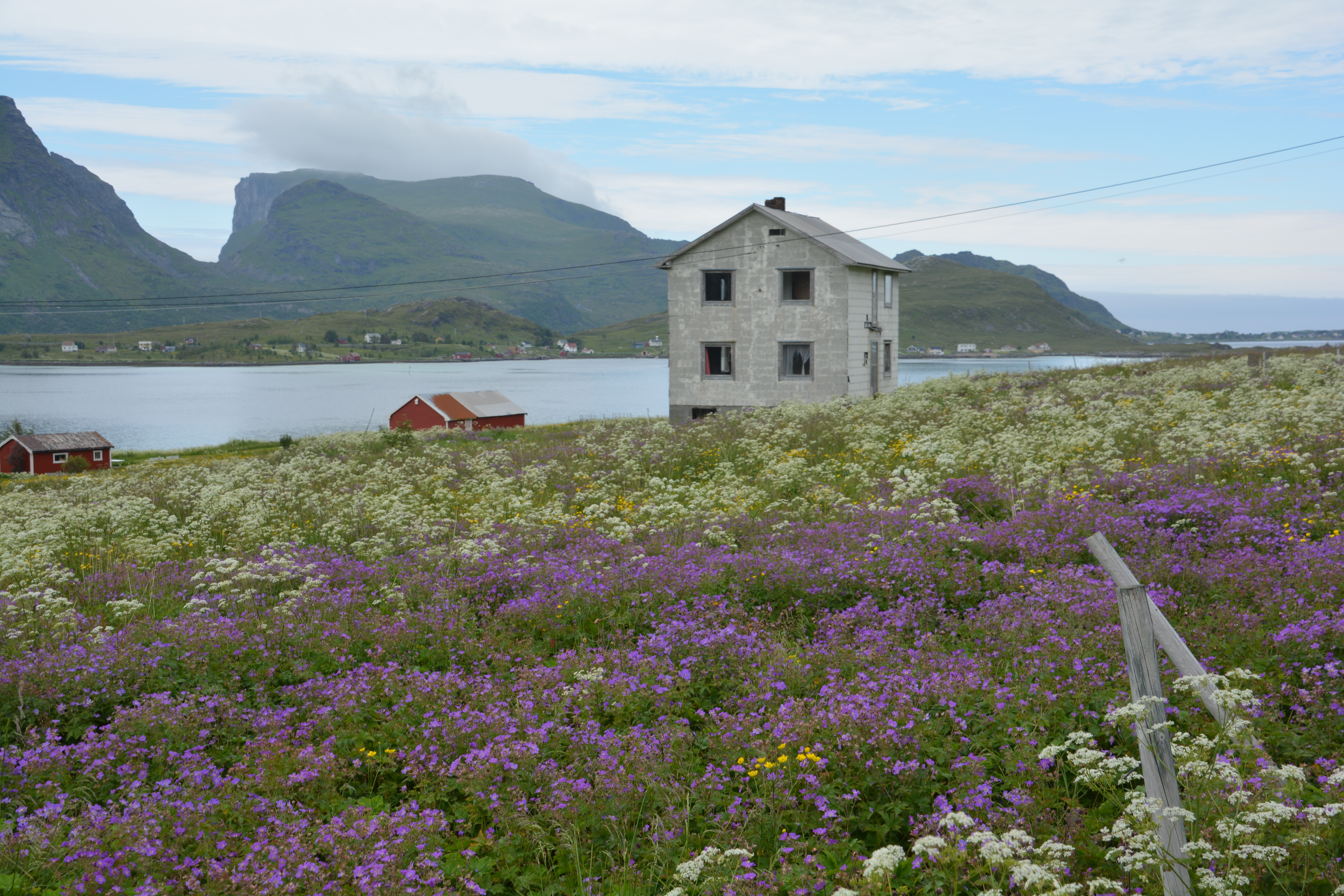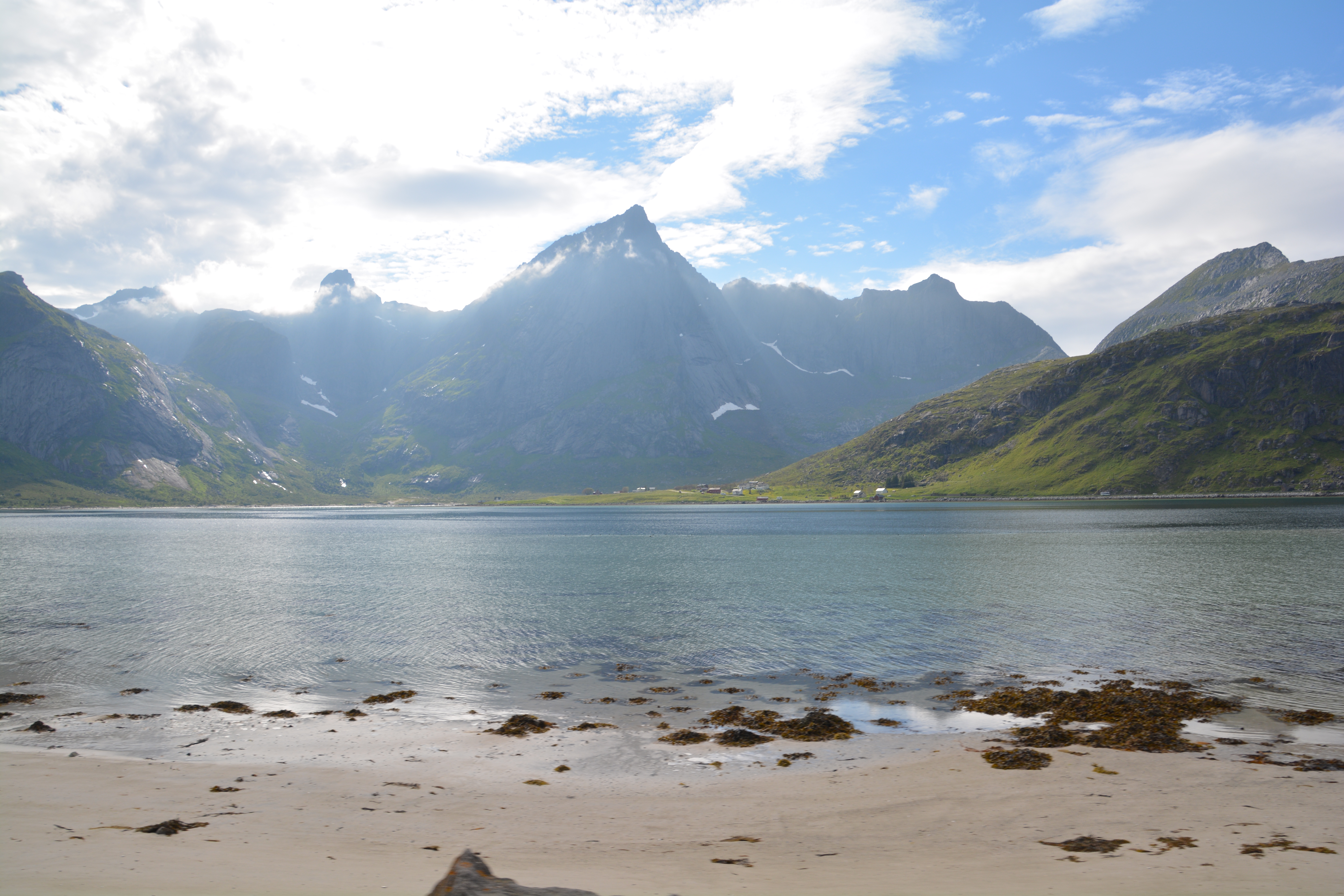 We drove further north, making slow progress as we stopped at the huge wooden racks drying cod in the sunlight, then coming across a spectacular long sandy beach that would have been more expected in California or Australia, then heading up another glacier-carved valley for a historic fishing village like no other. It was slow going and we gave the camera a serious workout.