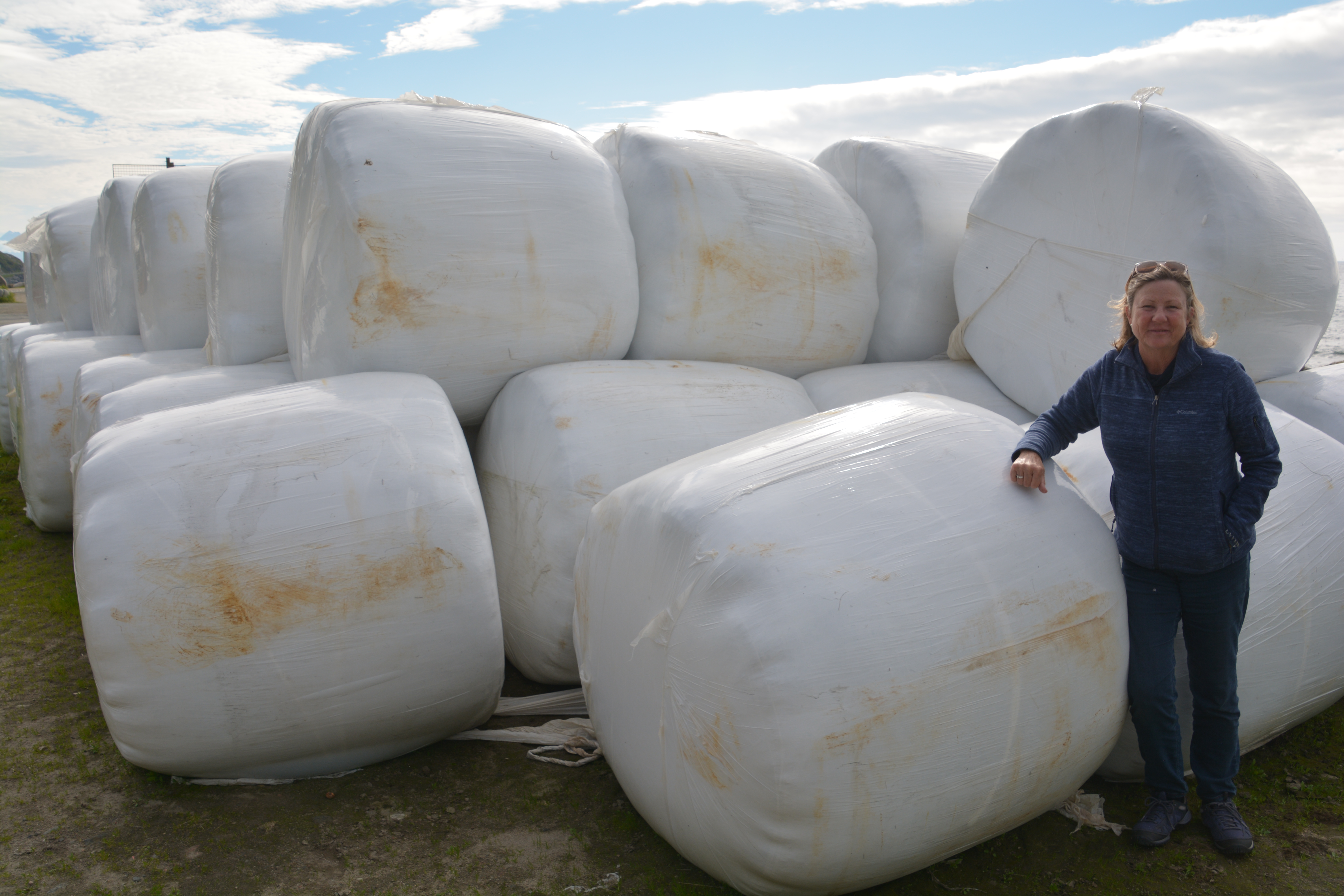 The islands even had a little bit of agriculture – here is Julie hanging out with giant marsh mallows masquerading as rolls of hay