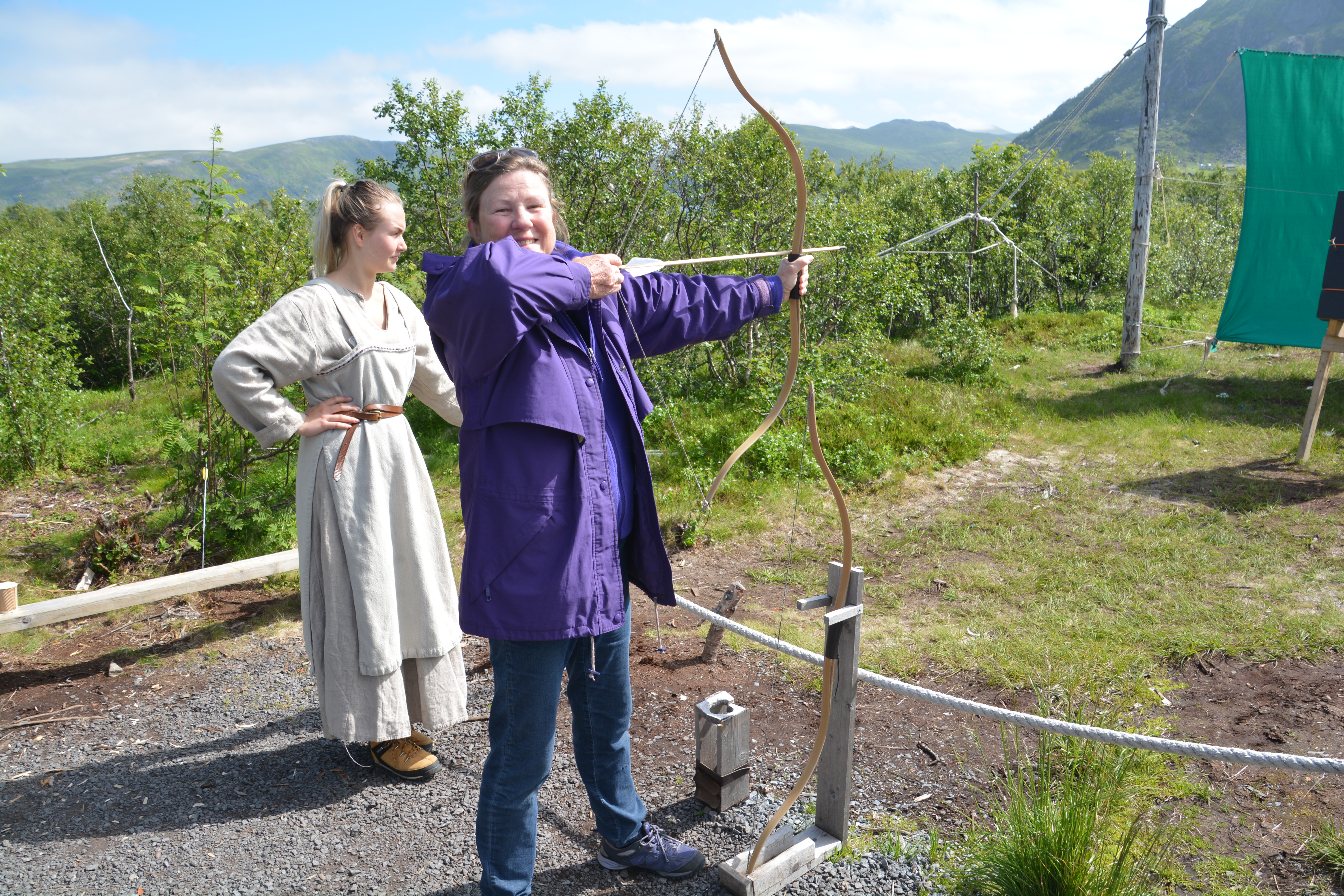 The main road of the island weaves its way past the waterways, around the mountains (or sometimes right through them!) and connecting the little fishing villages that dot the beautiful landscape. We continued north and stopped at one of the highlights of the islands, the Viking Museum. This museum compliments the other Viking museum in Oslo in that it has a reconstructed long house that was dug up here 35 years ago and provides activities for families such as sailing on a Viking ship, Viking meals, riding horses, using Viking bows and arrows and, yes, axe throwing.