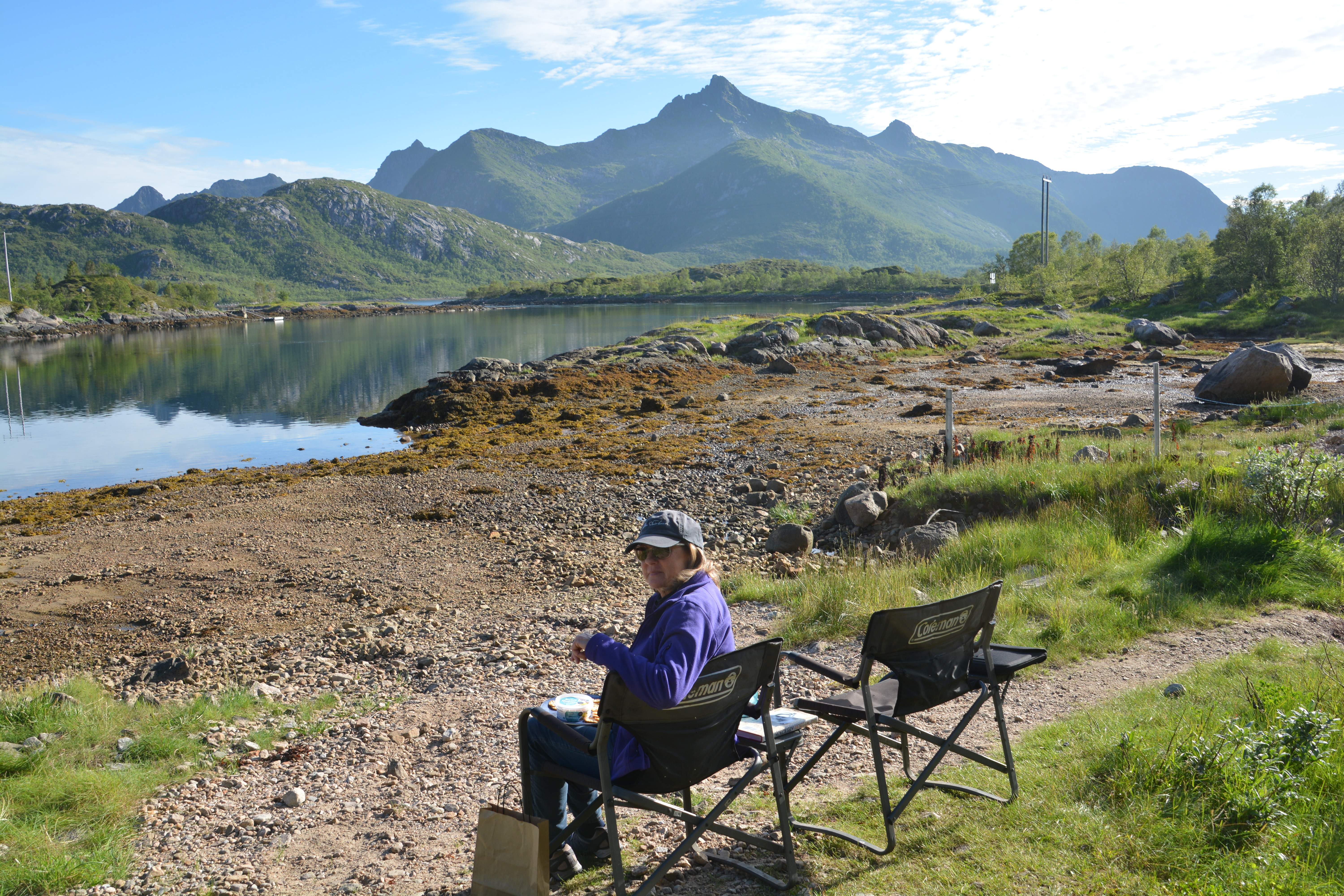 We continued northward along this dramatic landscape, island hopping across amazing bridges, marvelling at the idyllic summer scenes. We stopped in the little fishing village of Hemmingsvaer, the small historic town of Kabelvag and the island group’s largest town of Svolvaer (population 4,500!). We camped that night on the banks of a little offshoot of the Austensfjordrn Fjord, a warm sun till past our bedtime, a million bugs attacking us, the mountain scenery soothing us.