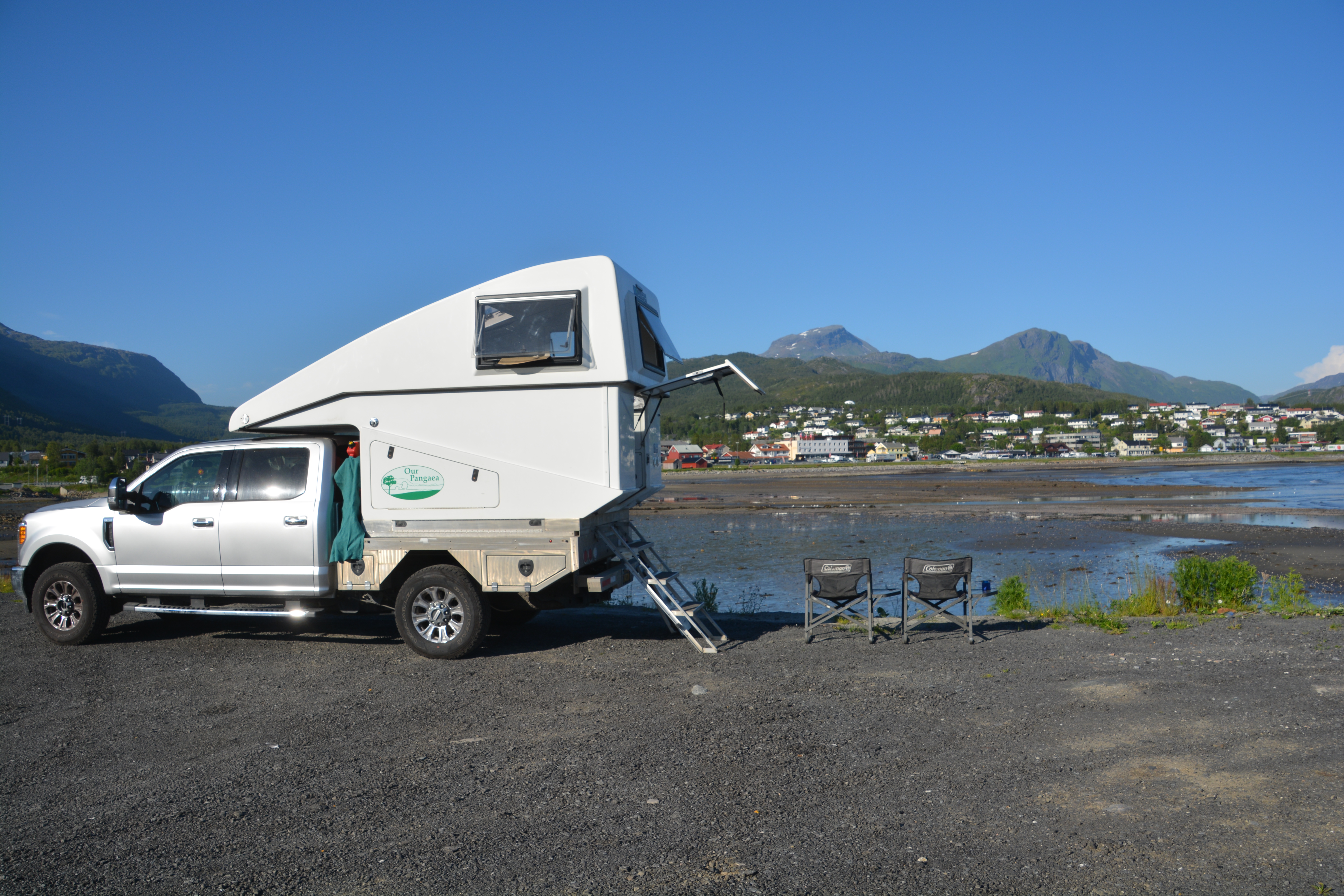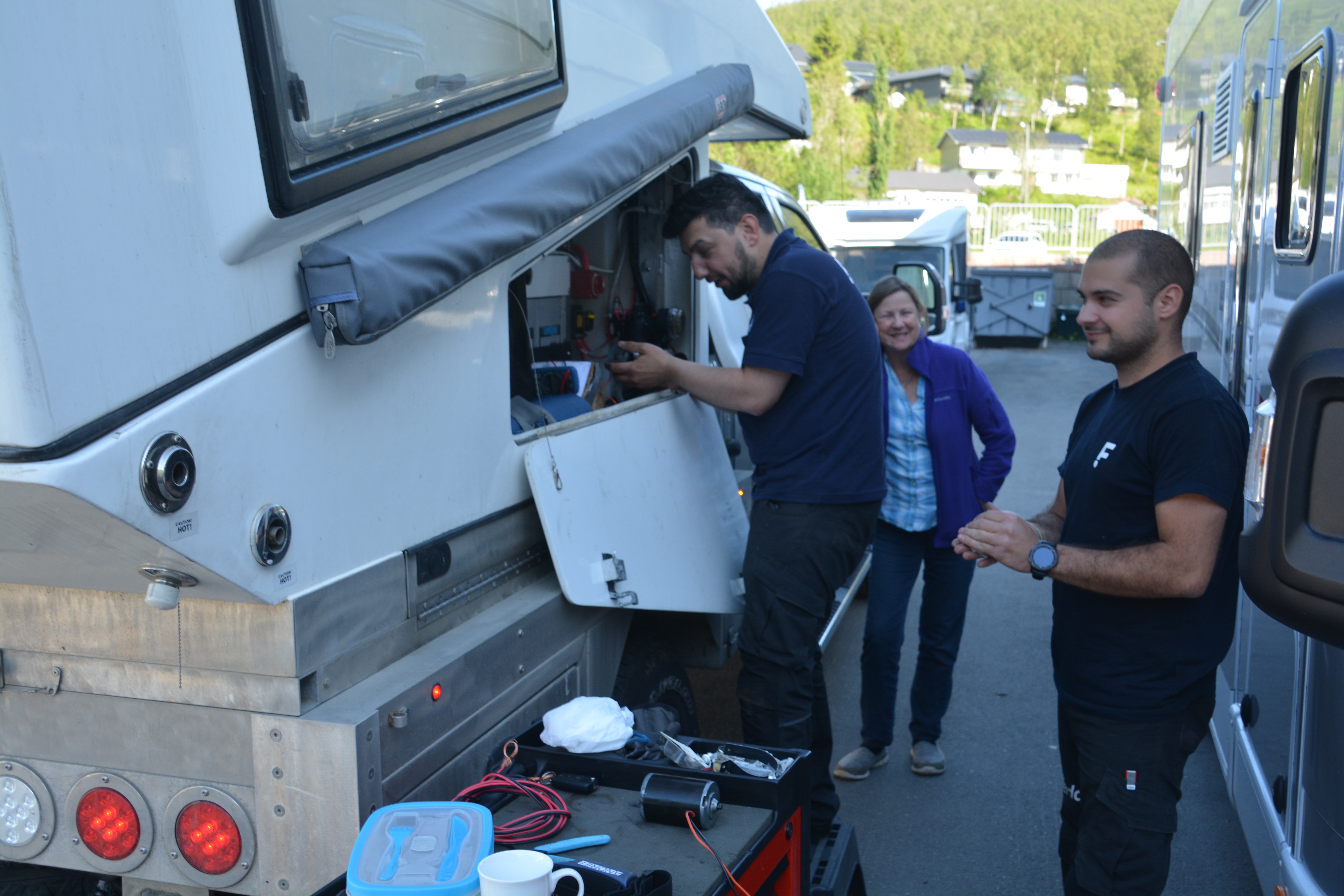 XP Camper provided a replacement motor while we were briefly in California but their support dried up after that so our next task was to find someone locally who could swap out the new for the old. And that someone was the good people at Ferda Caravans in beautiful Bjerkvik who took on the task despite it being after-hours and way out of their normal duties. It wasn’t an easy job given the awkward location of the motor but they eventually swapped out the motor and then asked us to pose for photos in front of our Aussie flag on Tramp. So if you’re ever in the neighbourhood and need work done on your camper or caravan we would recommend you call into Ferda Caravans in Bjerkvik. Tell them Bill sent you.