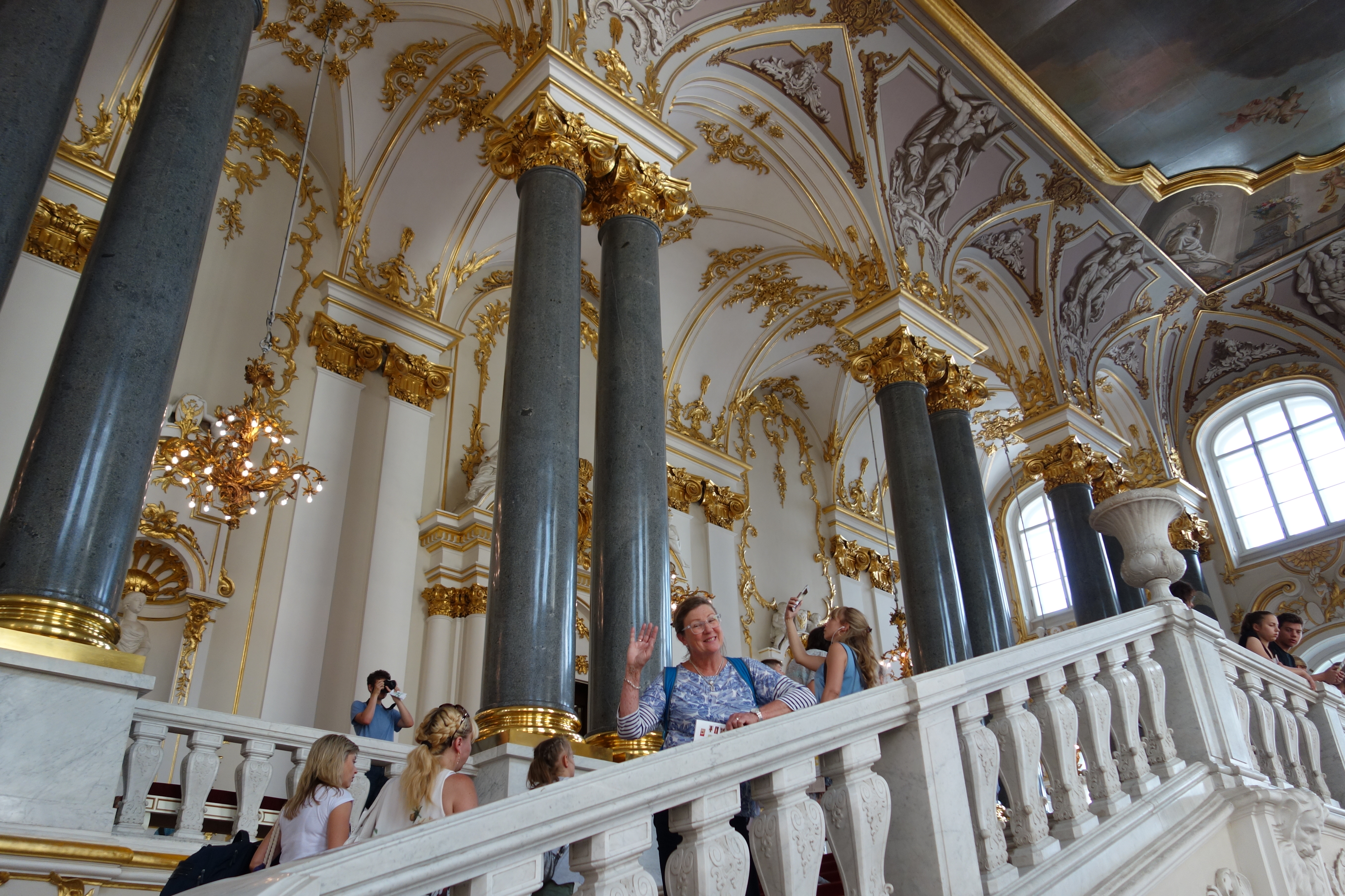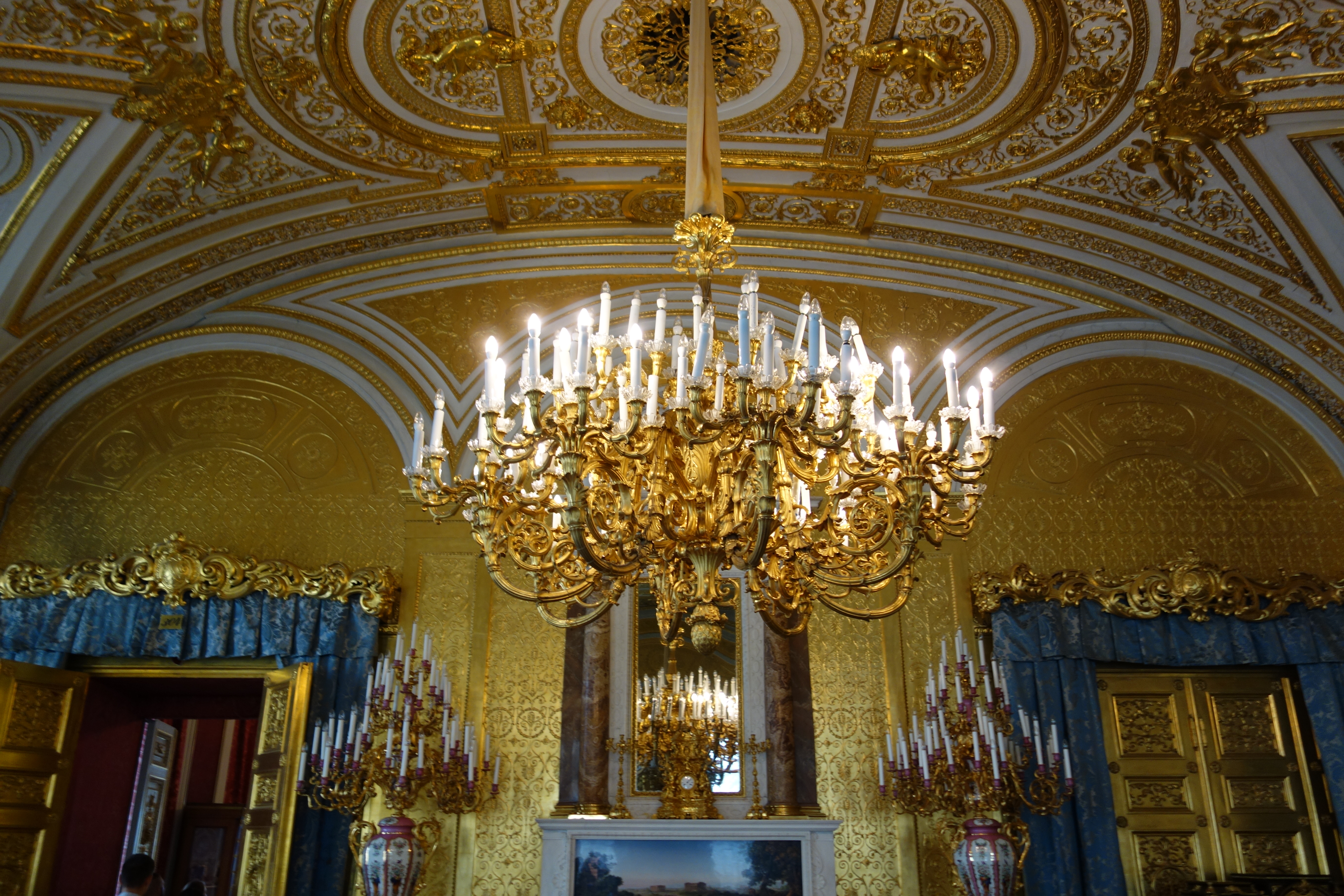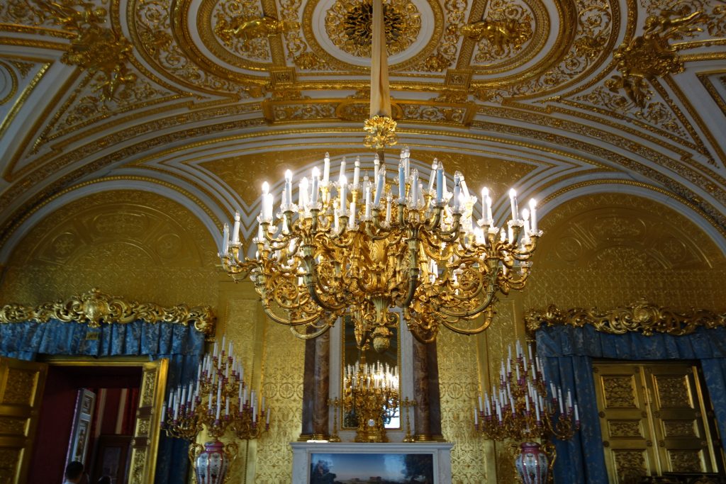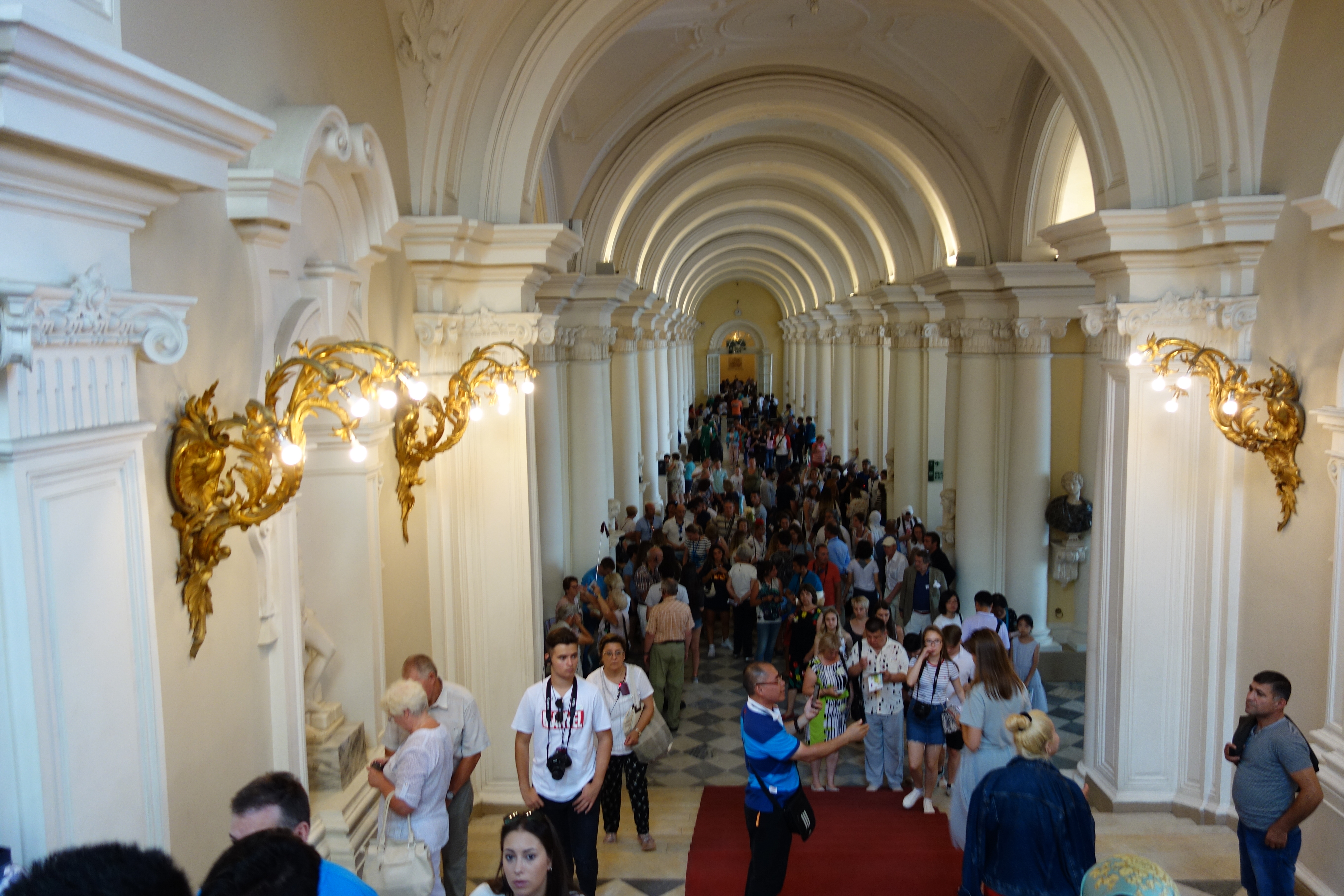 We had allocated about four hours to explore the museum before expecting to run out of museum-puff and needing to get on the road towards Moscow. As it turned out, of those four hours two of them were spent standing in the 32C/90F sun queuing for tickets and the other two hours were spent inside shouldering through thousands of people in hot stagnant rooms. It was an extraordinary experience, shuffling through hundreds spectacular rooms, splattered in gold, huge chandeliers, 15 metre ceilings, the exquisite furniture, the flooring, windows and drapes, just numbed by the splendour of it all.