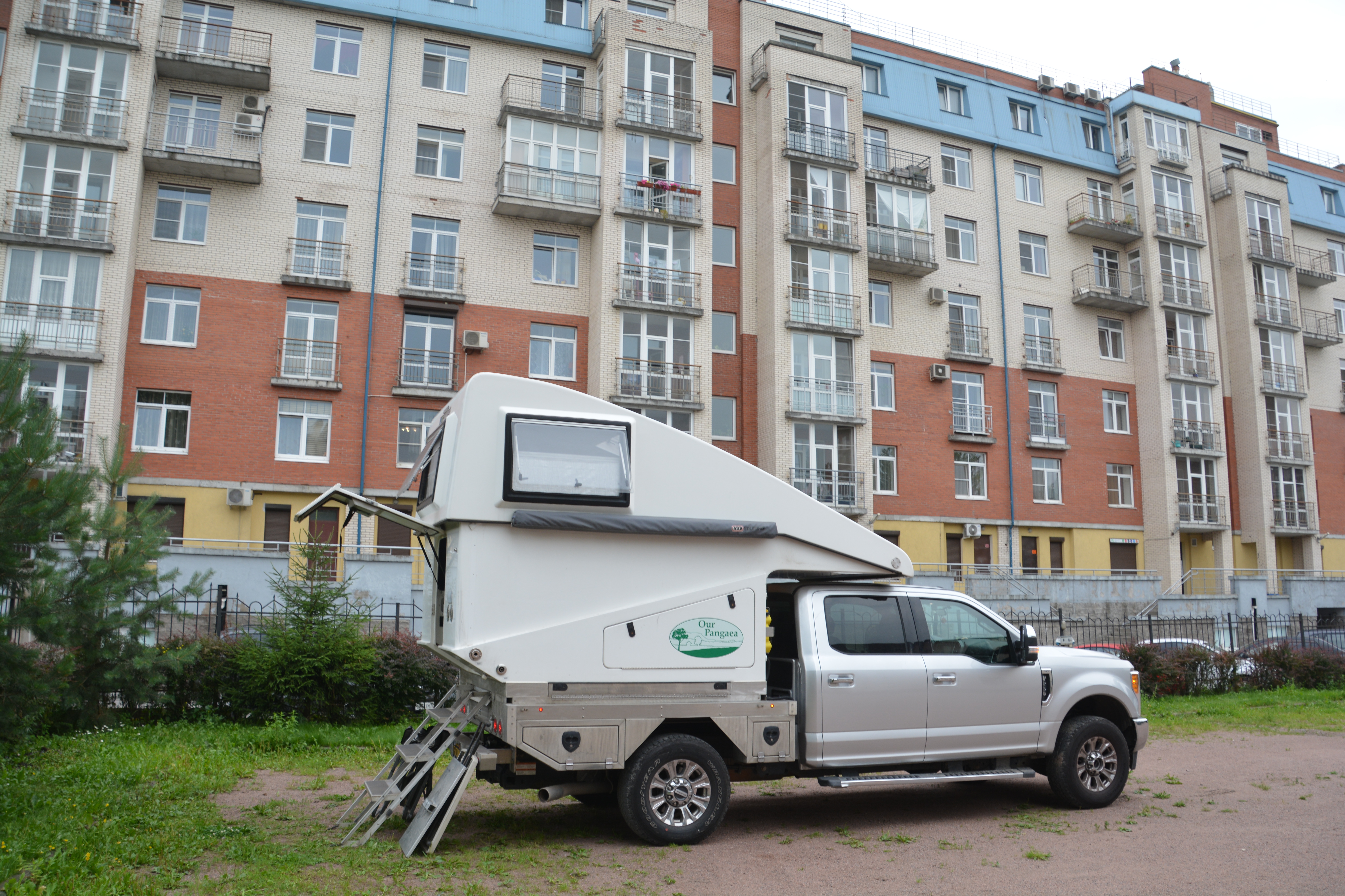 Tramp’s first camping spot in Russia, the grounds of a hotel with sad looking apartment buildings all around