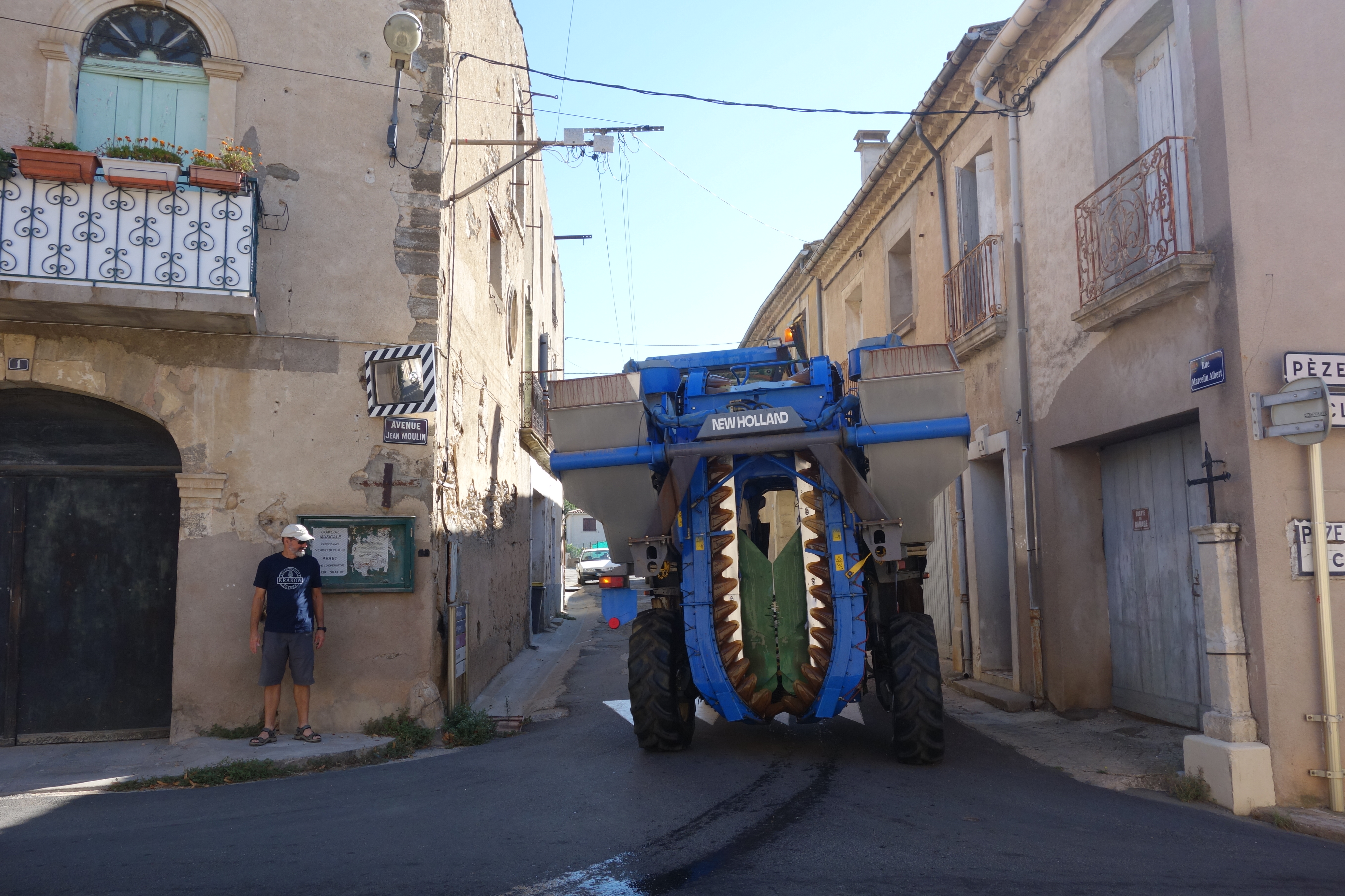 They didn’t have this in our time…a large grape harvester drives through the narrow streets of Adissan