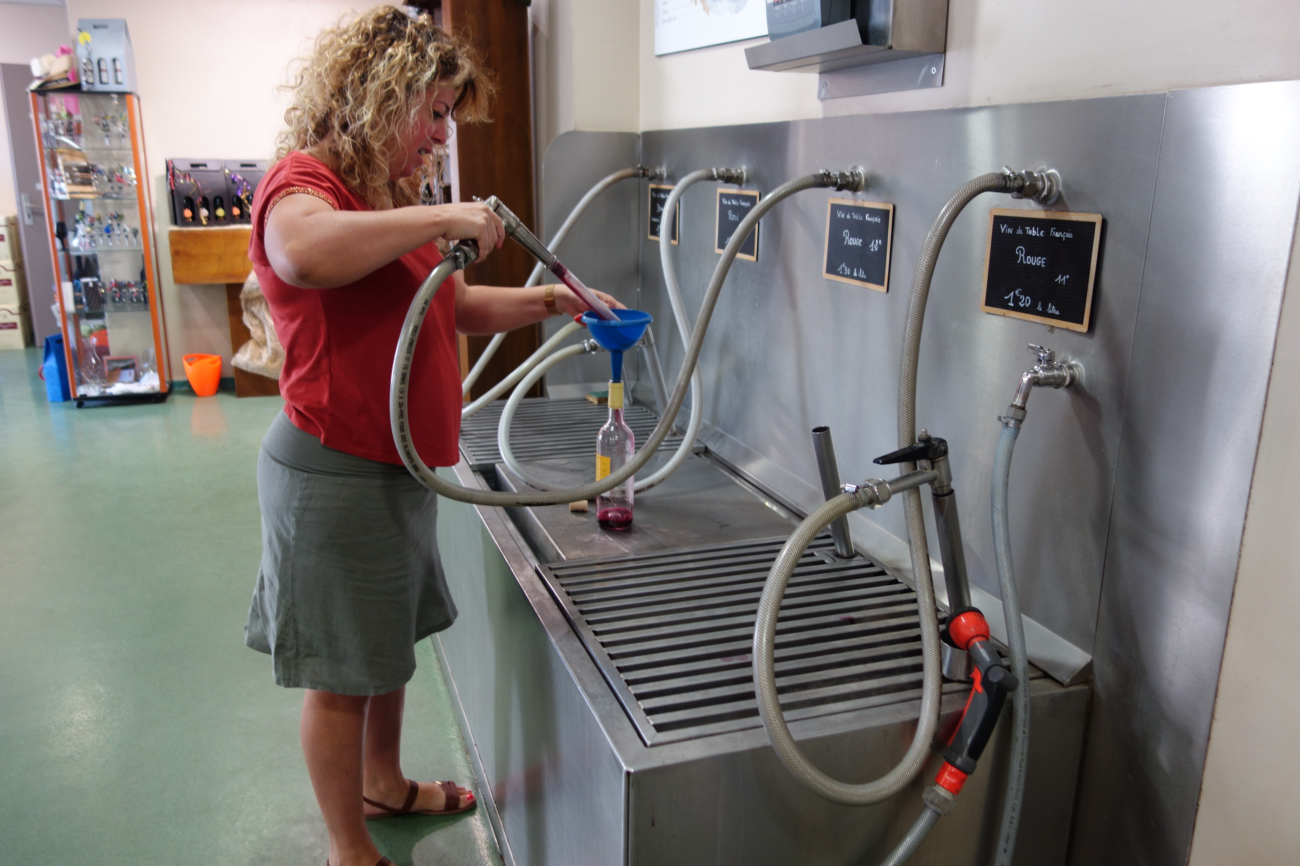 When in Adissan you buy wine from the local wine coop. In addition to a couple of branded bottles we also bought a bottle of coop wine which the friendly lady sprayed into a spare bottle she lent us. Cost = 1 euro.