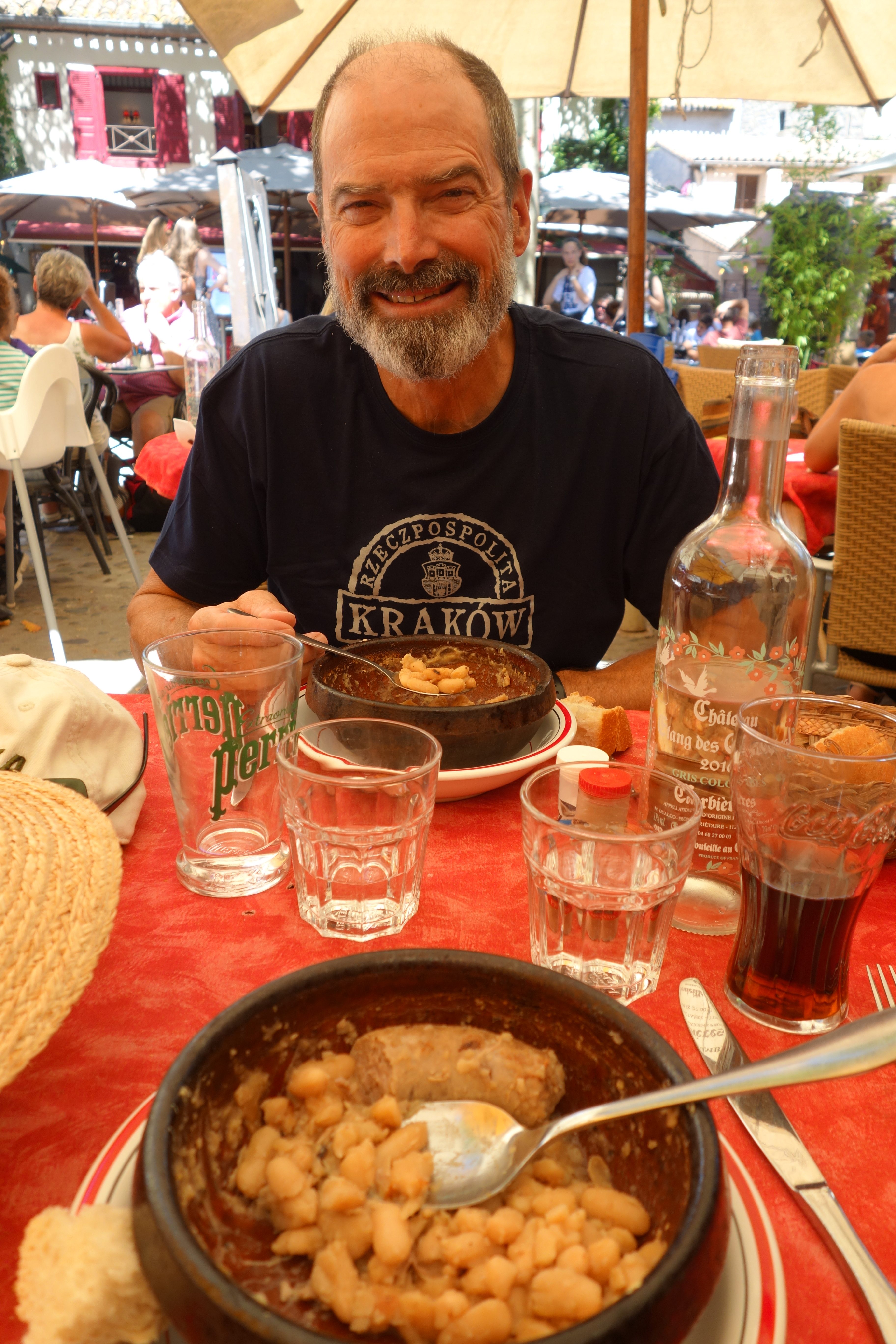We had a fun afternoon doing exactly what everyone else was doing, including having lunch in an outdoor café and enjoying the local specialty, a cassoulet. The traditional cassoulet is a bowl of pork and beans baked to a solid yummy mass and served hot. Carcassonne scores top points.