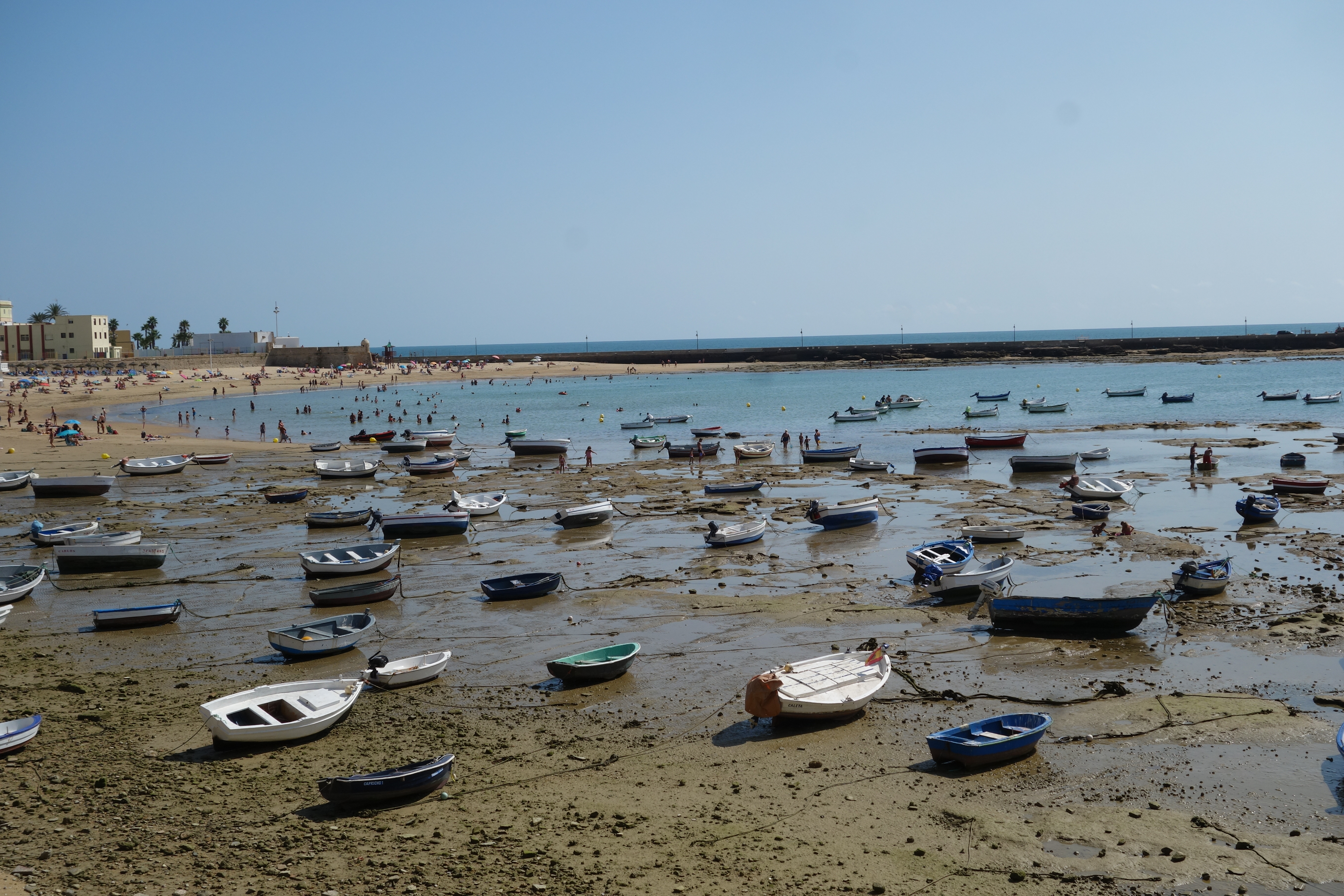 Low tide in Cadiz doesn’t bother all the local fishing boats or the hordes of sunseekers on the beach