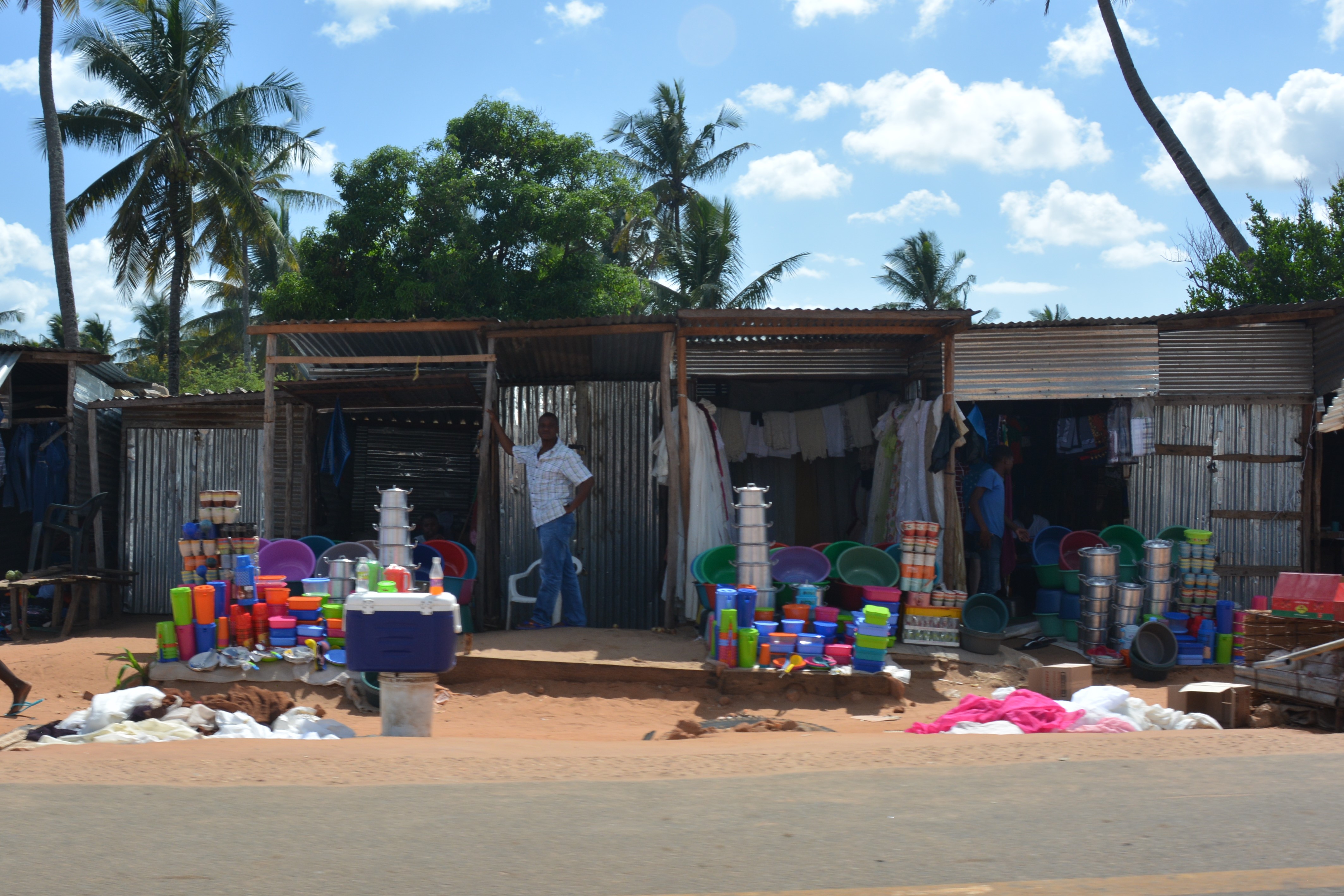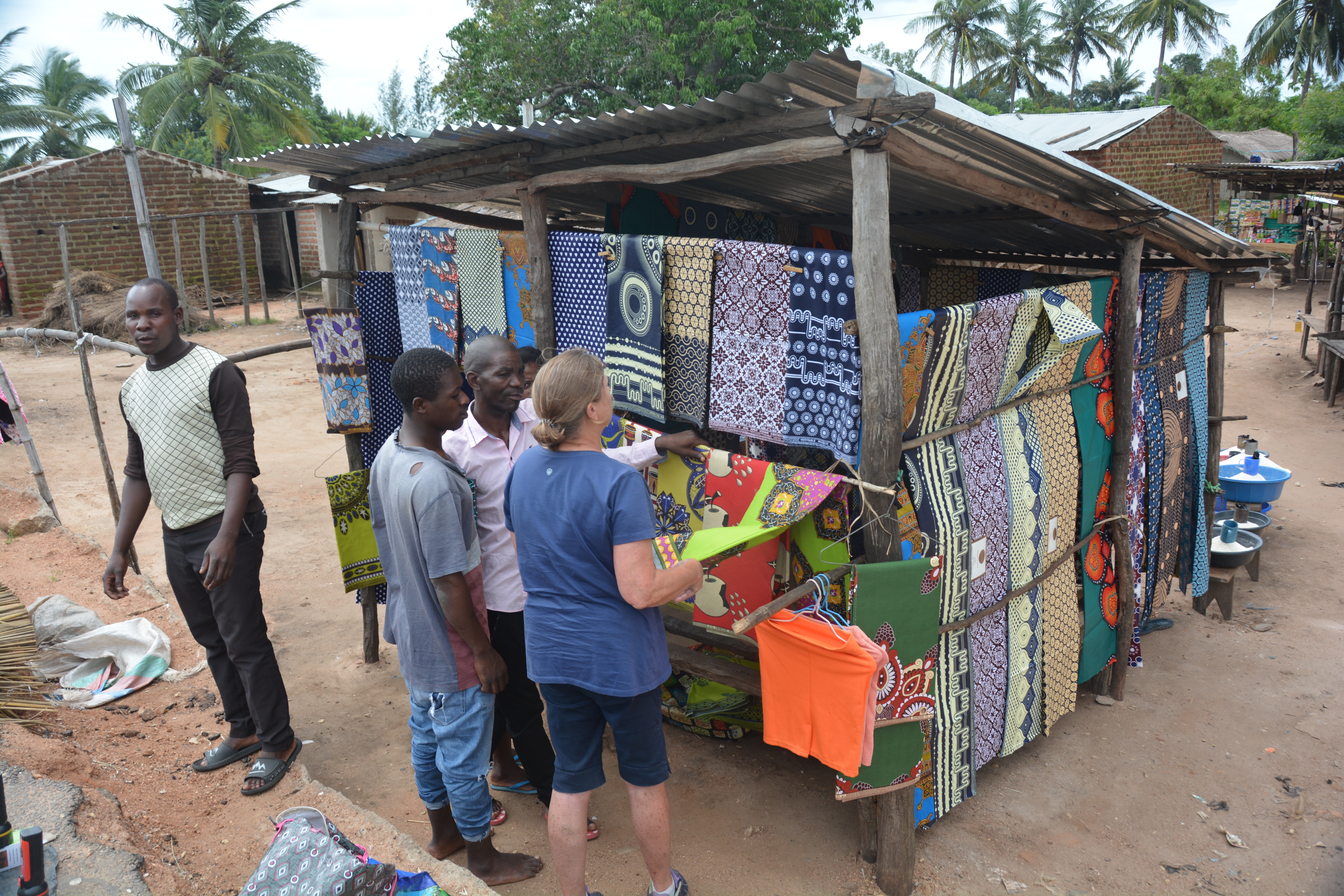Julie is casting her keen eye across some beautiful sarongs in a typical roadside stall in central Mozambique